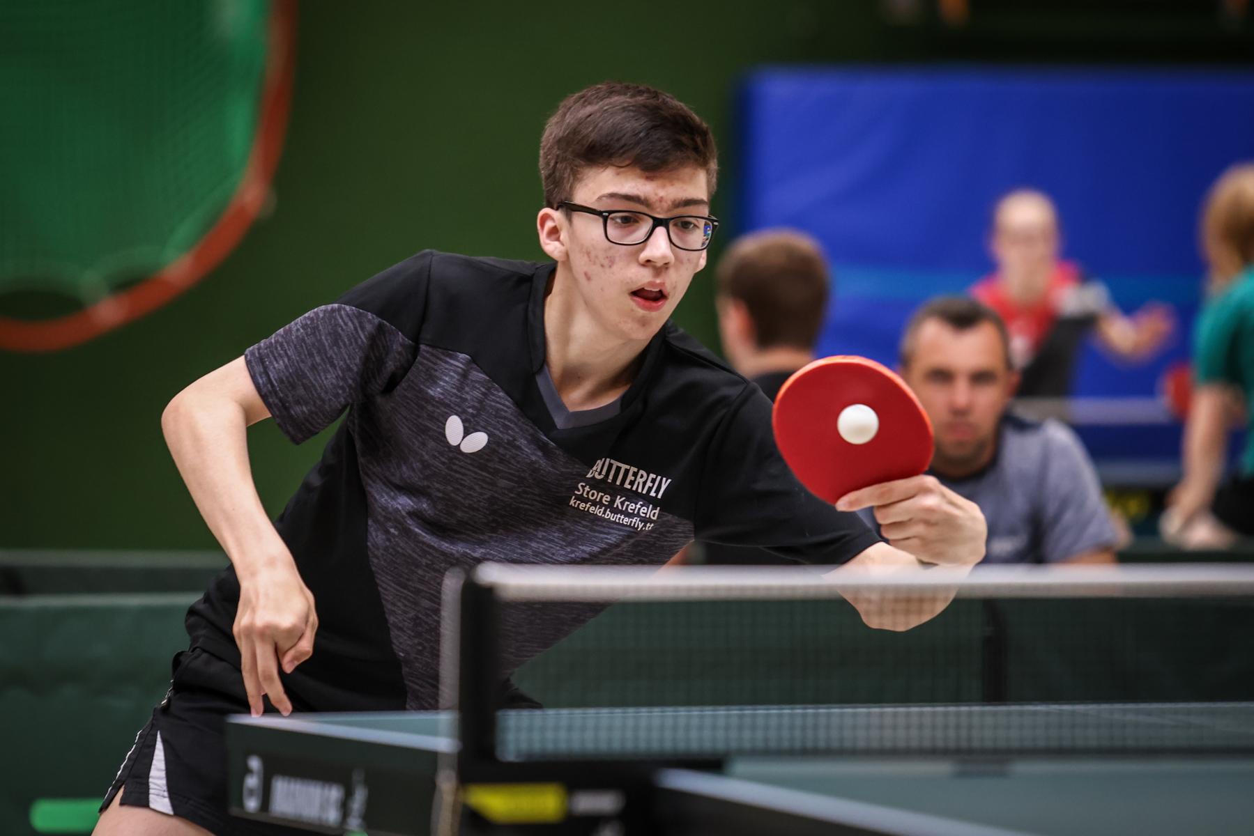Bei den Jungen wurden zunächst acht 4er Gruppen gespielt, dabei qualifizierten sich die ersten zwei für das KO-Feld der oberen Hälfte, die Gruppendritten und -vierten spielten die Plätze 17-30 aus. Als einziger Abwehrspieler sicherte sich Paul Burkart (DJK Roland Rauxel) den Turniersieg. Im Finale setzte er sich gegen seinen ehemaligen Teamkollegen Marvin Lohsträter (TuS Holzen Sommerberg) in 4 Sätzen durch. Dabei begann das Turnier für Paul nicht so wie erhofft, denn er musste in der Gruppe zunächst eine 3:0 Niederlage gegen Timo Thönnissen (TTC Lövenich) hinnehmen.