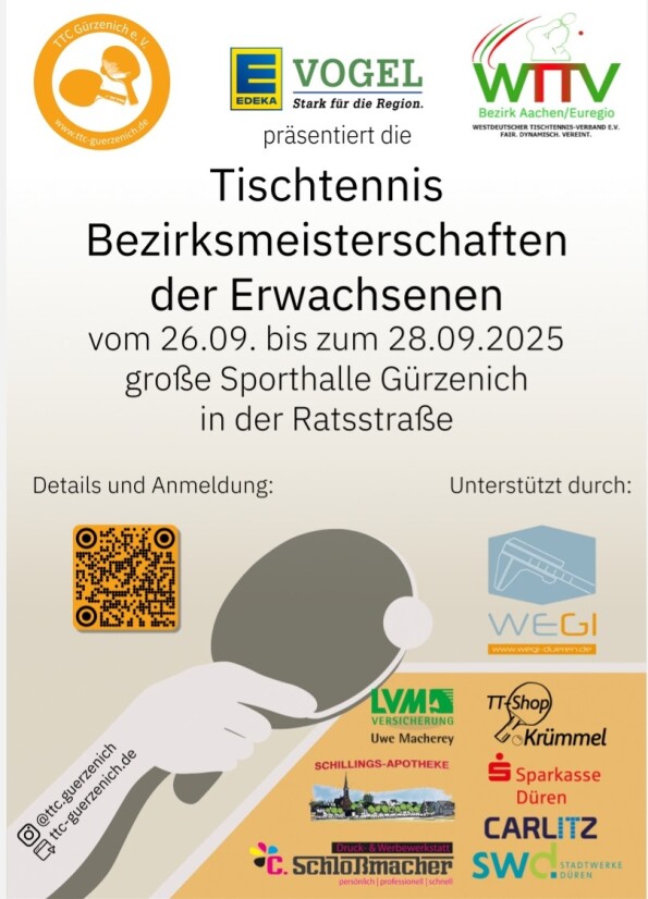 Bezirksmeisterschaften Erwachsene 26.09 bis 28.09.25 in Düren-Gürzenich von Denis Krahe | 11. Sep. 2025 | Neu-Bezirk-Aachen/Euregio, Neu-Bezirk-Aachen/Euregio - ERWACHSENENSPORT, Neu-Bezirk-Aachen/Euregio - REGIONAL-/BEZIRKSMEISTERSCHAFT, Neu-Bezirk-Aachen/Euregio – STARTSEITE, Neu-Bezirk-Aachen/Euregio – TERMINE teilen teilen Anbei das Plakat der Bezirksmeisterschaften der Erwachsene. Anmeldungen über Click-tt/mytischtennis.