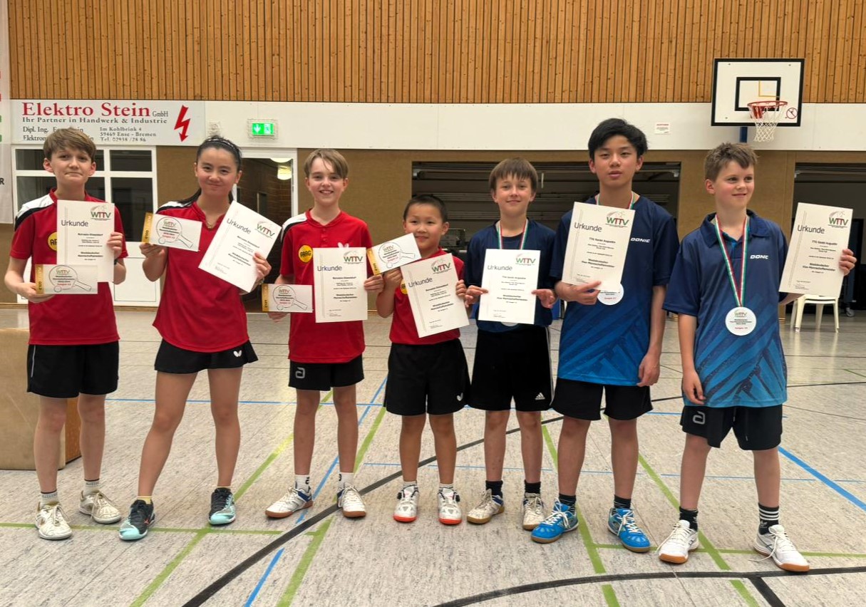 Das Jungen-Team, mit Matthias Jax, Elias Plötzke und Luka He wurde mit Emma Li komplettiert, gewann in der Vorrunde souverän gegen Franz-Sales-Haus Essen mit 4:0 und 4:1 gegen TSVE Bielefeld und traf im Finale auf die TTG St. Augustin (mit Max Mathes, Thanh Binh Nguyen und Moritz Faß), die ebenfalls durch zwei sichere Siege gegen Salzkotten und Nievenheim ins Endspiel einzogen. Die Borussia konnte sich am Ende mit 4:1 durchsetzen, aber das Ergebnis scheint deutlicher als der Spielverlauf, denn direkt das erste Spiel zwischen Jax und Nguyen ging mit 3:1 an Augustin. Und auch Plötzke lag im zweiten Einzel gegen Mathes bereits mit 0:2 in Rückstand, ehe er das Spiel drehte und durch einen 3:2-Sieg für sein Team ausgleichen konnte. Nach einem deutlichen Sieg von Emma Li, musste auch das Doppel Li/Jax über die volle Distanz gehen, ehe der Punkt zum 3:1-Zwischenstand eingefahren wurde. Den Siegpunkt holte dann Abwehrspieler Matthias Jax durch einen deutlichen 3:0-Erfolg gegen Mathes.