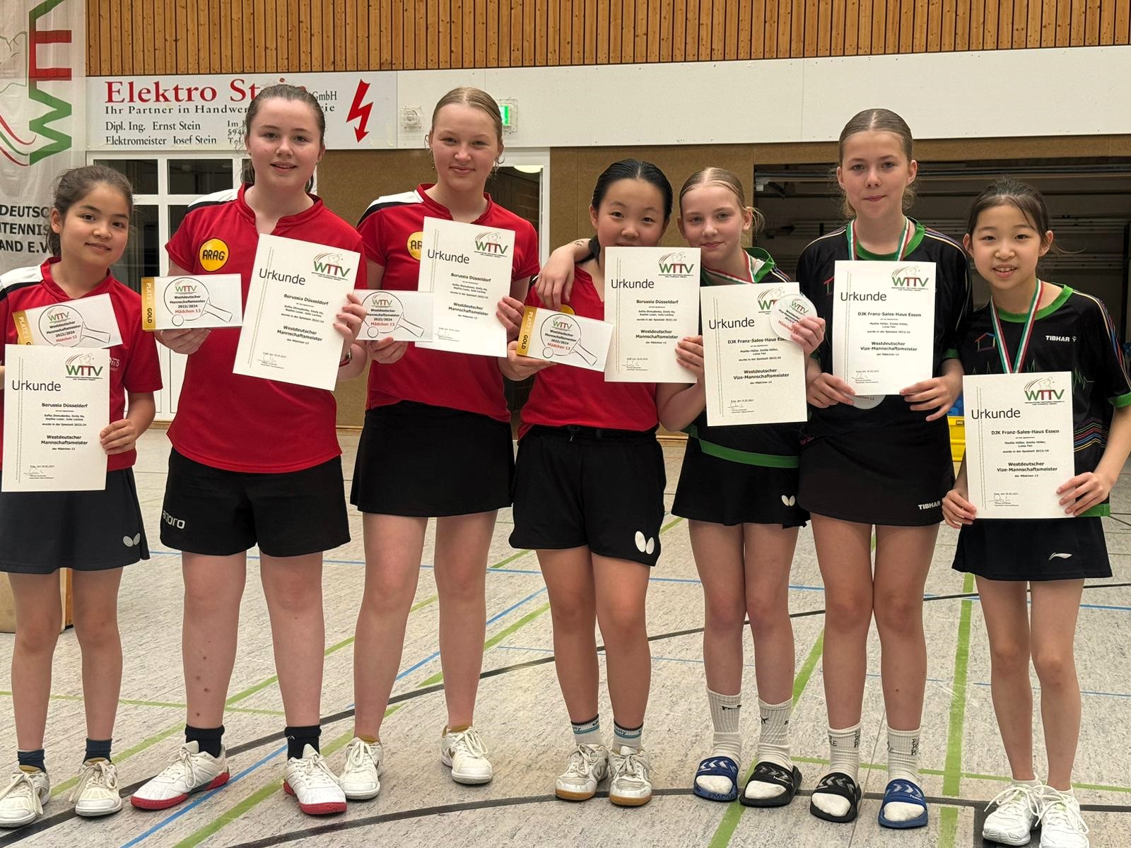 Bei den Mädchen kamen für Düsseldorf Emily He, Sofia Zhmudenko, Sophia Luzar und Julie Lochey zum Einsatz. Die vier Mädchen ließen sowohl Fredeburg, als auch Troisdorf in der Vorrunde keine Chancen und zogen ungefährdet ins Finale ein. Ihre Gegnerinnen dort kamen aus Essen, von der DJK Franz-Sales-Haus, die sich ebenfalls ohne größere Probleme gegen Bielefeld und Neuss durchsetzen. Madita und Emilia Höller sowie Luisa-Jiayi Fan versuchten alles, um den Düsseldorferinnen den Titel streitig zu machen, mussten aber nach knapp zwei Stunden die Überlegenheit der Borussia-Mädchen anerkennen und nach der 1:4-Niederlagen zum Sieg gratulieren.