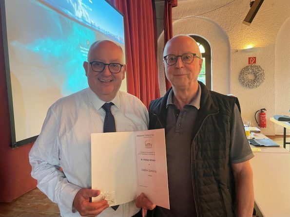 Vor der Wahl des (neuen) Bezirksvorsitzenden übernahm Kristian Schneider noch einmal das Mikrofon und bedankte sich für die Zusammenarbeit in den letzten drei Jahren im neuen Bezirk Niederrhein wie auch zuvor schon im alten Kreis Krefeld. Kristian erklärte, dass er zukünftig nicht mehr im niederrheinischen Bezirksvorstand tätig sein werde – dies aber natürlich mit einem sehr guten Grund: Beim Verbandstag vor einigen Wochen wurde Kristian Schneider zum Vizepräsident Sportpolitik im WTTV gewählt und diese neue Aufgabe wird er nun angehen. Werner Almesberger ehrte Kristian Schneider im Anschluss daran mit der goldenen Spielernadel für über 50-jährige aktive Sportausübung im WTTV und mit der bronzenen Ehrennadel für seine vielfältigen Funktionärstätigkeiten im Verband, Bezirk, Kreis und Verein.