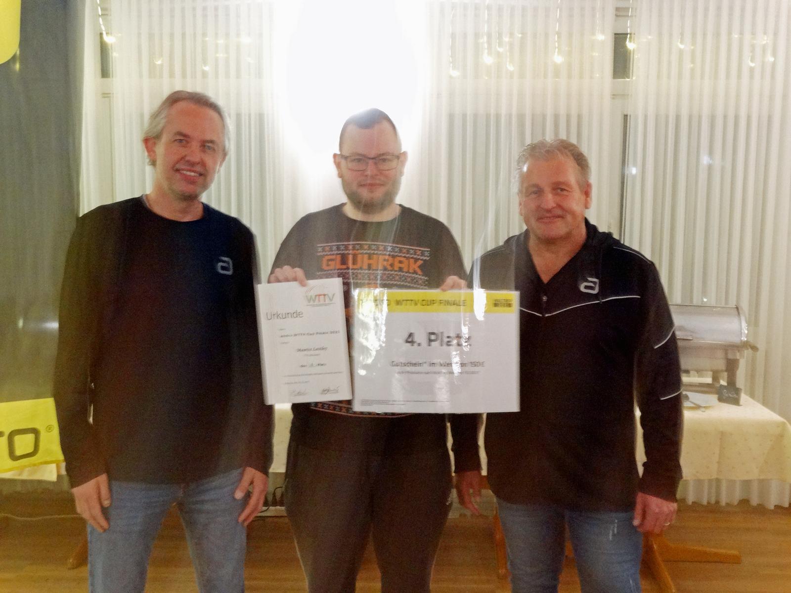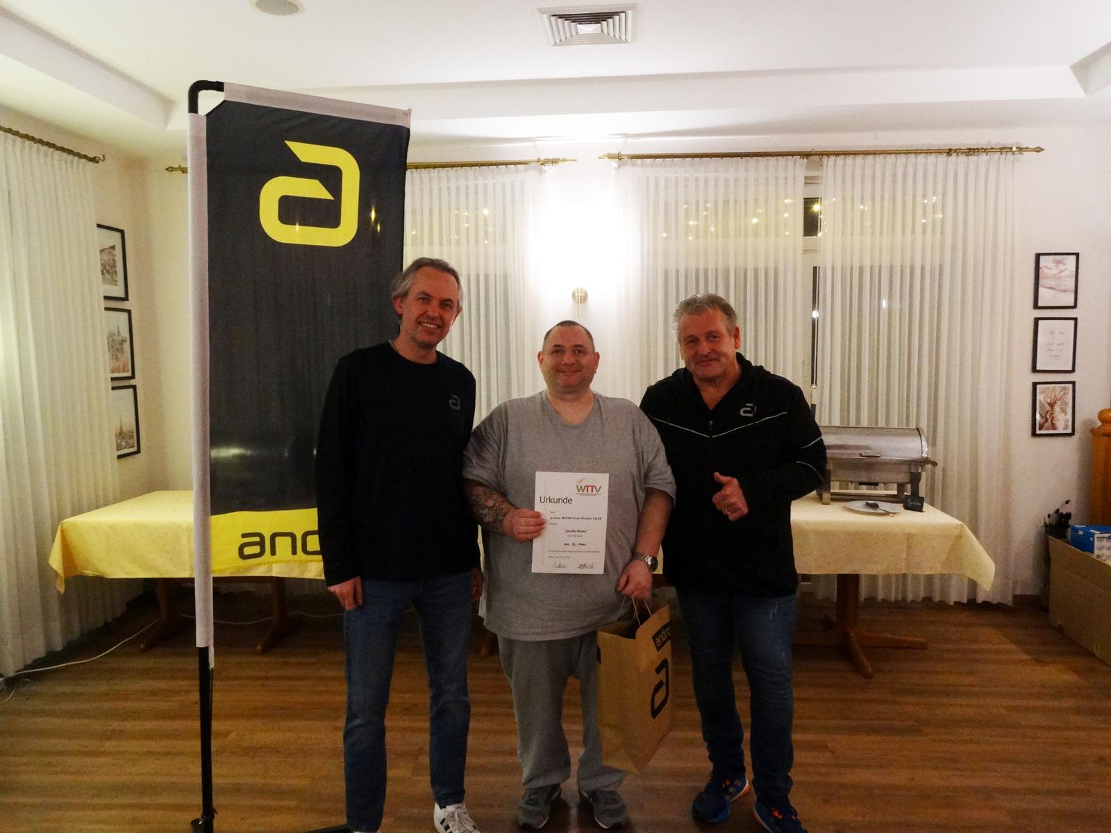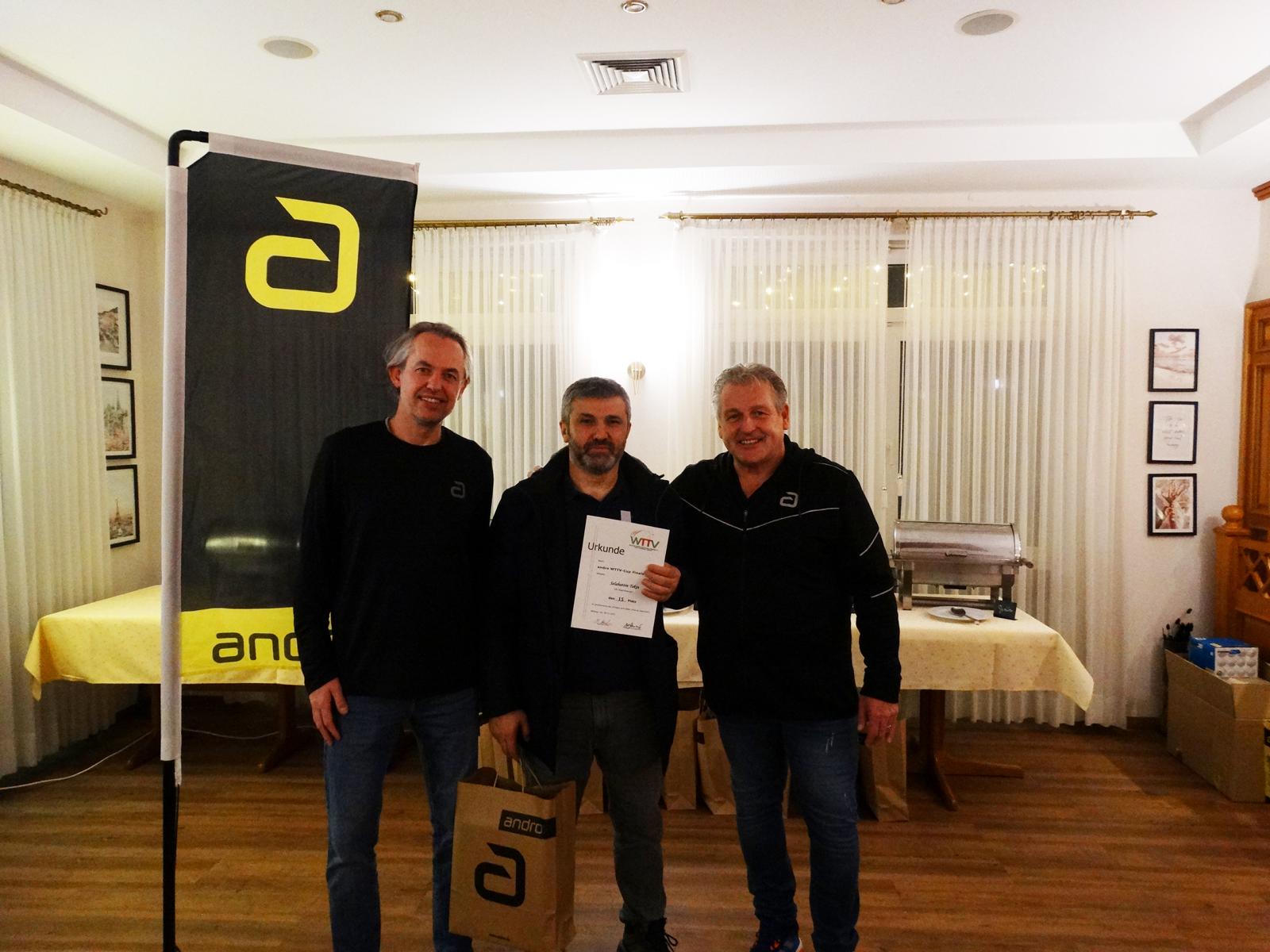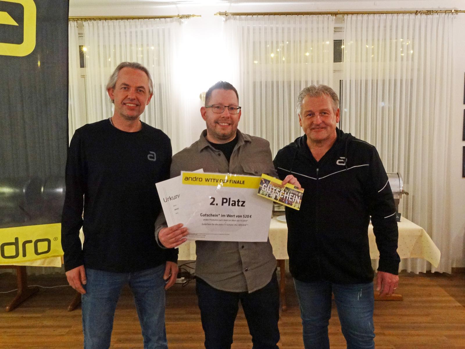 Am Abend fand im „Hotel am Park“ die feierliche Preisverleihung statt. Dort nahm Dennis Schwarz aus den Händen von David Daus und Rainer Schmidt von der Firma andro seinen verdienten Siegerpreis entgegen: einen Gutschein für die andro TT-Schule und einen großzügigen Warengutschein.