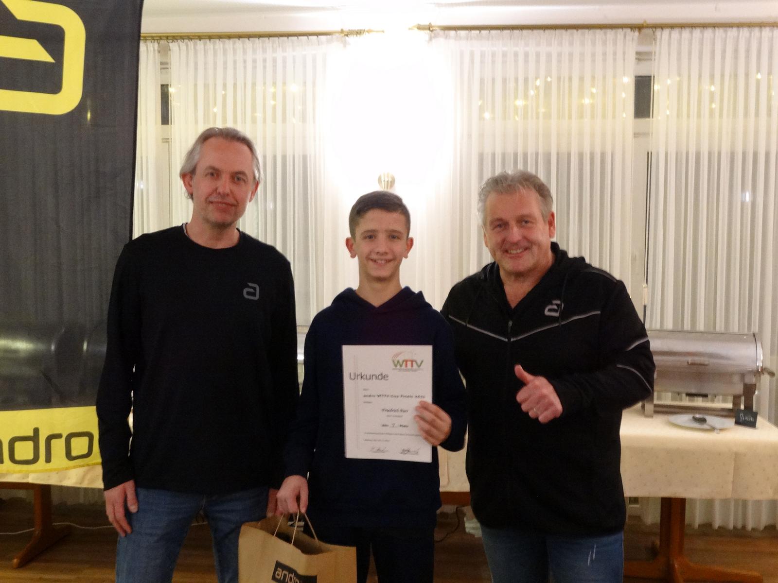 Für einen weiteren Rekord sorgten an diesem Tag zwei junge Talente: Die Zwillinge Friedrich und Ludwig Parr vom ESV Troisdorf waren die jüngsten Teilnehmenden, die je beim Finale des andro WTTV-Cups an die Tische gingen. Sie feiern am kommenden Freitag ihren 14. Geburtstag, haben erst vor drei Jahren mit Tischtennis begonnen und stehen derzeit bei 1.379 (Ludwig) und 1.460 (Friedrich) TTR-Punkten, was sicher ebenfalls auch den zahlreichen-Cup-Teilnahmen zu Grunde liegt: Die Plätze 5 und 7 waren der verdiente Lohn ihrer Bemühungen.