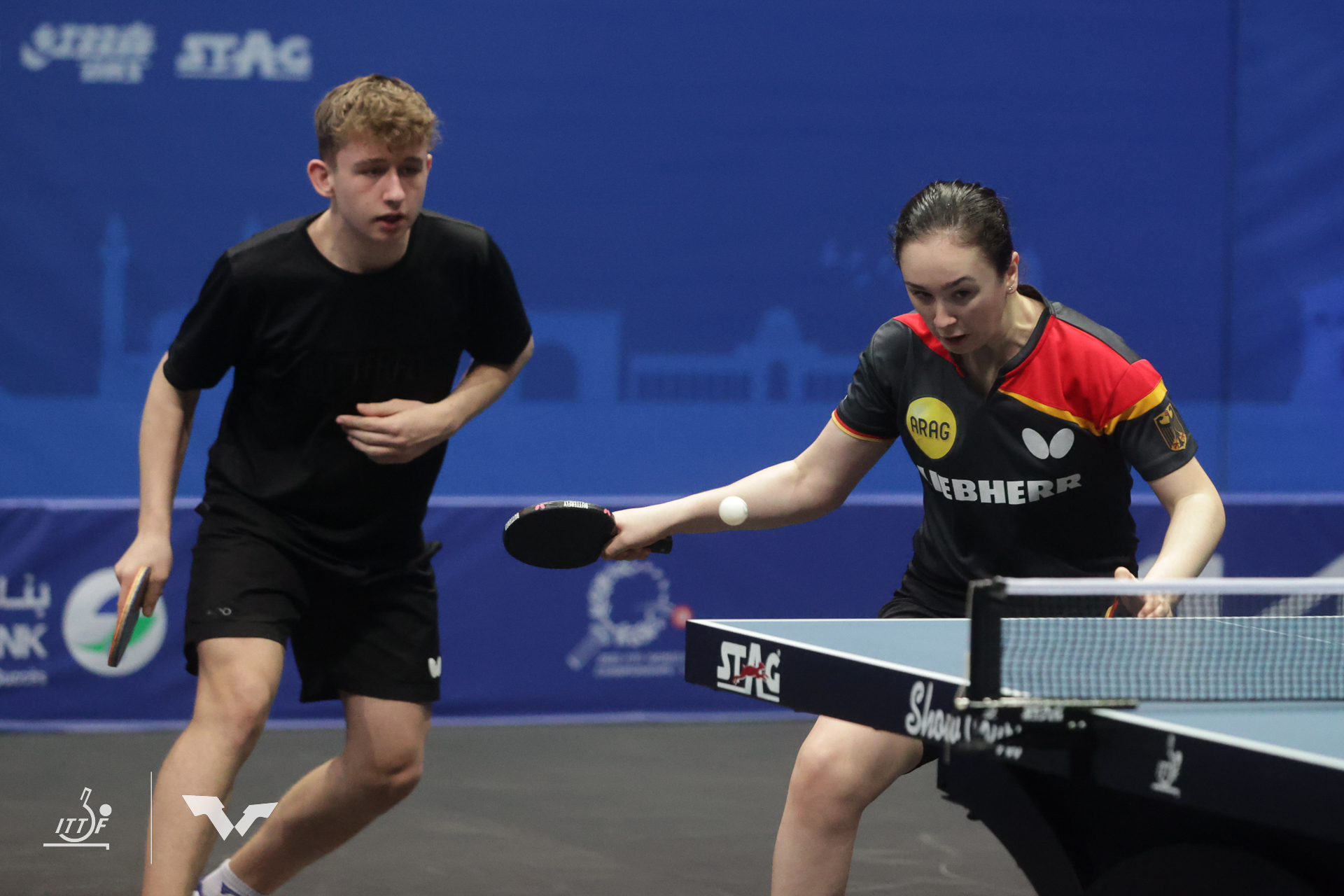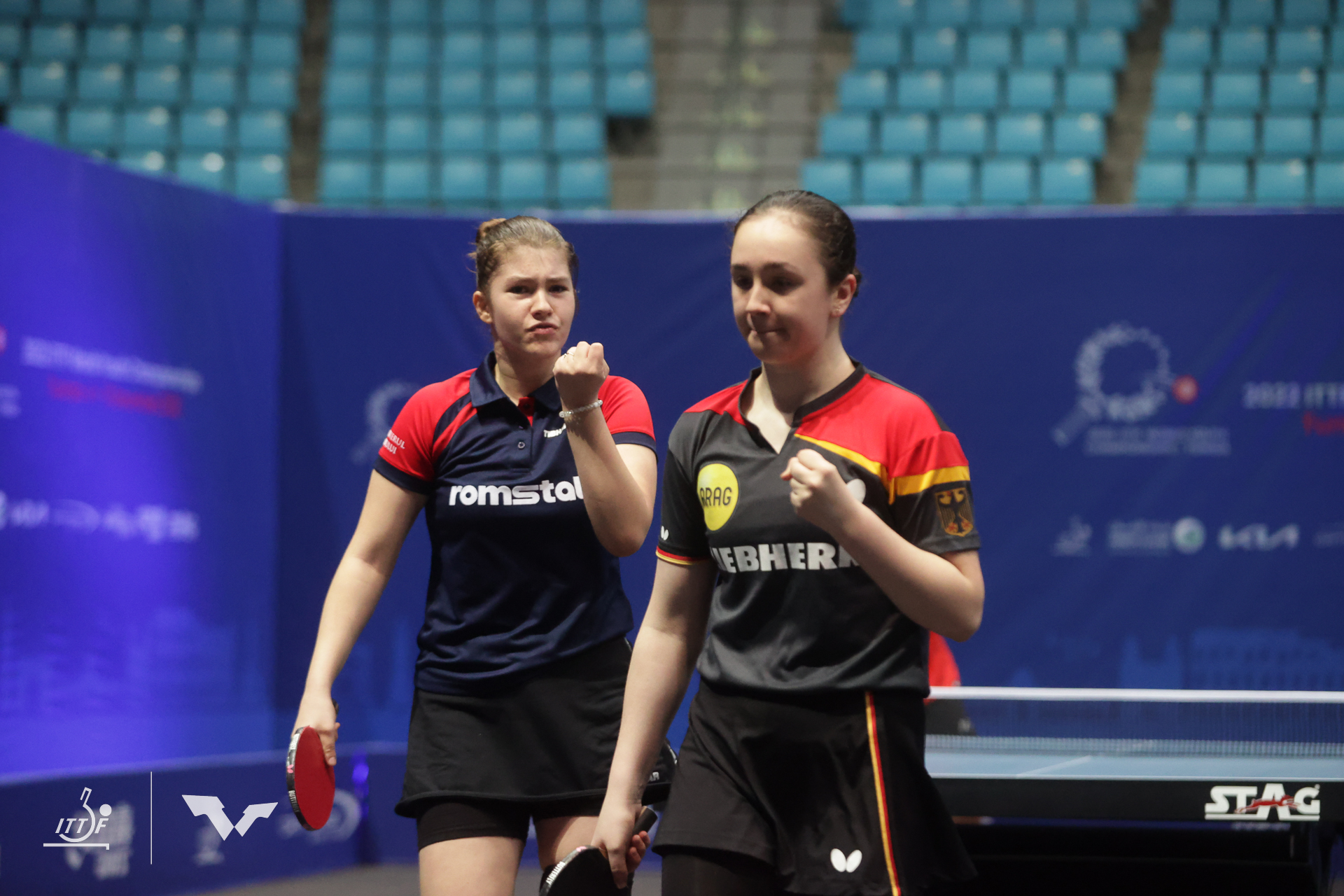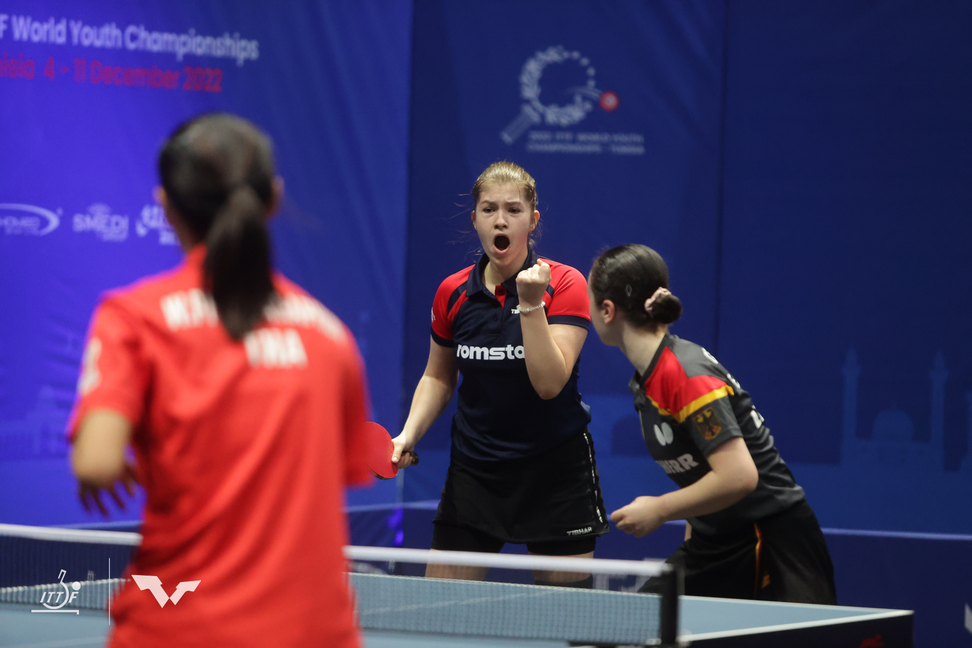 WM-Debütintin Eireen Kalaitzidou als erste des DTTB-Trios Edelmetall für den Deutschen Tischtennis-Bund in Tunis gewonnen. Mit einem 11:3, 11:6, 11:13 und 11:8-Viertelfinalerfolg setzte sich die Düsseldorferin zusammen mit ihrer rumänischen Partnerin Alesia Sferlea im U15-Doppel-Viertelfinale gegen die sehr unorthox zwischen aktivem Spiel und Defensive wechselnde ägyptisch-thailändische Kombination mit Habiba Elbasoumy und Materialspielerin Phatsaraphon Wonglakhon durch, die im Achtelfinale vollkommen überraschend die an Position eins gesetzte Medaillenanwärterin Hana Goda (Ägypten) und deren indische Partnerin Yashaswini Ghorpade aus dem Turnier geworfen hatte.