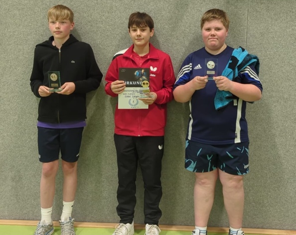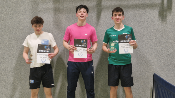 Abgeschlossen wurde die Veranstaltung mit der Jungen15-Konkurrenz. Hier setzte sich beeindruckend klar John Eumann (TTV Hervest Dorsten) durch, der im gesamten Turnierverlauf ohne Niederlage blieb und dabei nur 2 Sätze abgab. Dahinter folgten Finn Wening (TuS Stenern) und Vincent Wiegel (TuB Bocholt).