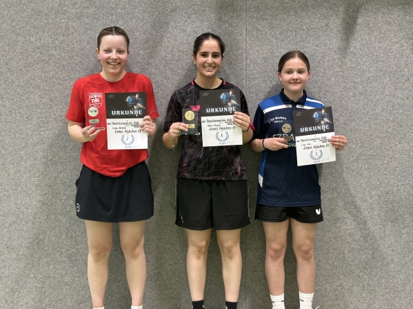 Auch die Mädchen19-Konkurrenz bekam das 12er-Teilnehmerfeld nicht voll und agierte mithin im Modus Jede gegen Jede. Auch hier setzte sich die Favoritin Sahra Osmani (TuS Haltern) ohne Niederlage vor Emma Verbeet (Germania Lenkerbeck) und Lina Lotz (TTV Weseke) durch.