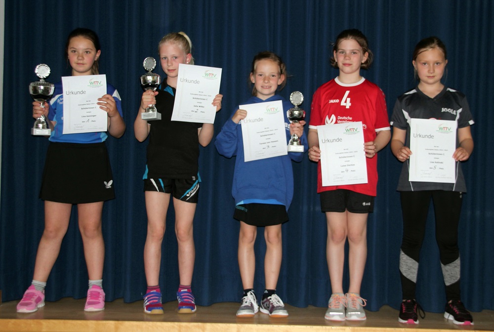 - alle TN Schülerinnen C: v.l.: Lina Geminger (1. Platz), Jalia Wilke (2. Platz), Teresa von Heesen (3. Platz), Luisa Dierkes (4. Platz), Lisa Kalinski (5. Platz) – Foto: I.Müller