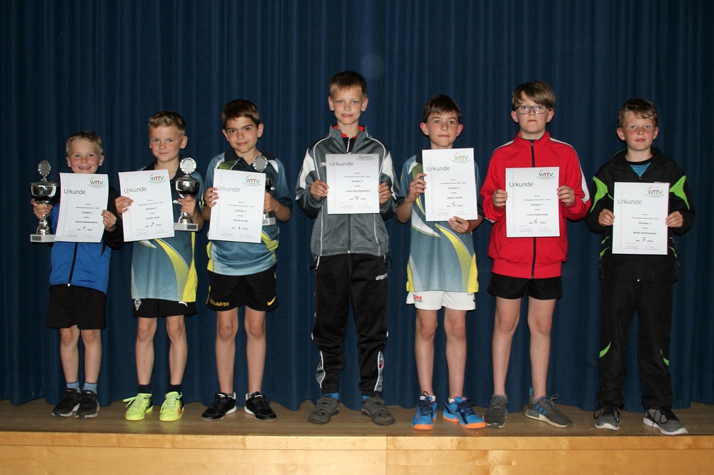 - alle TN Schüler C: v.l.: Jonas Schelesnikow (1. Platz), Jonah Grell (2. Platz), Jonas Arndt (3. Platz), Julius Brockgreitens (4. Platz), Simon Arndt (5. Platz), Luca Pittkunnings (6. Platz), Noah Oeynhausen (7. Platz) – Foto: I.Müller