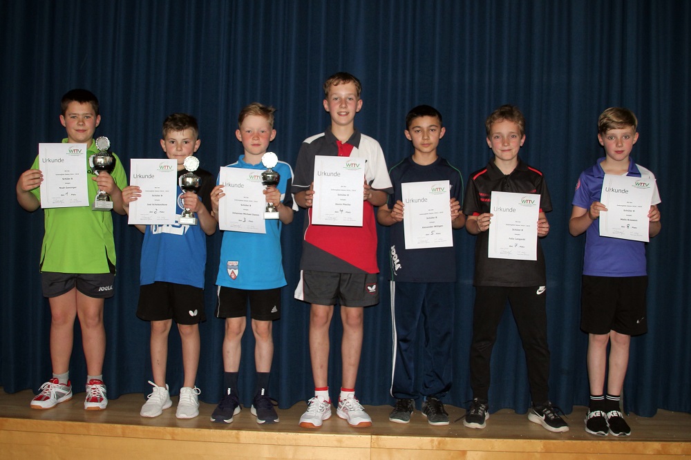 - alle TN Schüler B: v.l.: Noah Geminger (1. Platz), Joel Schelesnikow (2. Platz), Johannes Michael Damm (3. Platz), Kevin Piecha (4. Platz), Alexander Wittgen (5. Platz), Felix Langanki (7. Platz), Mailo Bressem (8. Platz) – Foto: I.Müller