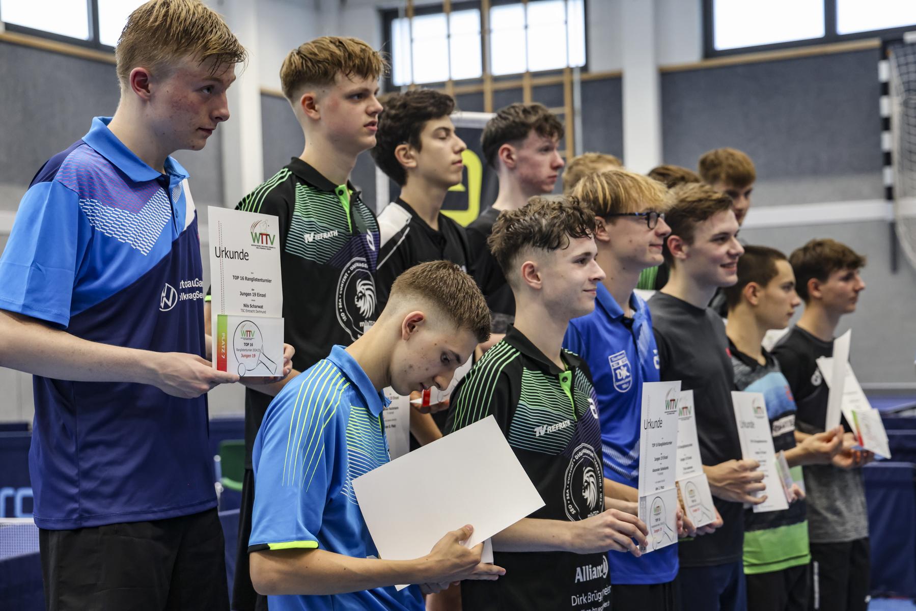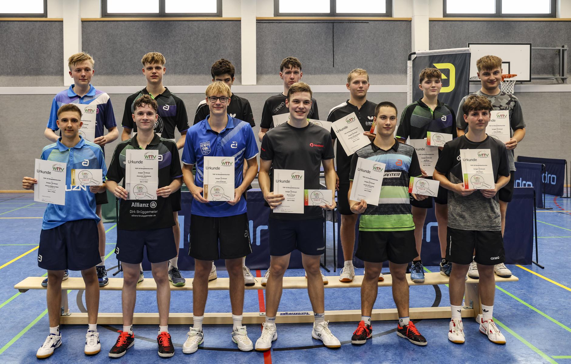 In der Jungen 19-Konkurrenz wurden die Vorrunden in zwei Achtergruppen ausgetragen. Alexander Sahakiants (TV Refrath) und Marius Strahl (TTV Lövenich) sicherten sich in Gruppe A die ersten Plätze, während Johann Mahl (FC Schalke 04) und Chris Andersen (DJK Germania Lenkerbeck) aus Gruppe B weiterkamen.