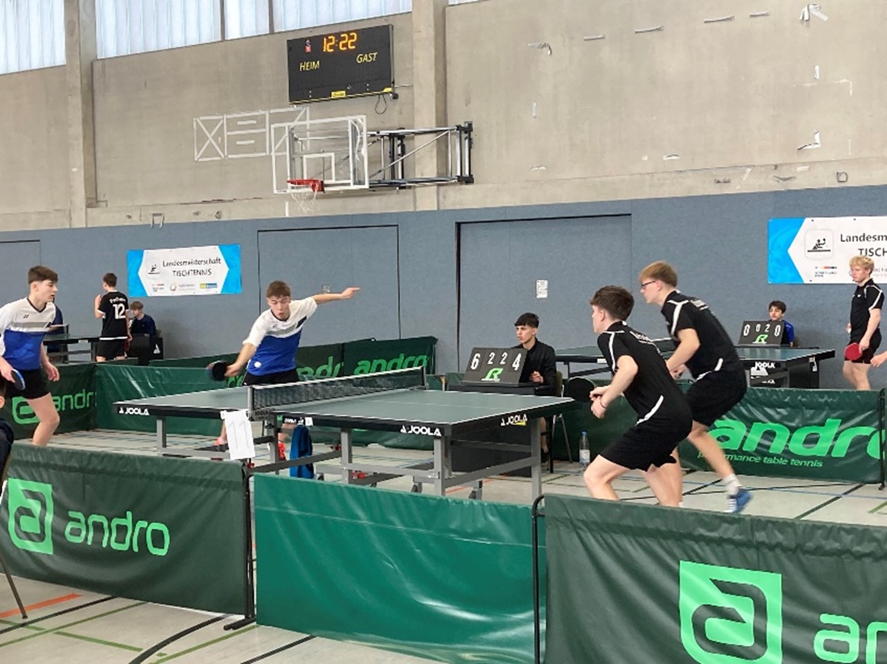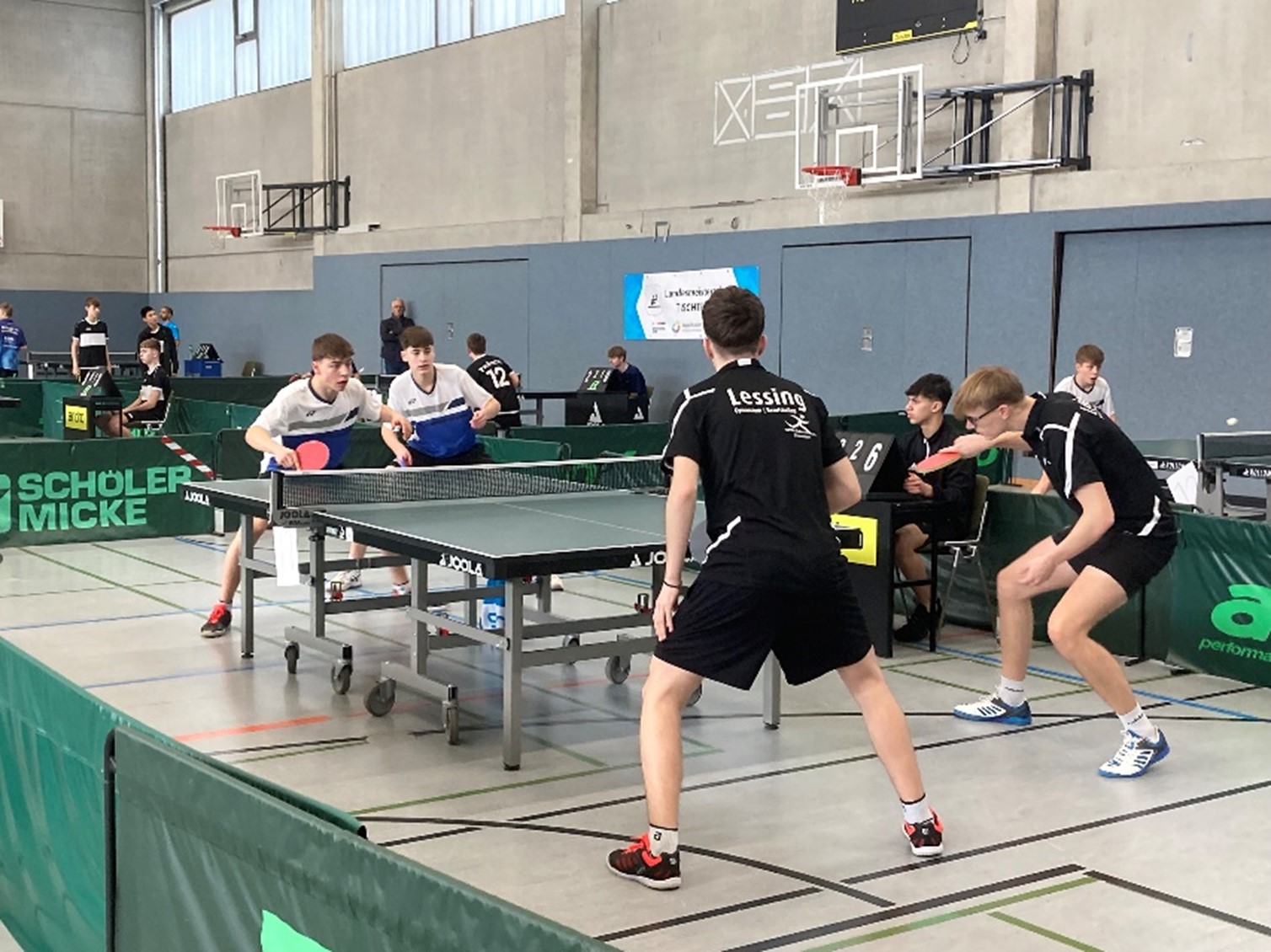 Interessantes Duell mit bekannten Namen und einem knappen Sieg für das Lessing-Gymnasium (6;1;-2;-7;8): Noah HERSEL/Chris ANDERSEN (Lessing-Gymnasium, Düsseldorf) gegen Jamal OUDRISS/Karl TENNIL (Otto-Hahn-Gymnasium, Bergisch-Gladbach).