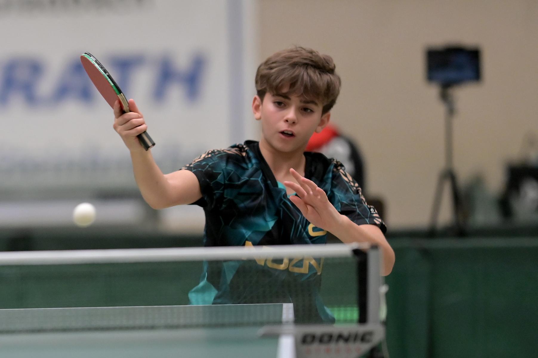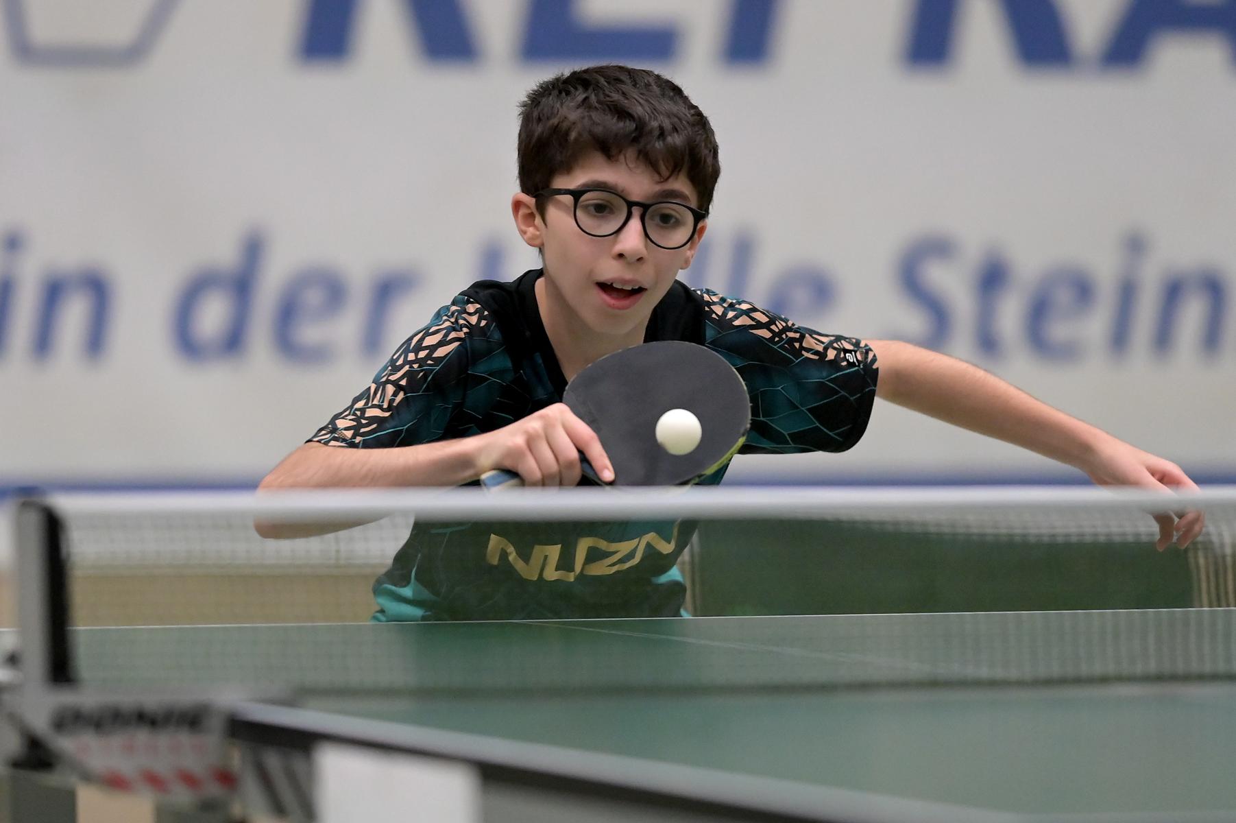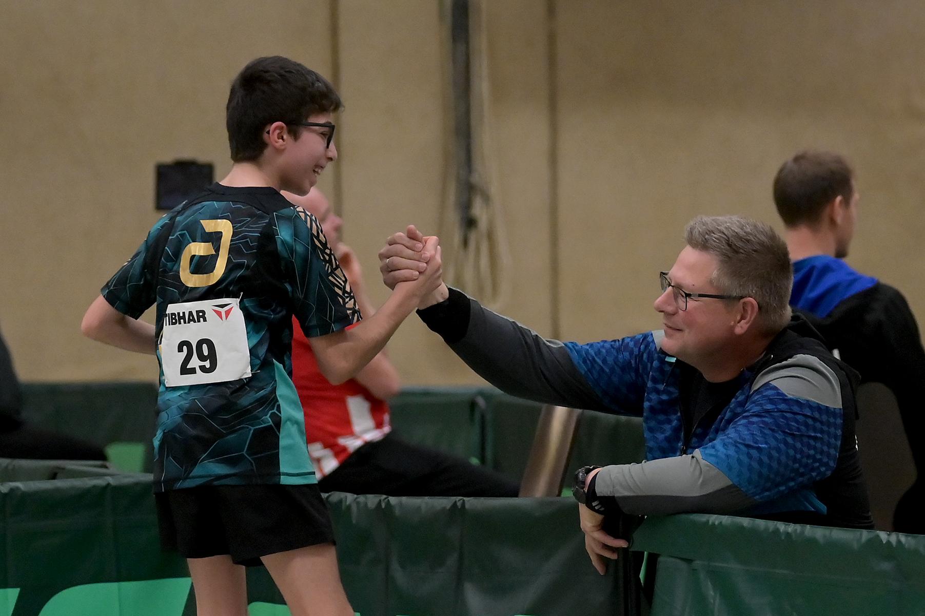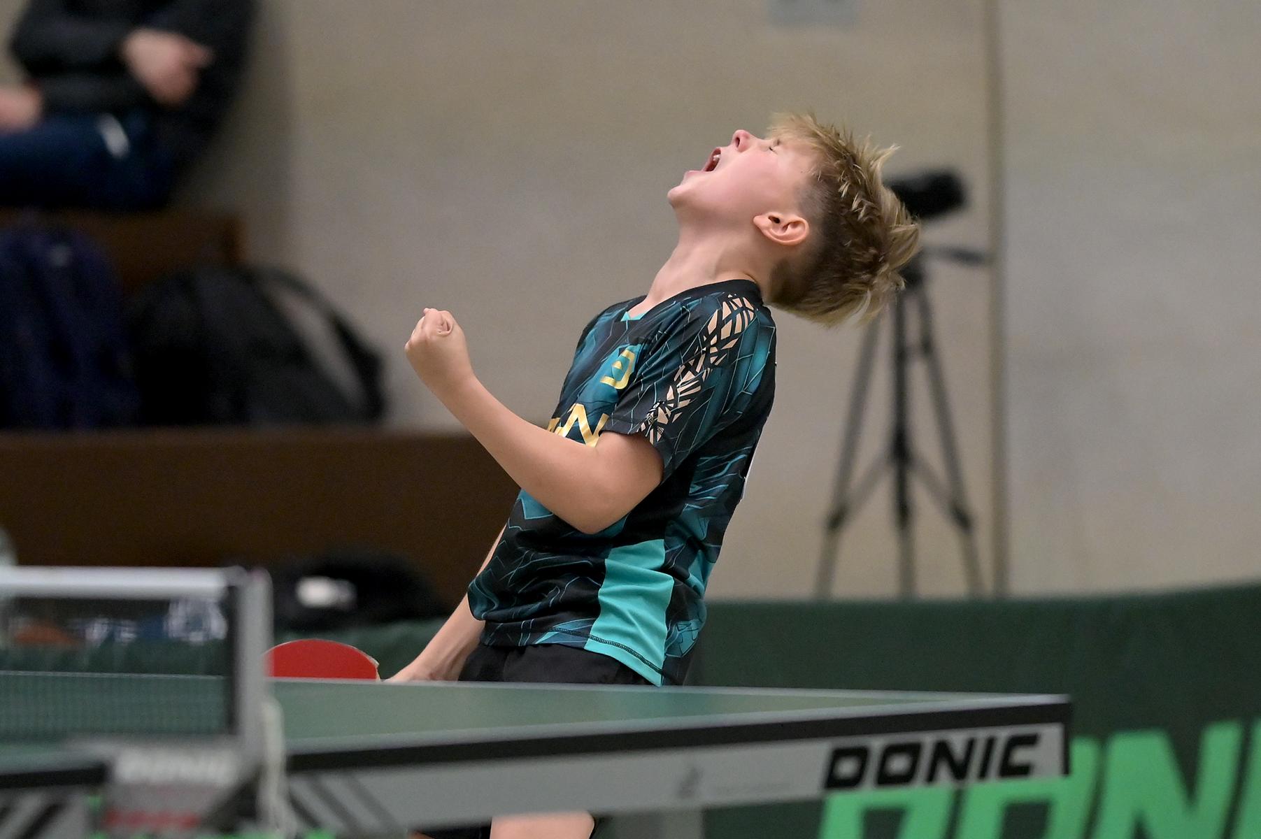 Adam Dahhan spielte eine hervorragende Vorrunde. Er konnte in seiner 8er Gruppe eine 6:1-Bilanz erspielen und sich Gruppenplatz zwei sichern. Die einzige Niederlage war gegen Kiril Manalaki aus Niedersachsen. Während die anderen drei Jungen nur noch den fünften Platz erreichen konnten, hatte Adam noch Chancen auf den Sieg der Veranstaltung. Gegen den Sachsen Koki Püschel im Viertelfinale behielt Adam auch in den knappen Situationen die Nerven und holte sich einen 3:2-Sieg und den Einzug in das Halbfinale. Im Halbfinale wartete mit Paul Flemming der nächste Sachse. Nach einem sehr umkämpften ersten Satz (12:10) kam Adam immer besser mit der Spielweise seines Gegners zurecht und holte sich auch Durchgang zwei und drei. Im Finale ging es dann erneut gegen Kiril Manalaki. Am Vortag hatte Adam noch 2:3 gegen ihn verloren und auch einen Matchball leider nicht verwandeln können. Das wollte er jetzt besser machen und sich revanchieren. Dies gelang Adam auch und er holte sich einen souveränen 3:0-Sieg und den Sieg der Veranstaltung.