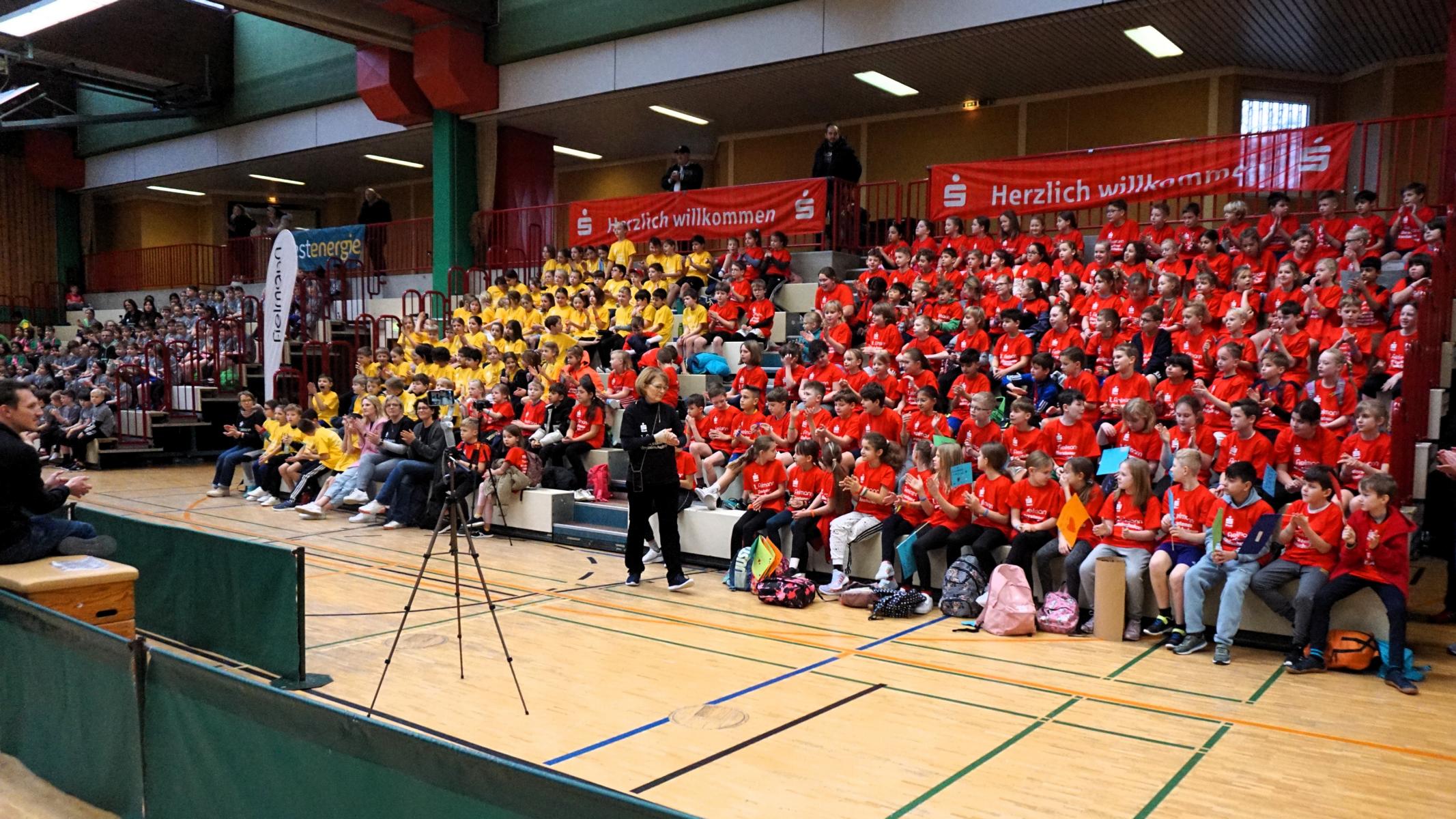 In der Halle angekommen, erhielten die Kinder T-Shirts in den Farben ihrer Schulen – gelb, grau, rot und grün – sowie ein Team-Armband. Die Aufregung war spürbar, als sie gespannt darauf warteten, dass es endlich losging. Nachdem alle Schulen eingetroffen waren, begrüßte der Vereinsvorsitzende Andre Funcke sowie der Vorsitzende des Bezirks Münster/Hohe, Mark Frank Determann, die Kinder herzlich.