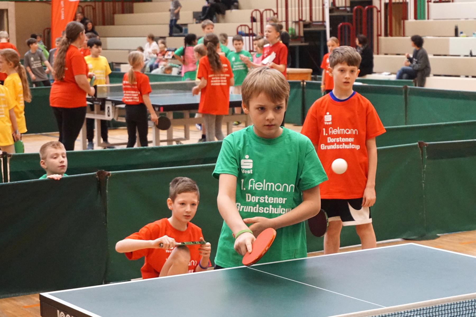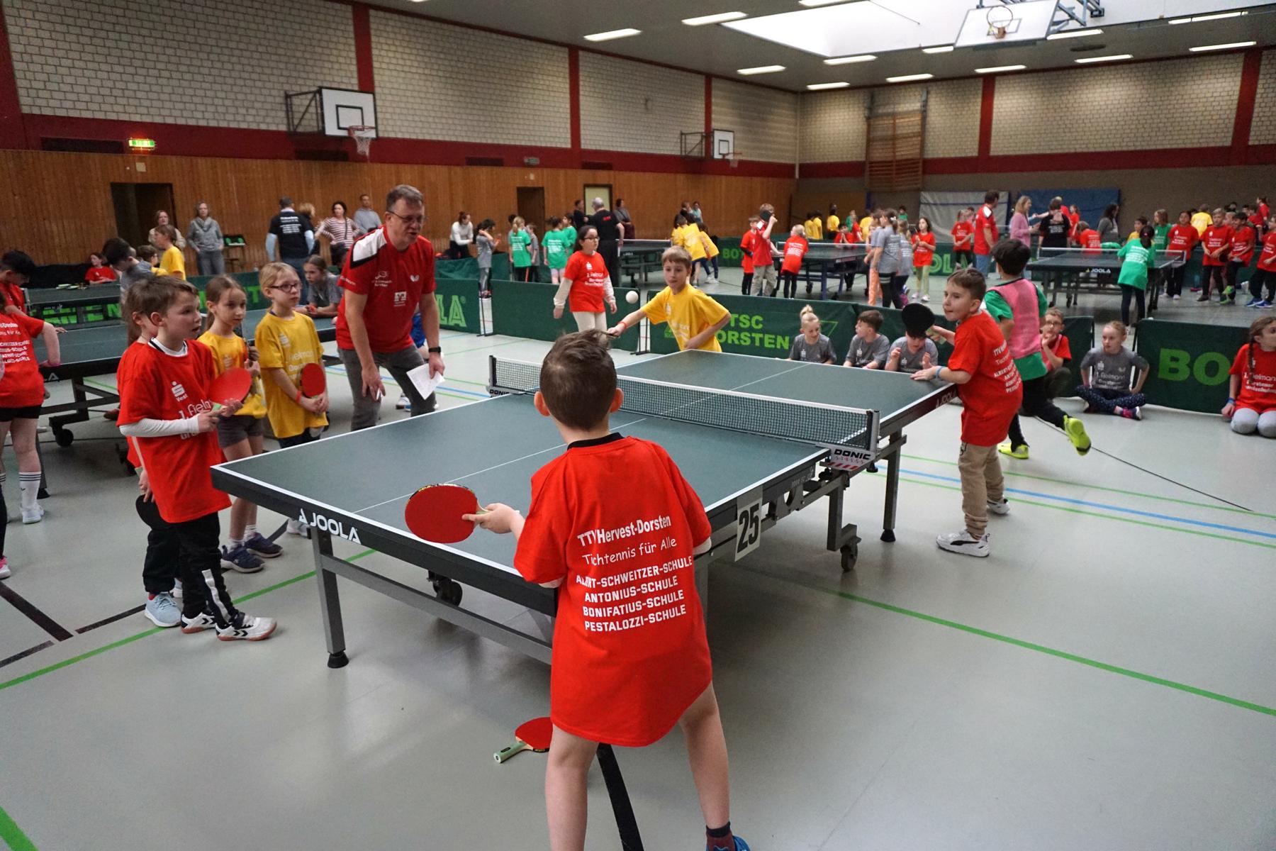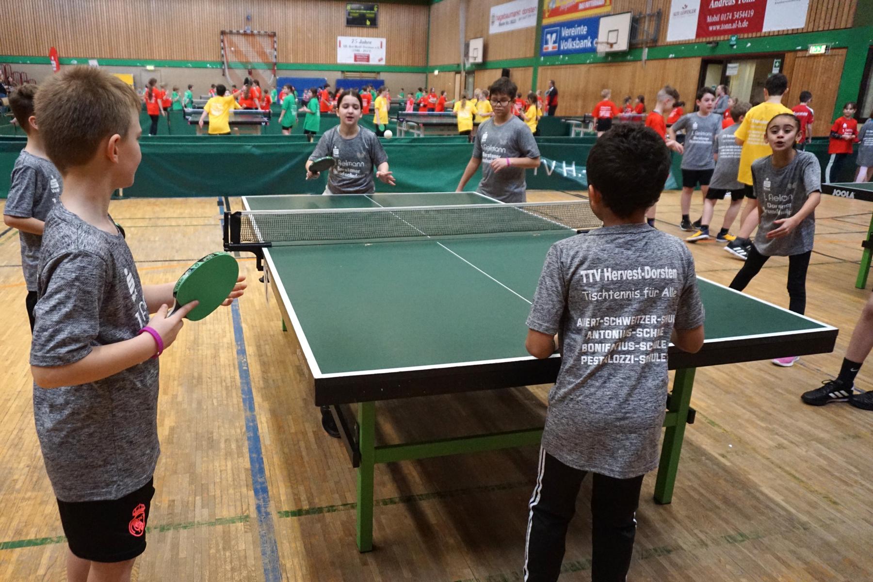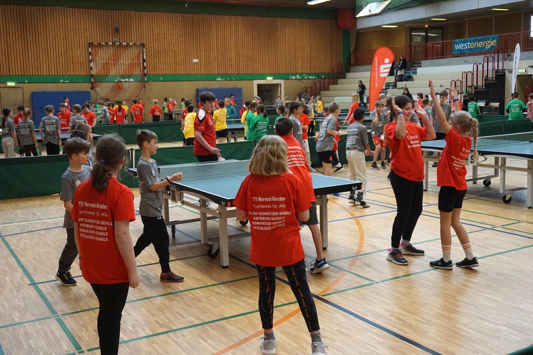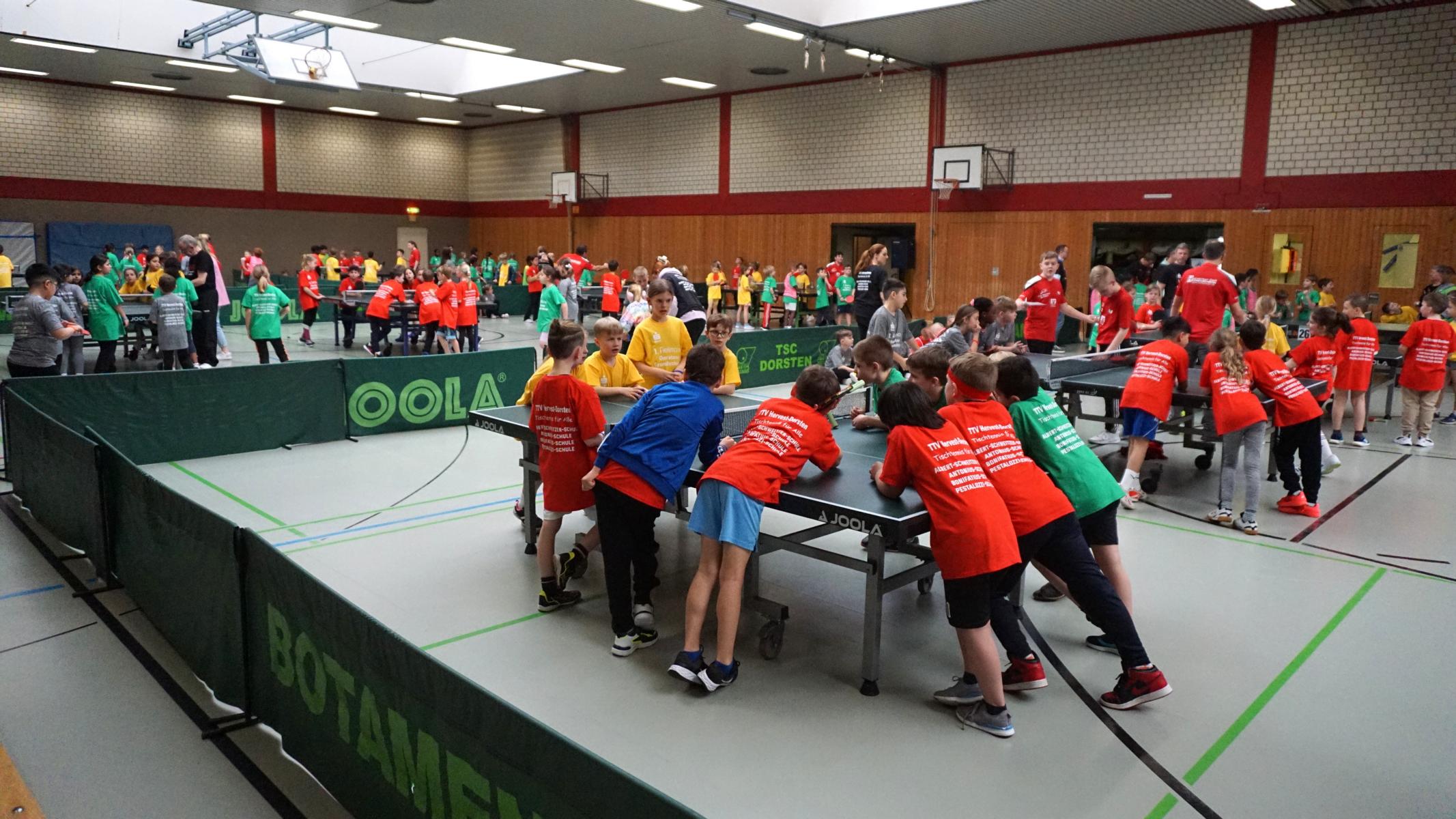 In den Sporthallen des Gymnasiums Petrinum und des St. Ursula Gymnasiums fand eine Tischtennisveranstaltung statt, die in der Kooperation zwischen Grundschulen und Sportverein in dieser Größenordnung kaum zu toppen ist. Insgesamt 30 Tische wurden aufgestellt, und ebenso viele Schiedsrichter, die zumeist aus der eigenen Nachwuchsabteilung des TTV Hervest-Dorsten stammen, brachten das Mammut-Event gemeinsam mit den begleitenden Lehrkräften professionell über die Bühne.