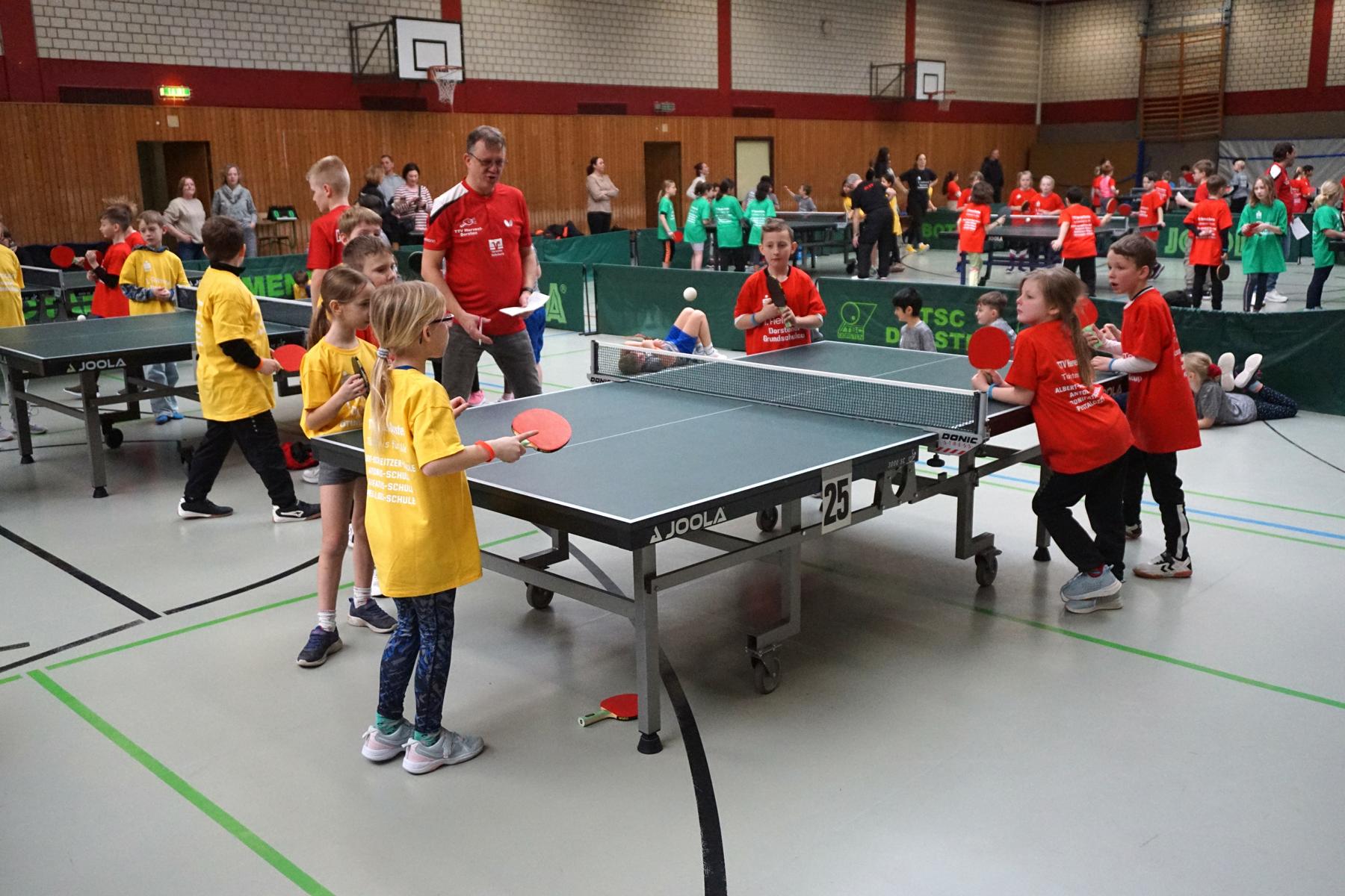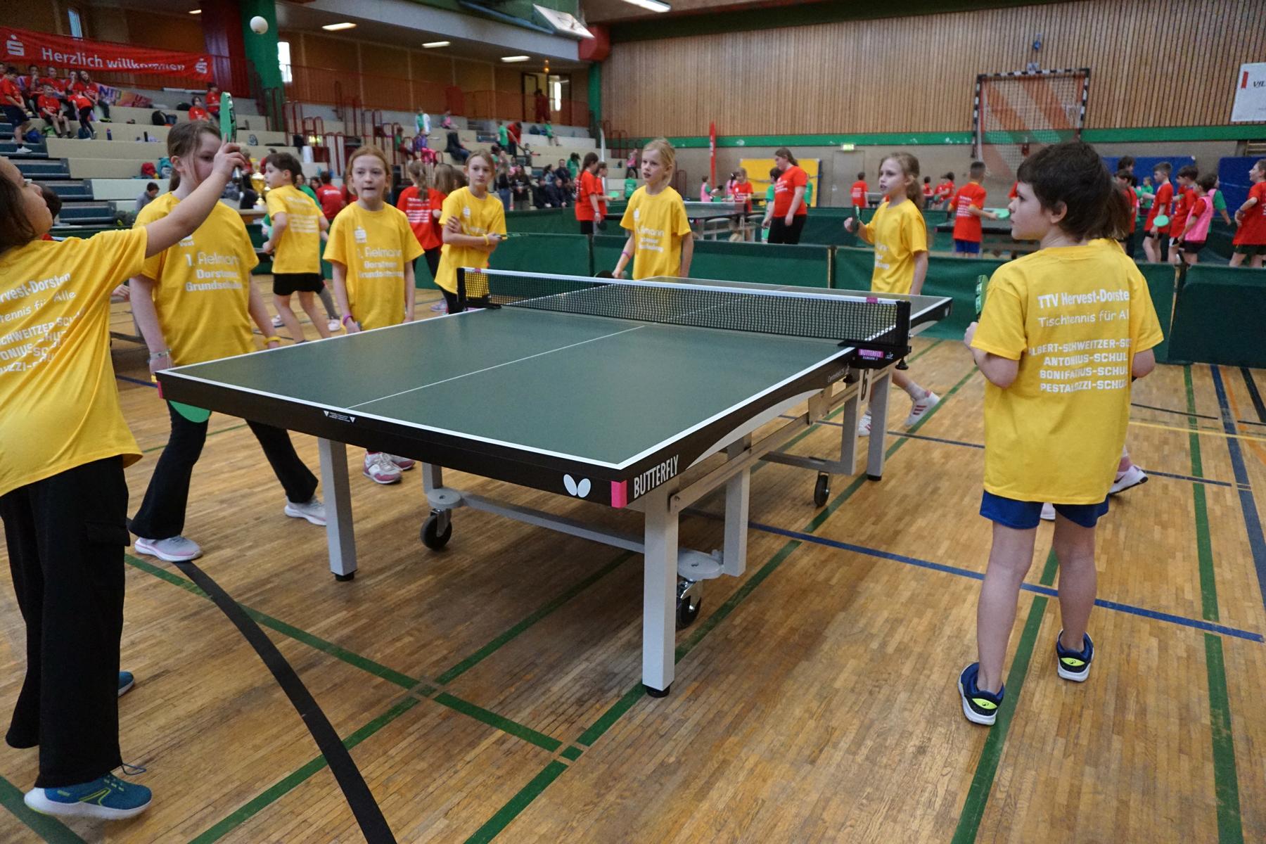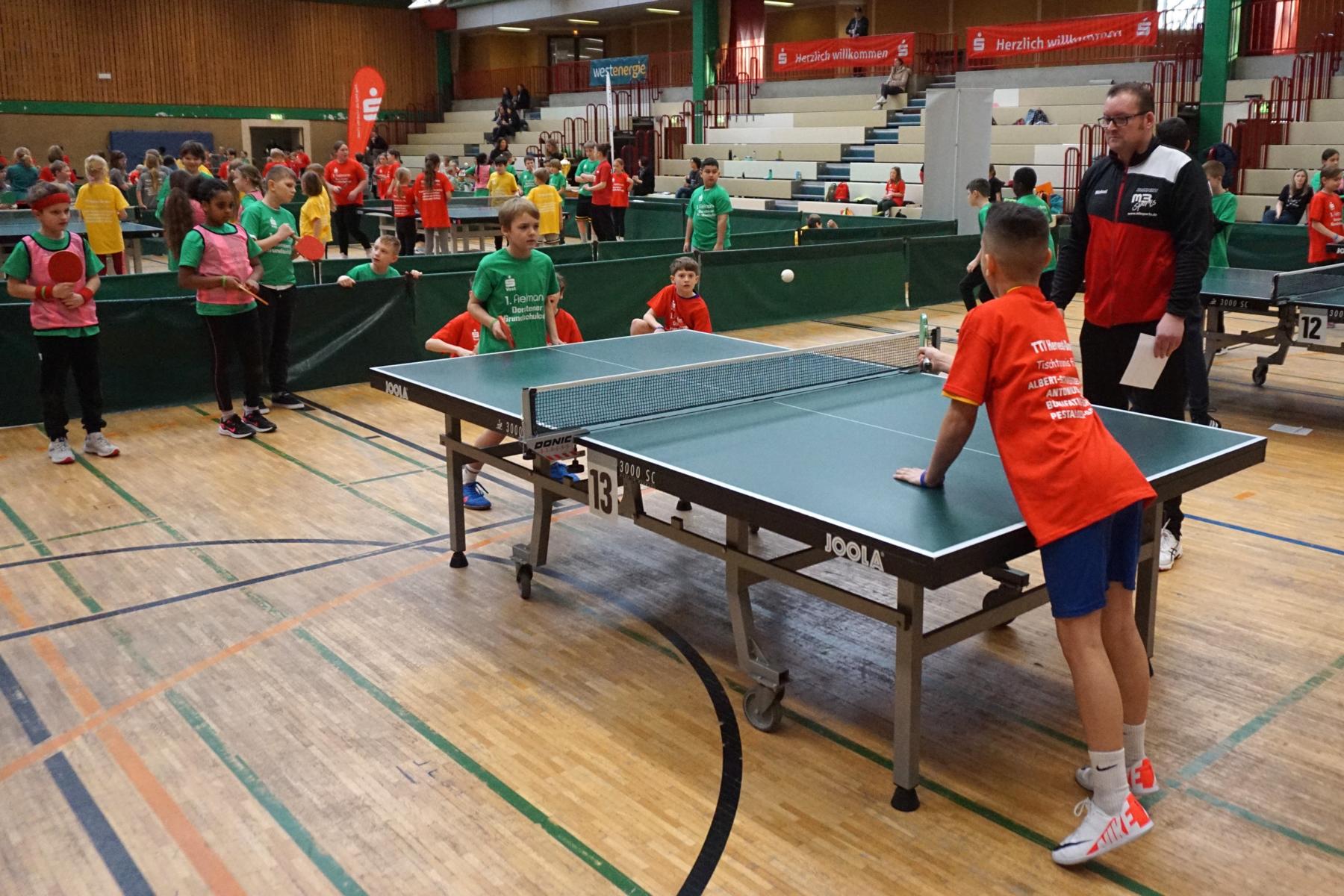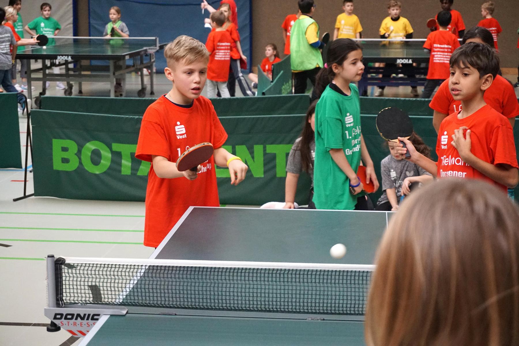 In den Sporthallen des Gymnasiums Petrinum und des St. Ursula Gymnasiums fand eine Tischtennisveranstaltung statt, die in der Kooperation zwischen Grundschulen und Sportverein in dieser Größenordnung kaum zu toppen ist. Insgesamt 30 Tische wurden aufgestellt, und ebenso viele Schiedsrichter, die zumeist aus der eigenen Nachwuchsabteilung des TTV Hervest-Dorsten stammen, brachten das Mammut-Event gemeinsam mit den begleitenden Lehrkräften professionell über die Bühne.