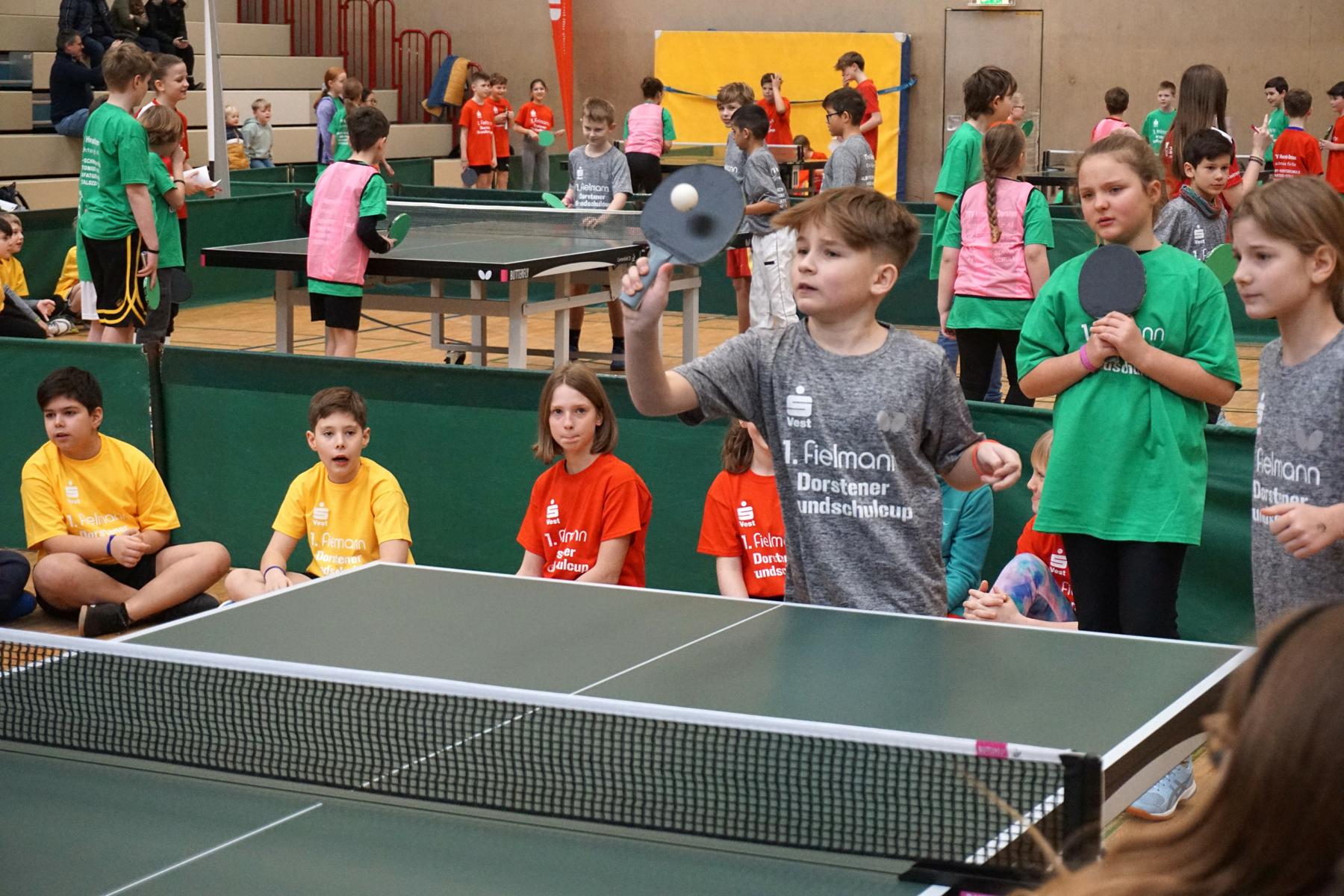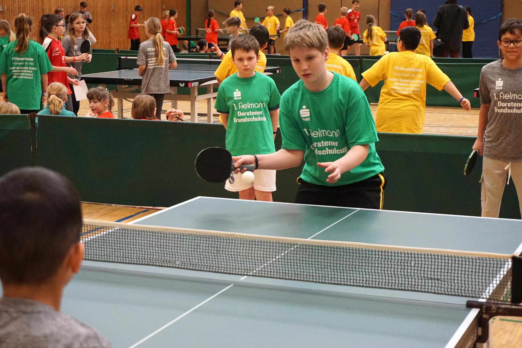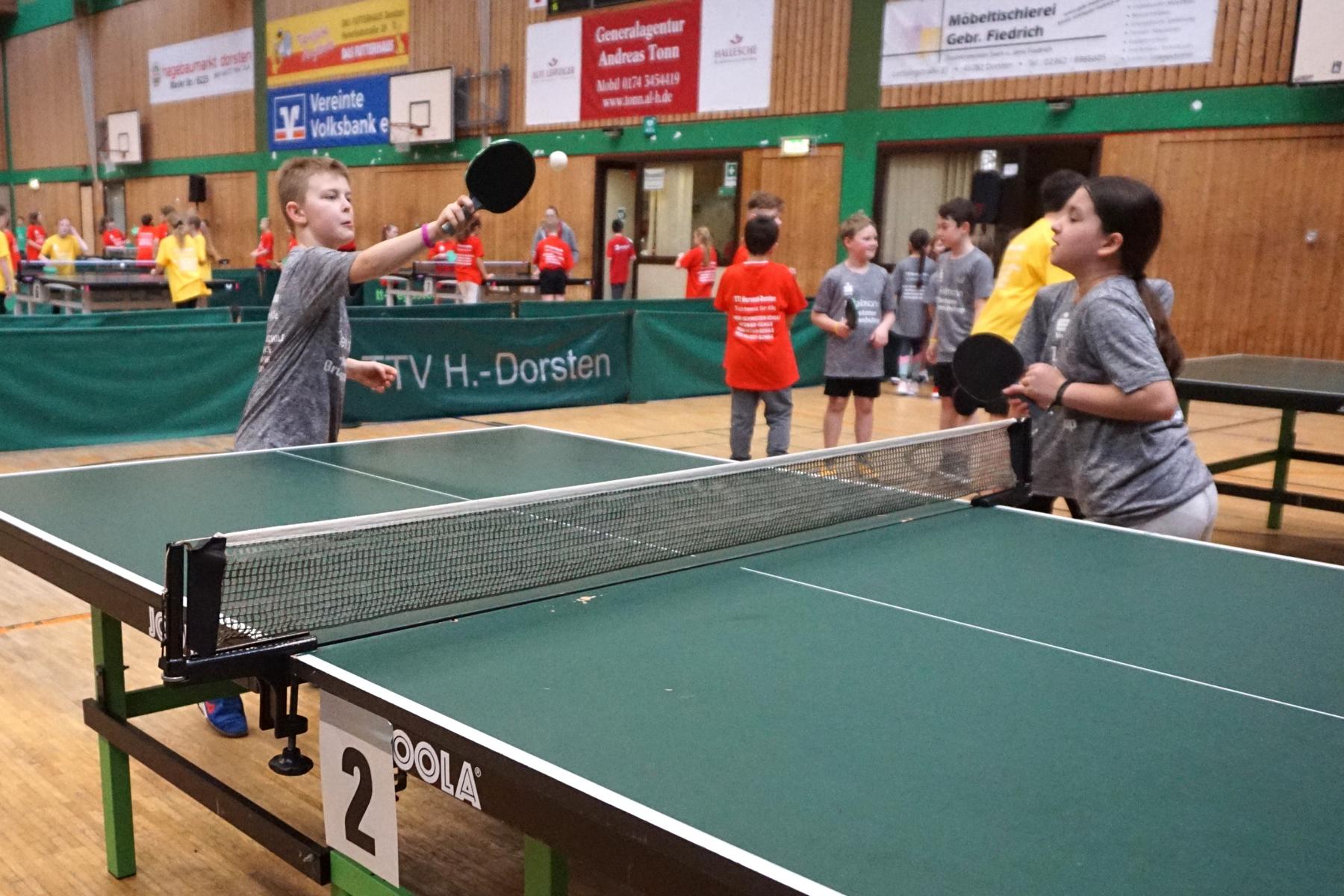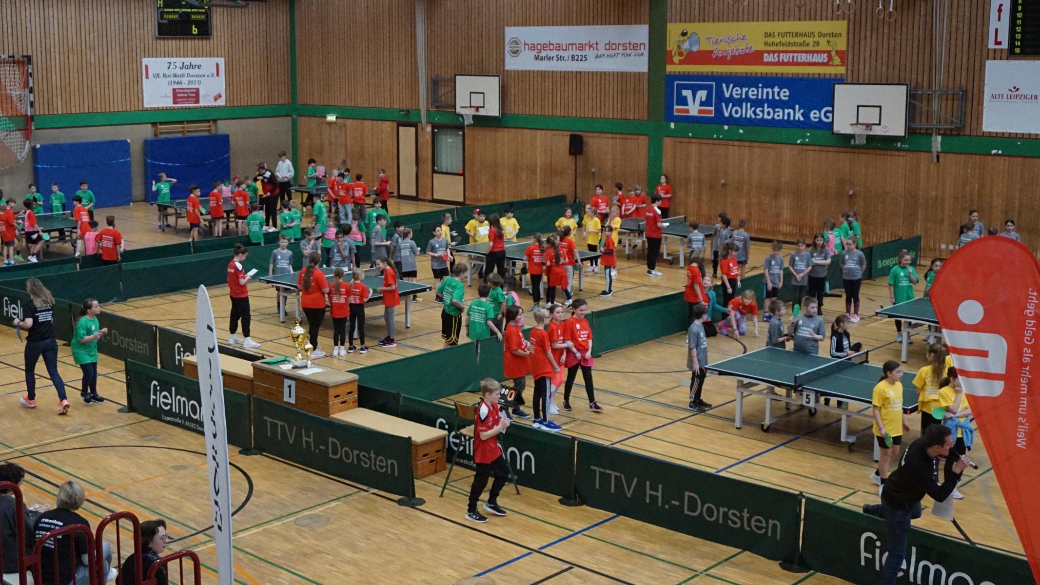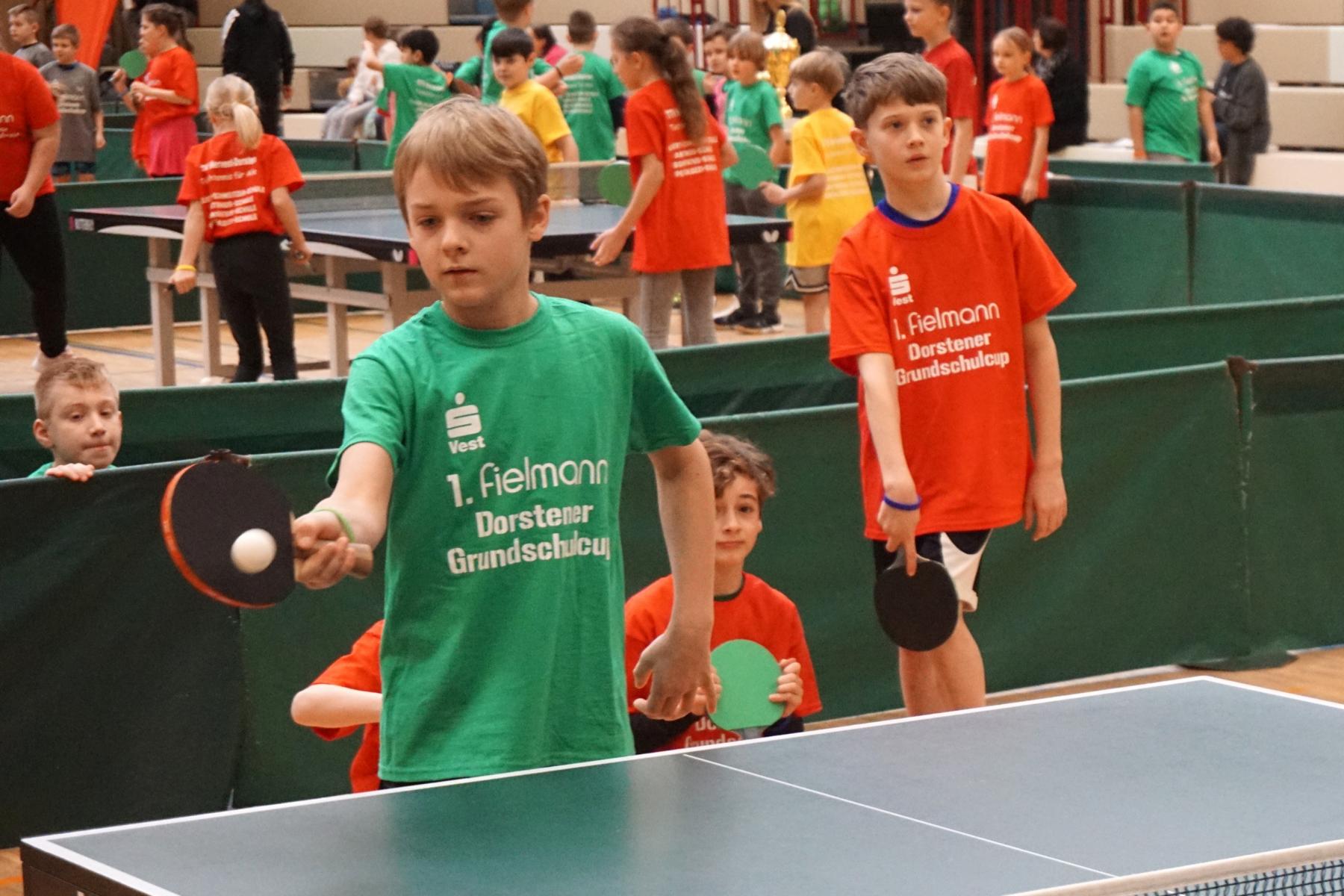 In den Sporthallen des Gymnasiums Petrinum und des St. Ursula Gymnasiums fand eine Tischtennisveranstaltung statt, die in der Kooperation zwischen Grundschulen und Sportverein in dieser Größenordnung kaum zu toppen ist. Insgesamt 30 Tische wurden aufgestellt, und ebenso viele Schiedsrichter, die zumeist aus der eigenen Nachwuchsabteilung des TTV Hervest-Dorsten stammen, brachten das Mammut-Event gemeinsam mit den begleitenden Lehrkräften professionell über die Bühne.