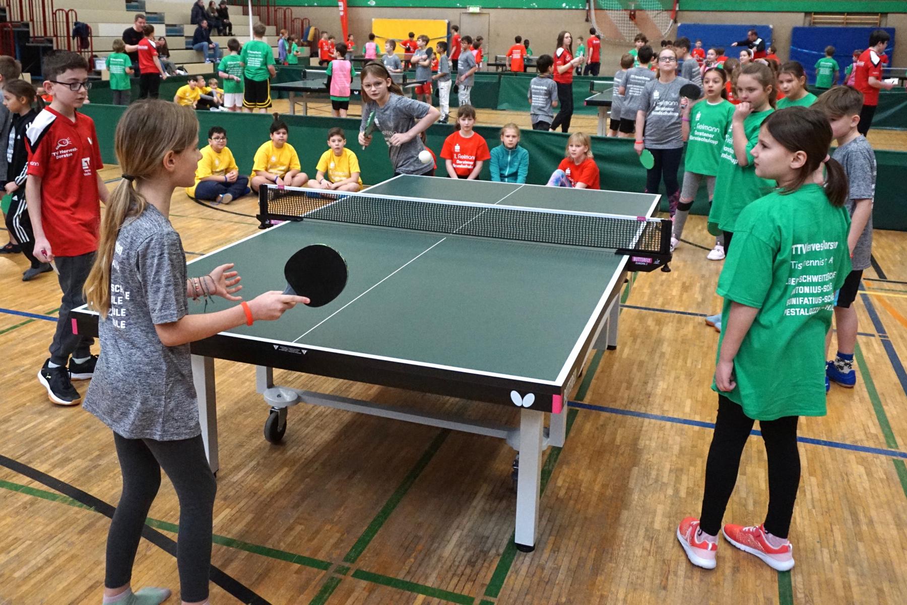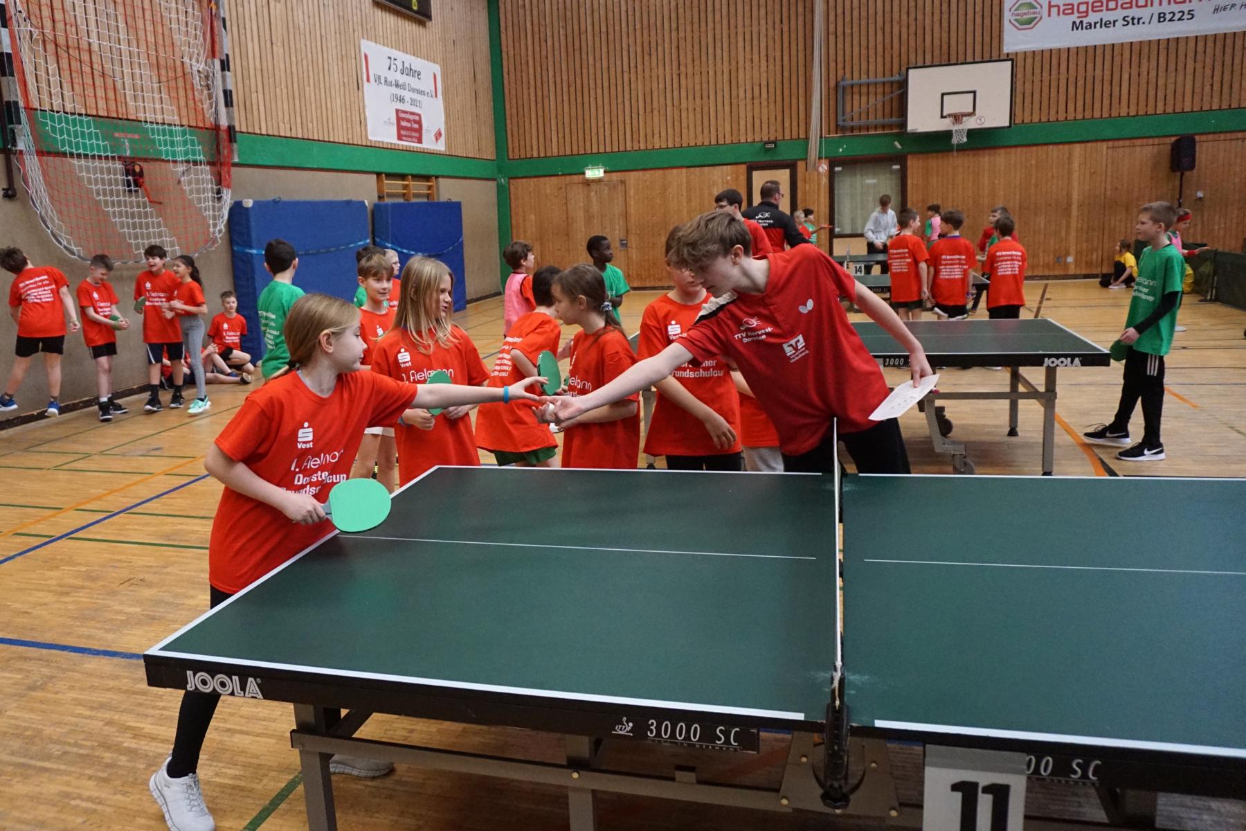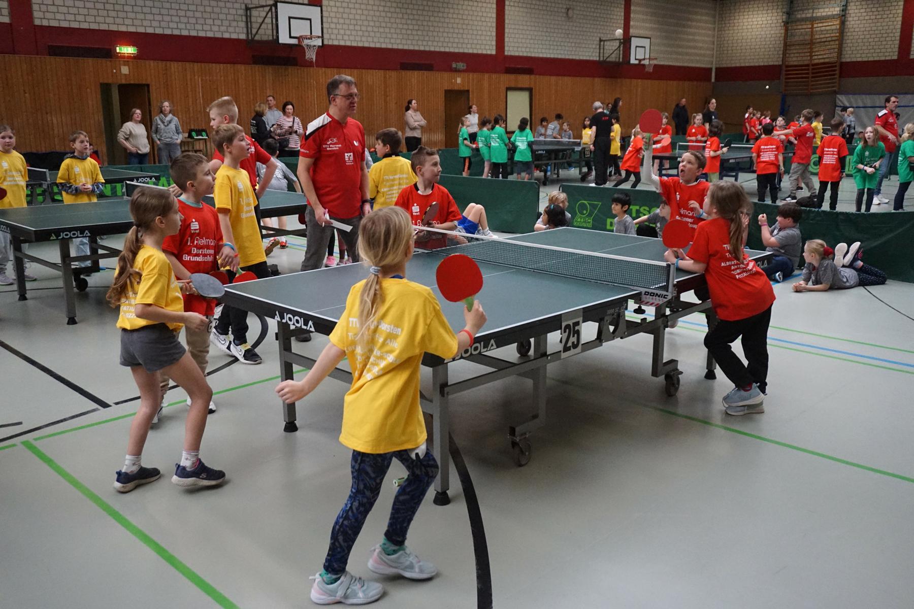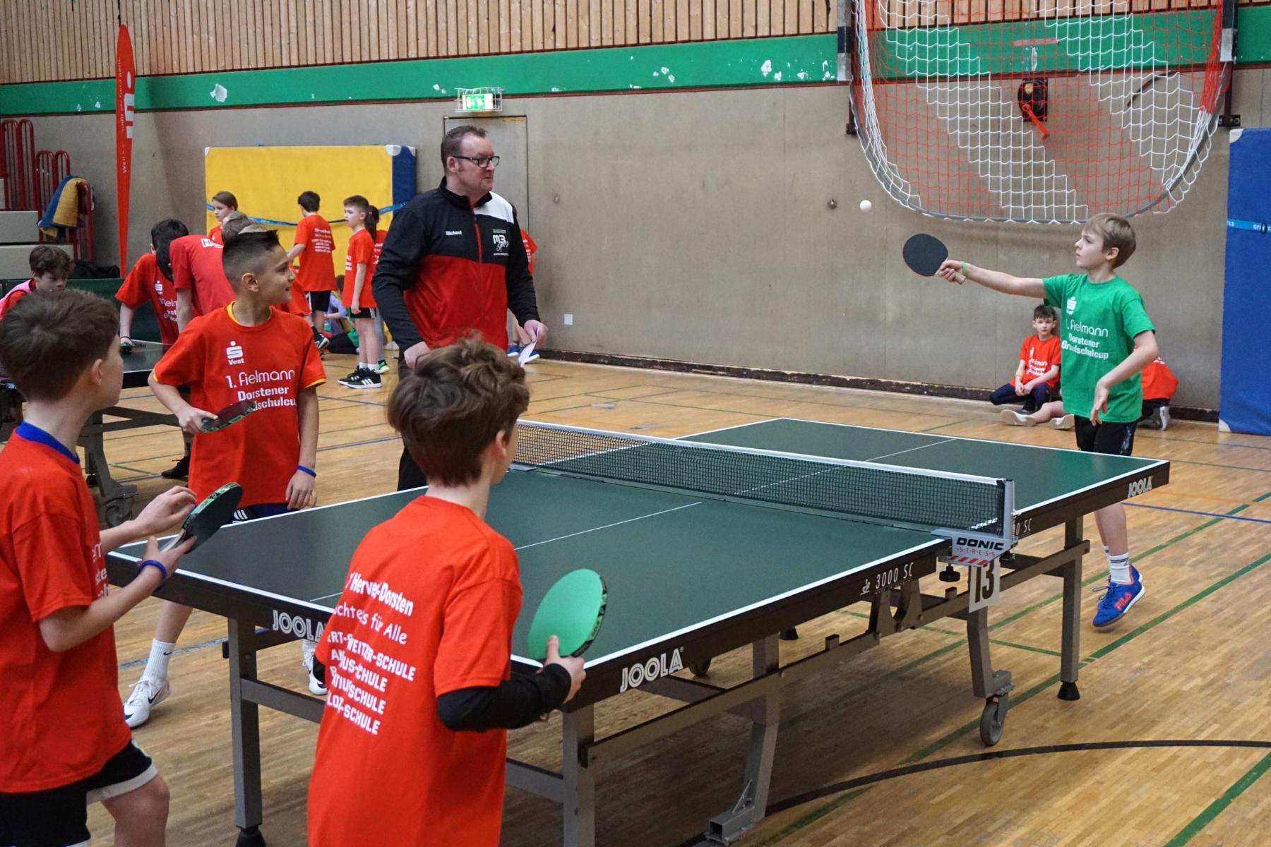 In den Sporthallen des Gymnasiums Petrinum und des St. Ursula Gymnasiums fand eine Tischtennisveranstaltung statt, die in der Kooperation zwischen Grundschulen und Sportverein in dieser Größenordnung kaum zu toppen ist. Insgesamt 30 Tische wurden aufgestellt, und ebenso viele Schiedsrichter, die zumeist aus der eigenen Nachwuchsabteilung des TTV Hervest-Dorsten stammen, brachten das Mammut-Event gemeinsam mit den begleitenden Lehrkräften professionell über die Bühne.