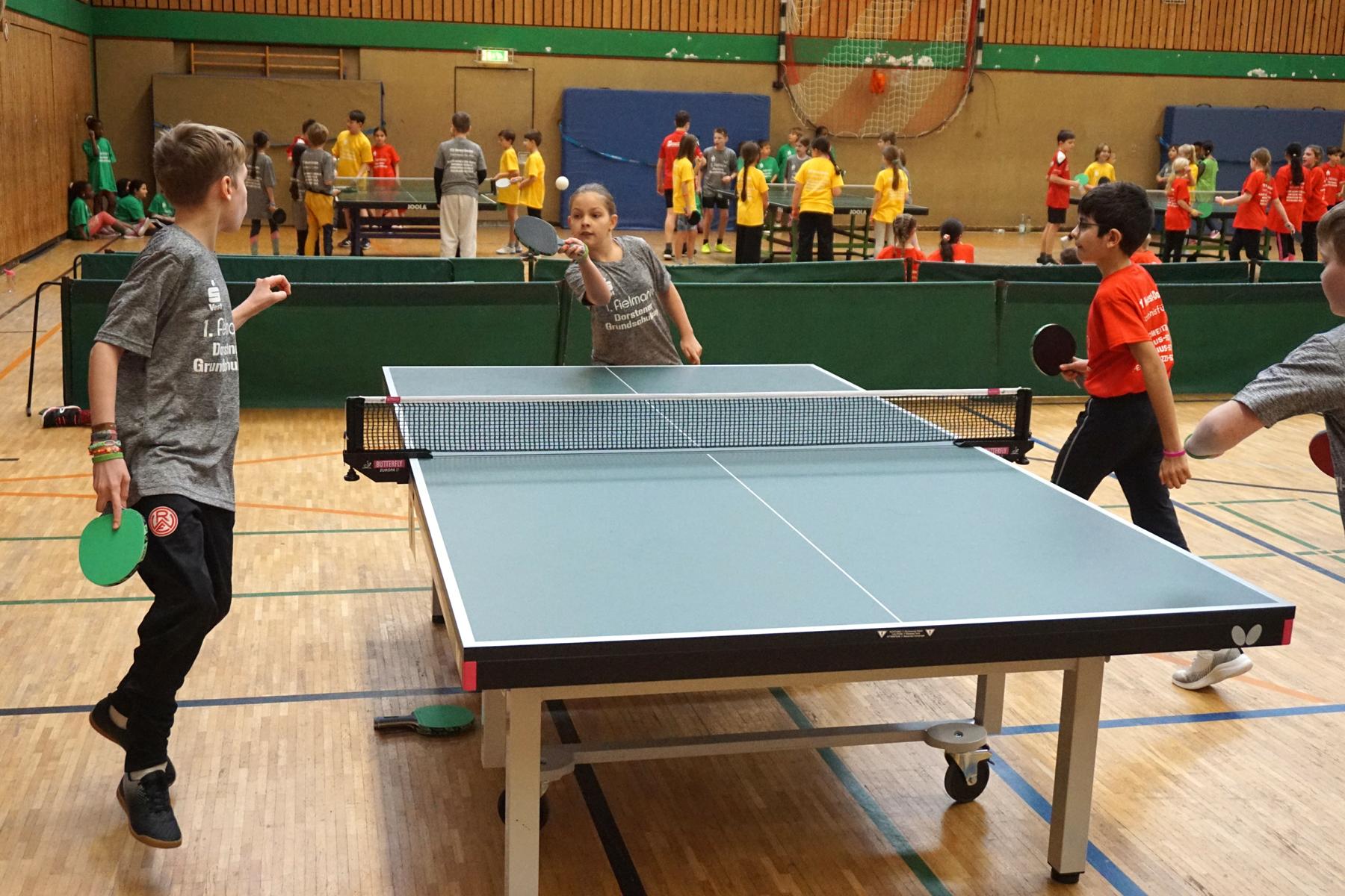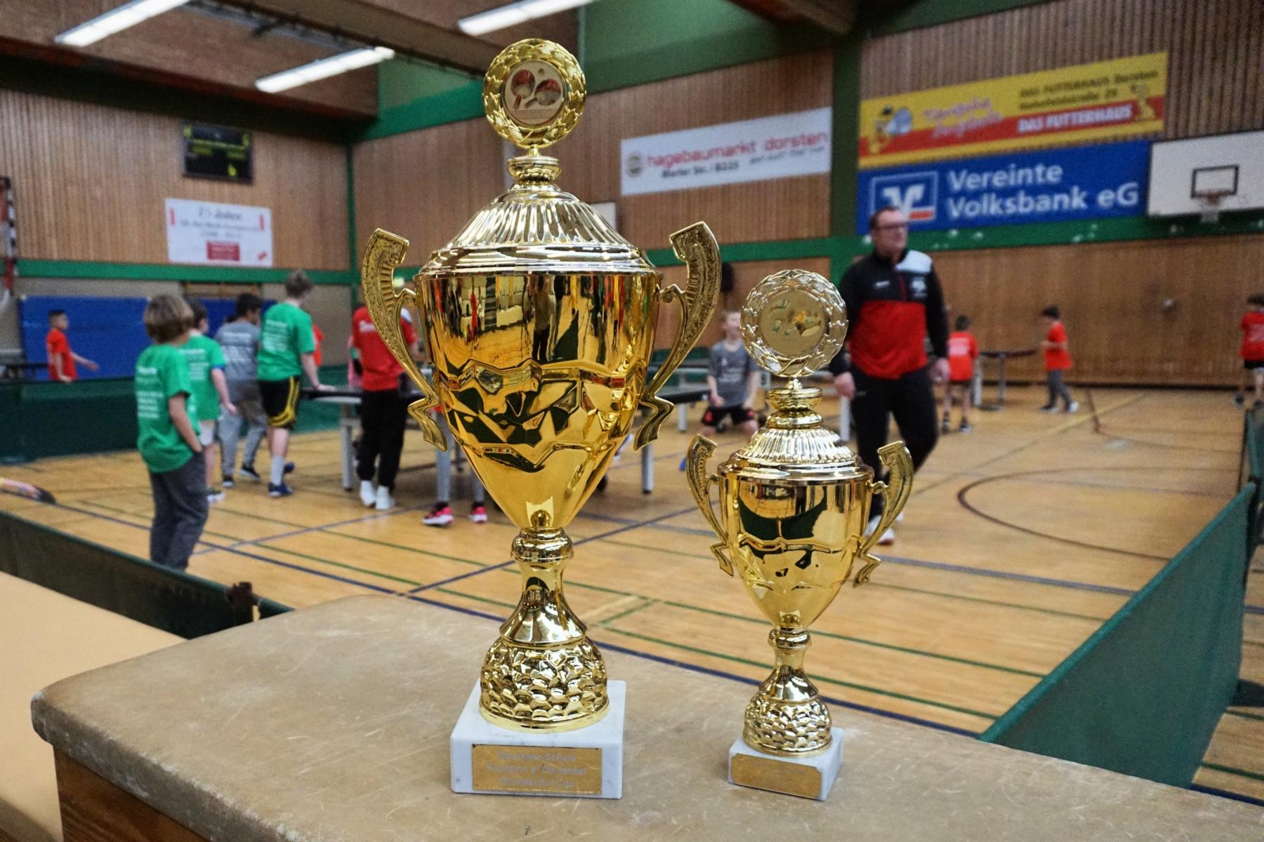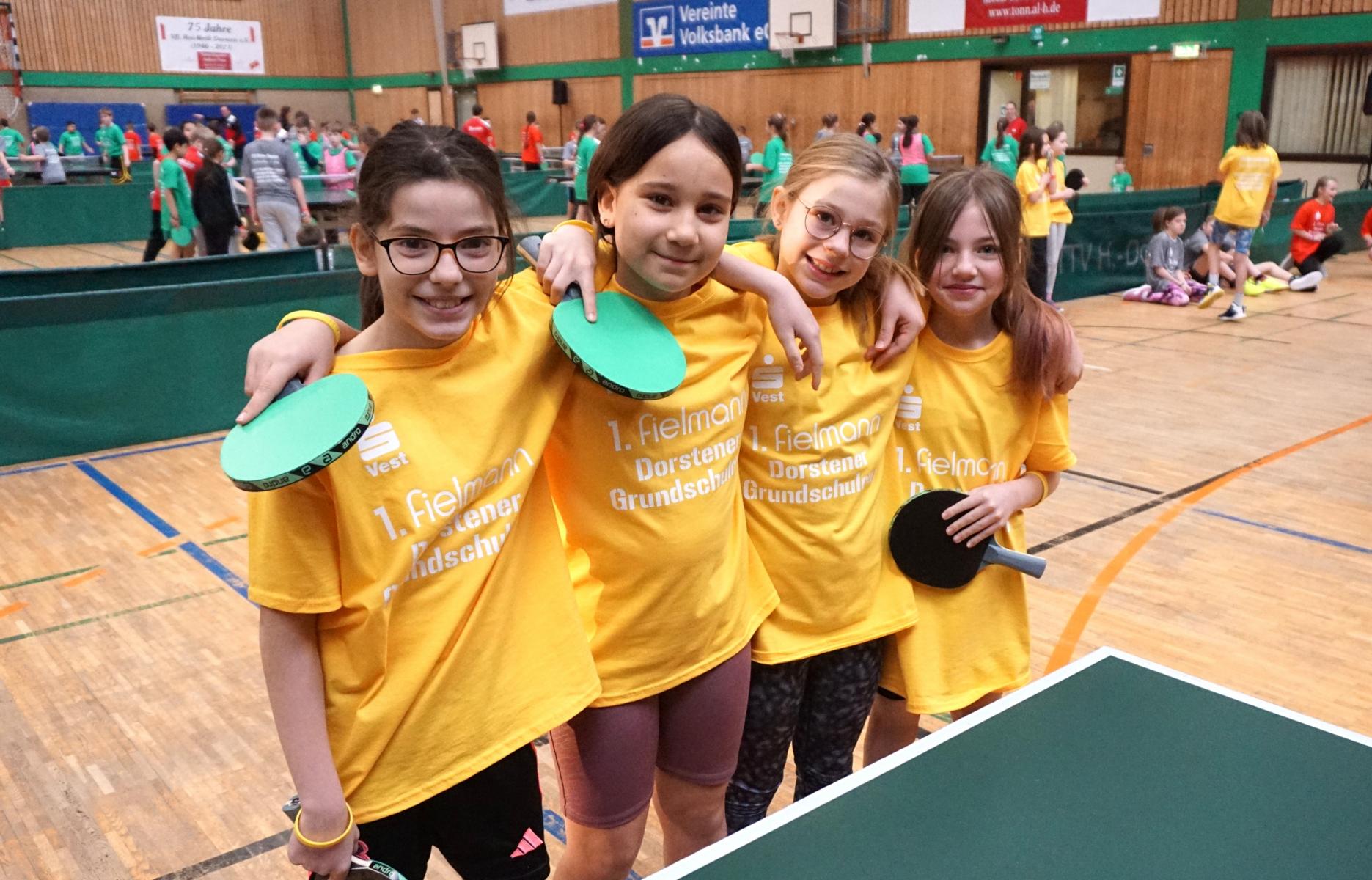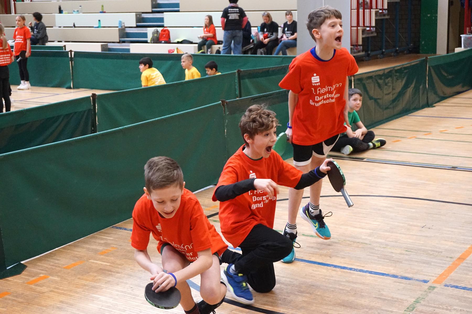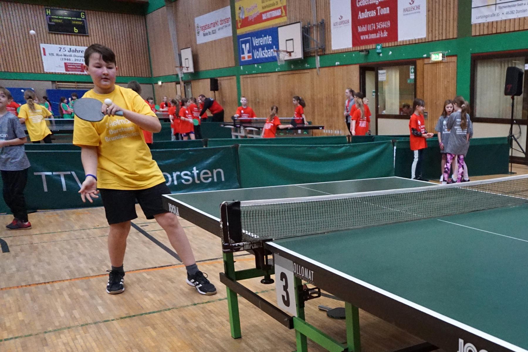 In den Sporthallen des Gymnasiums Petrinum und des St. Ursula Gymnasiums fand eine Tischtennisveranstaltung statt, die in der Kooperation zwischen Grundschulen und Sportverein in dieser Größenordnung kaum zu toppen ist. Insgesamt 30 Tische wurden aufgestellt, und ebenso viele Schiedsrichter, die zumeist aus der eigenen Nachwuchsabteilung des TTV Hervest-Dorsten stammen, brachten das Mammut-Event gemeinsam mit den begleitenden Lehrkräften professionell über die Bühne.