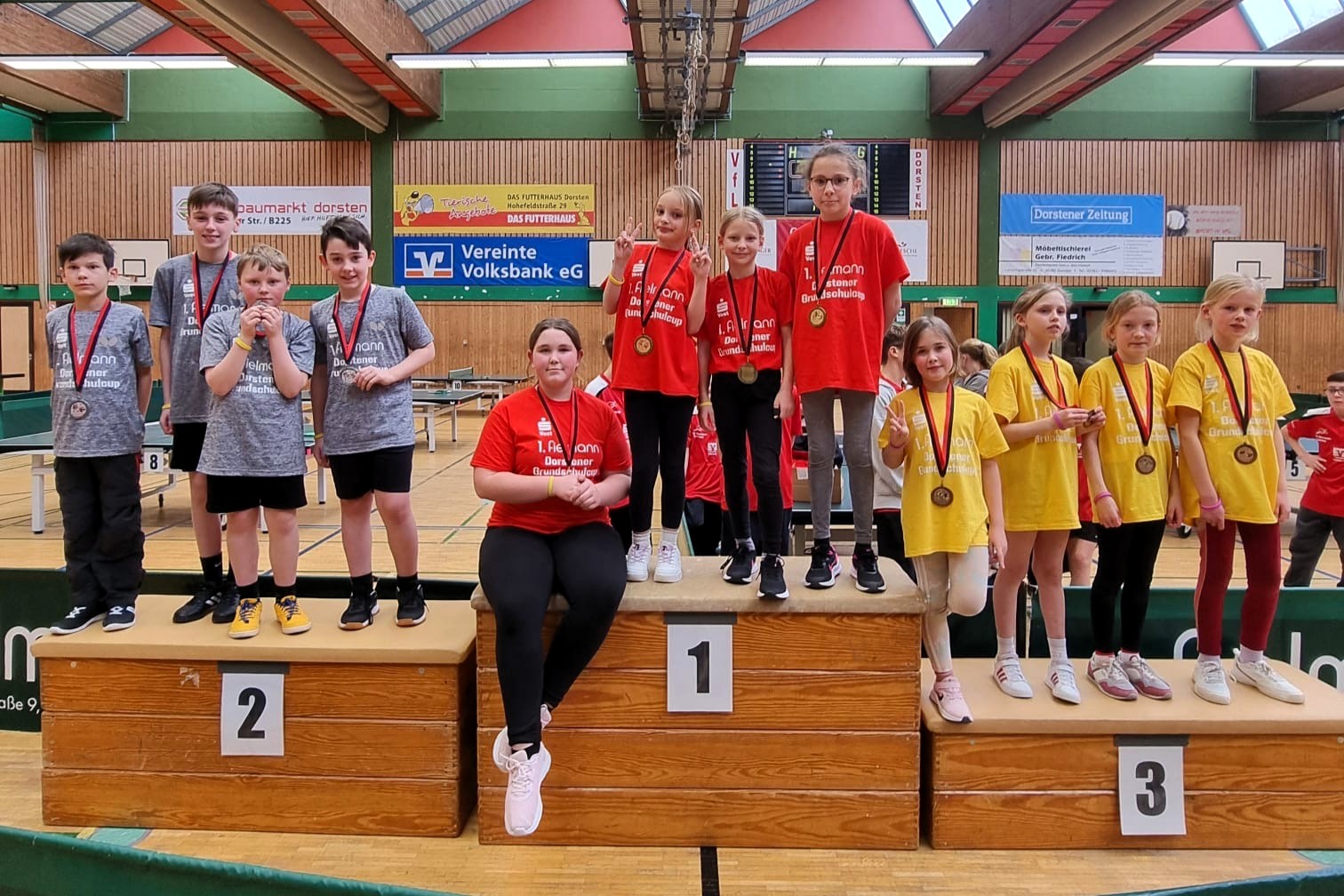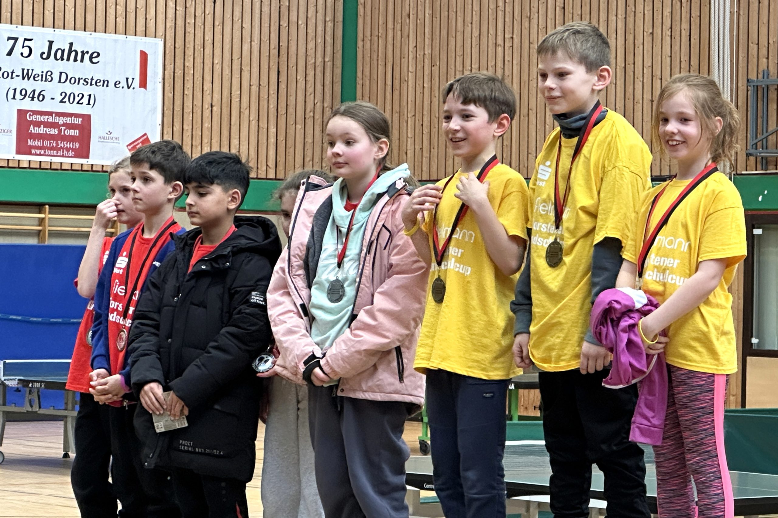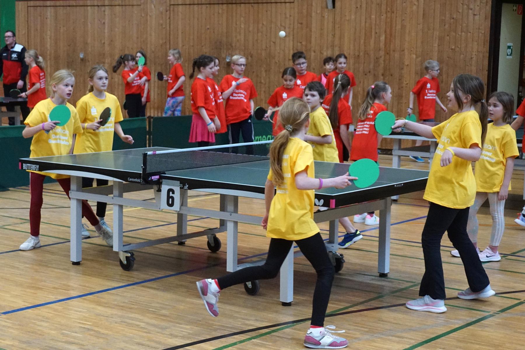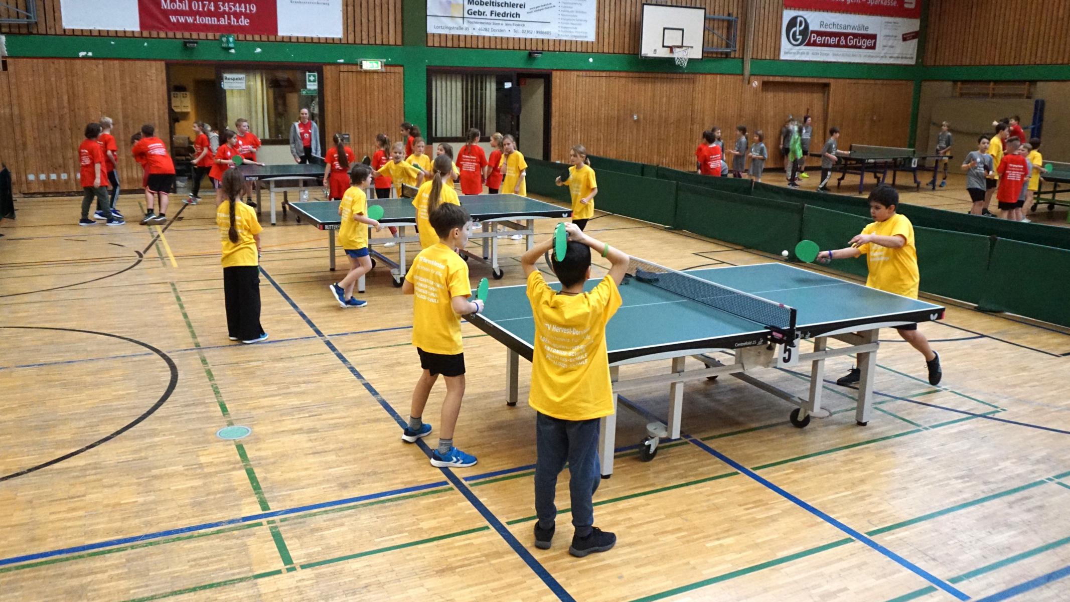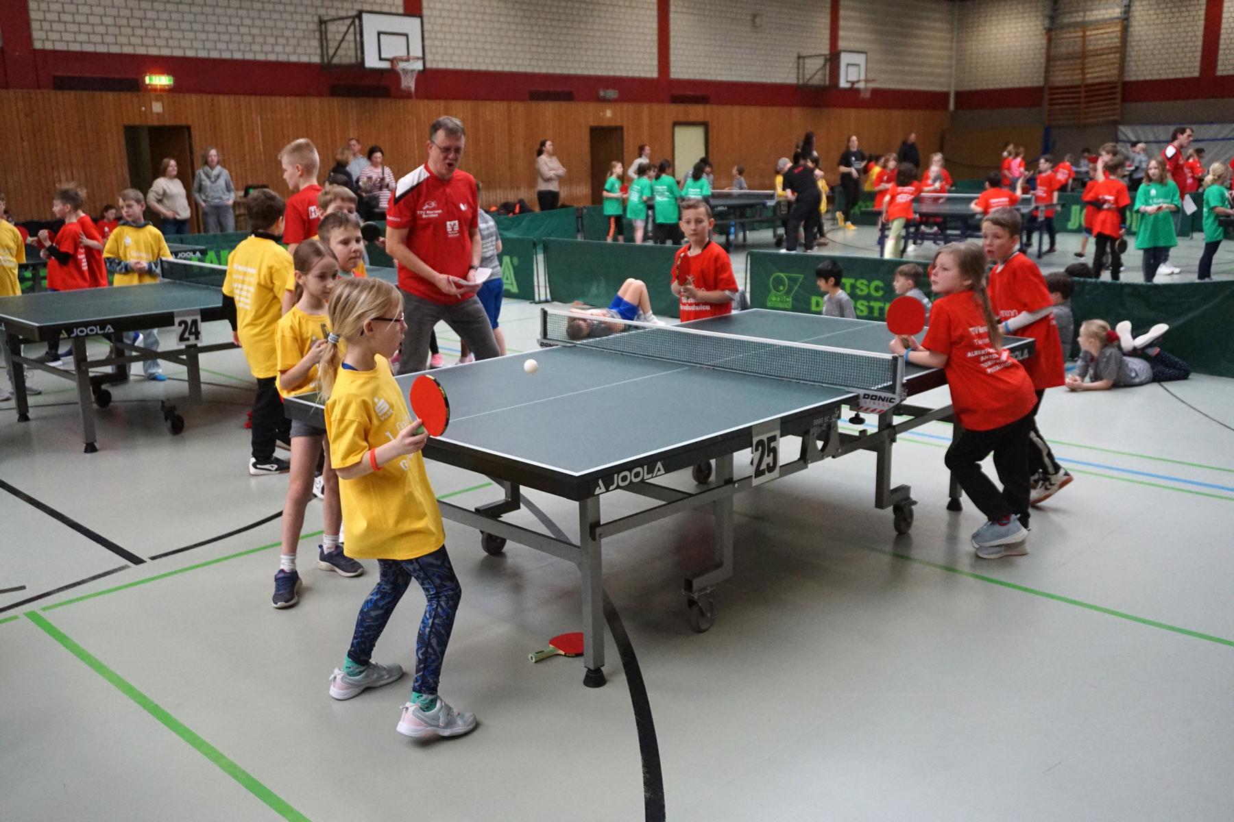 450 Kinder konnten es kaum erwarten – der erste Grundschul-Cup organisiert und durchgeführt vom TTV Hervest Dorsten stand an! Mit großer Vorfreude und Spannung machten sich die Schülerinnen und Schüler der dritten und vierten Klassen von den vier Dorstener Grundschulen, Antoniusschule, Pestalozzischule, Albert-Schweitzer-Schule und der Bonifatiusschule auf den Weg zur Halle. Dank der großartigen Unterstützung der Stadt Dorsten, die zehn Busse zur Verfügung stellte, kamen alle sicher und pünktlich an.