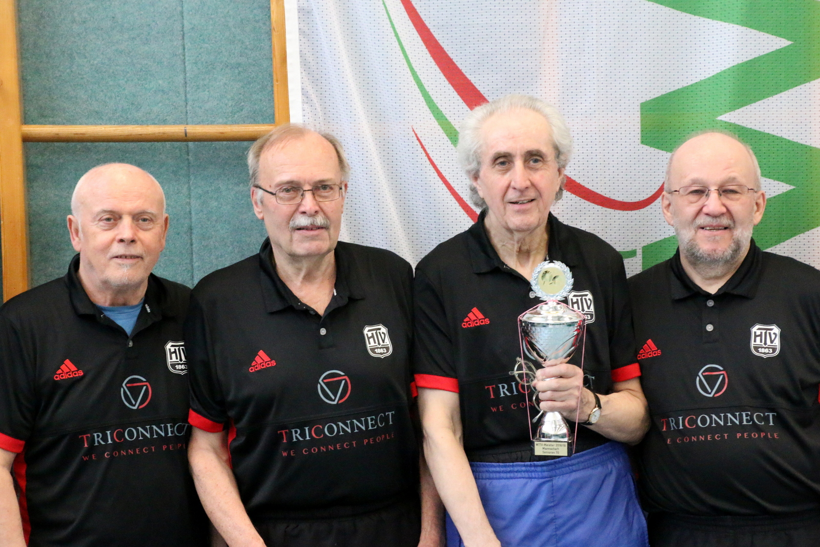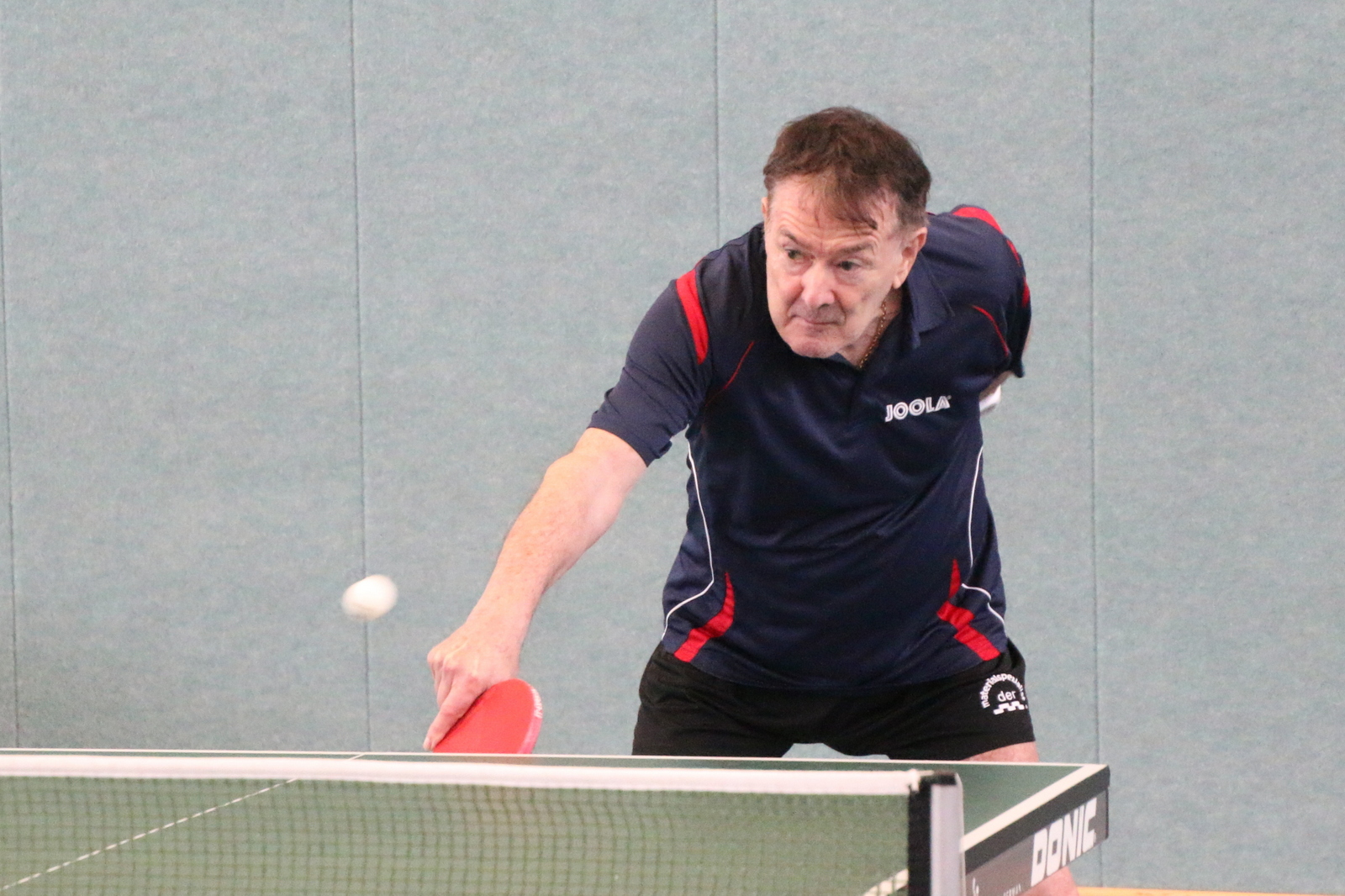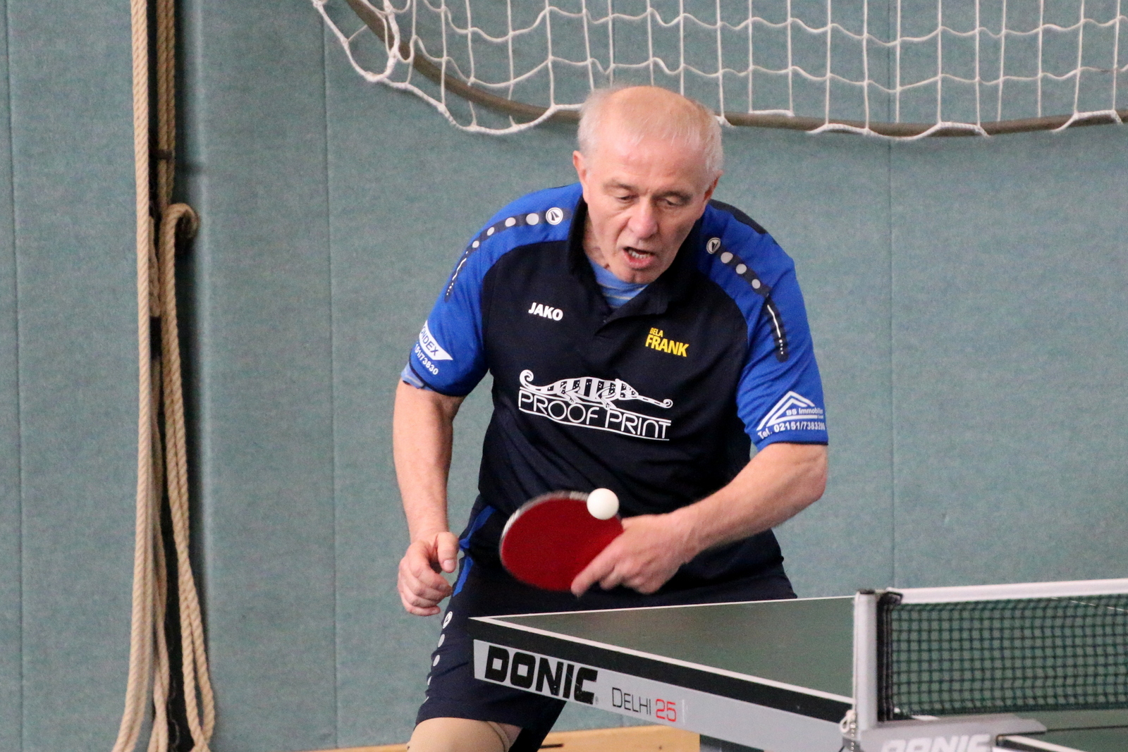 Großen Sport gab es bei den 60er Herren. Waren doch hier reihenweise Weltmeister, Europameister und Medaillengewinner am Start. Ein Schreck gleich zu Beginn, Manfred Nieswand (2016 Weltmeister in Alicante) humpelte in die Halle und konnte wegen einer Knieverletzung nur eingeschränkt eingesetzt werden. Überragender Einzelspieler war Franz-Josef Hürmann (TTC Holzwickede). Bis zum letzten Spiel blieb er ungeschlagen und verlor dann nur beim Spiel um Platz 3 gegen Gerd Groll (Schwalbe Bergneustadt).