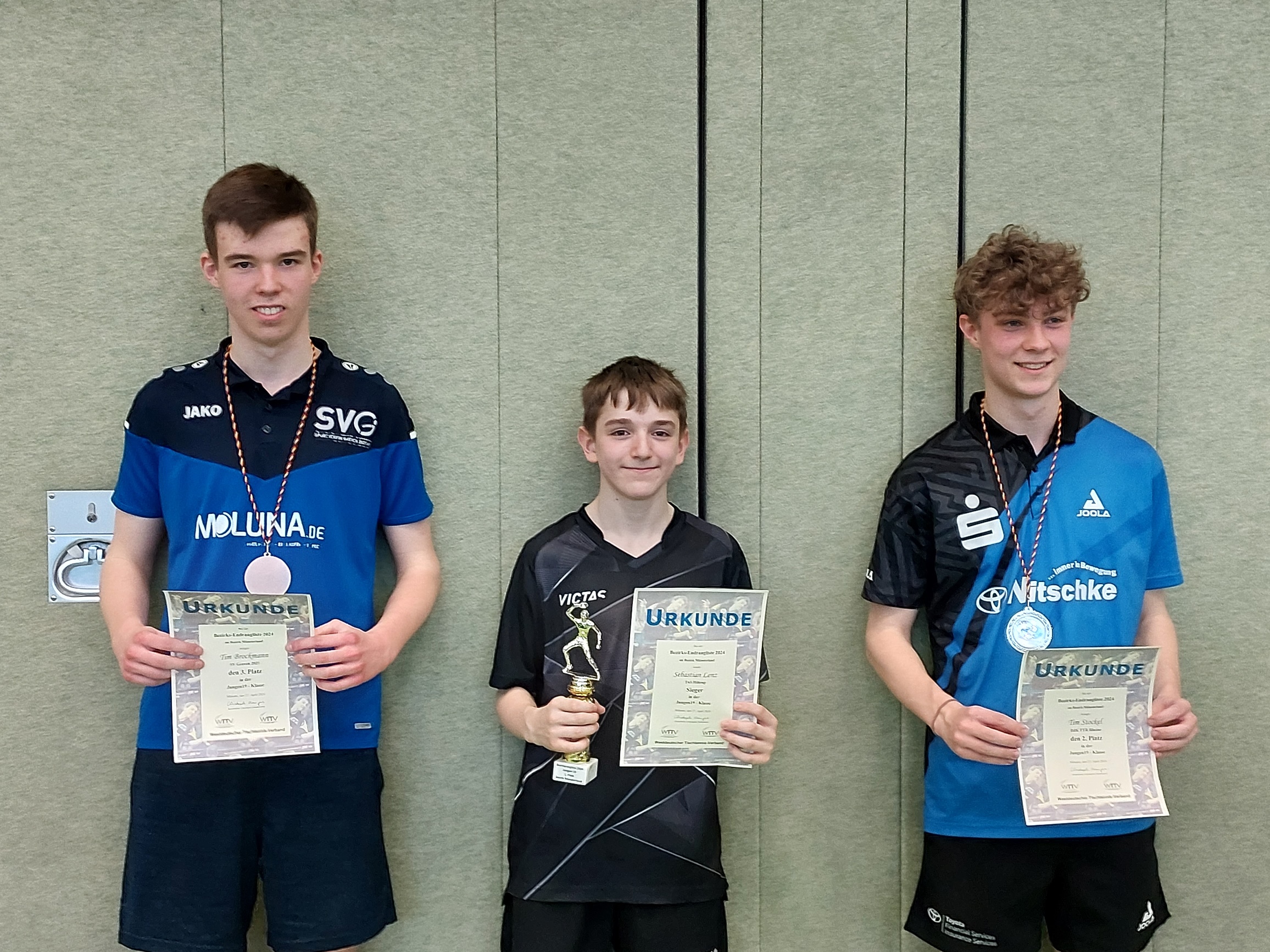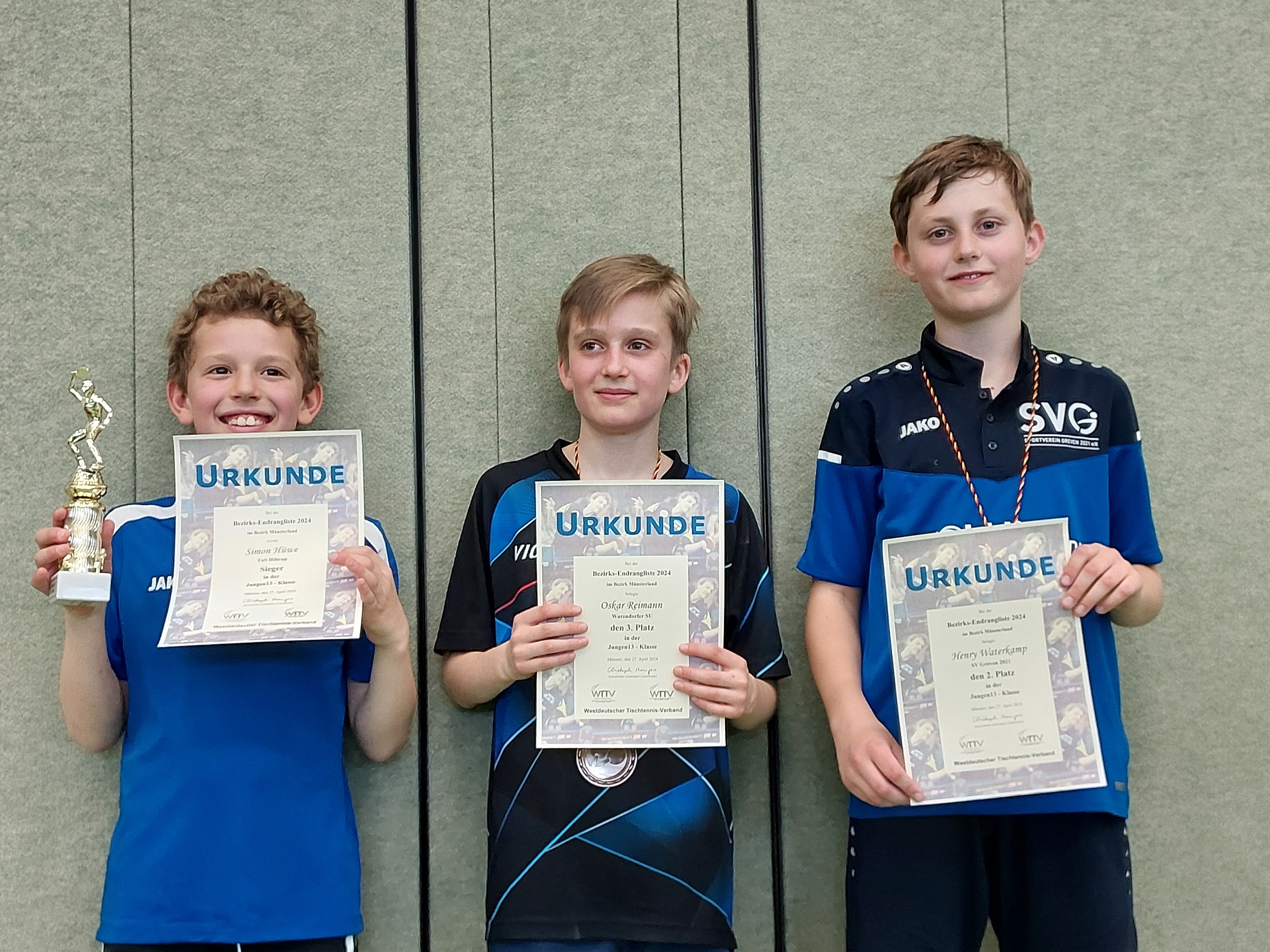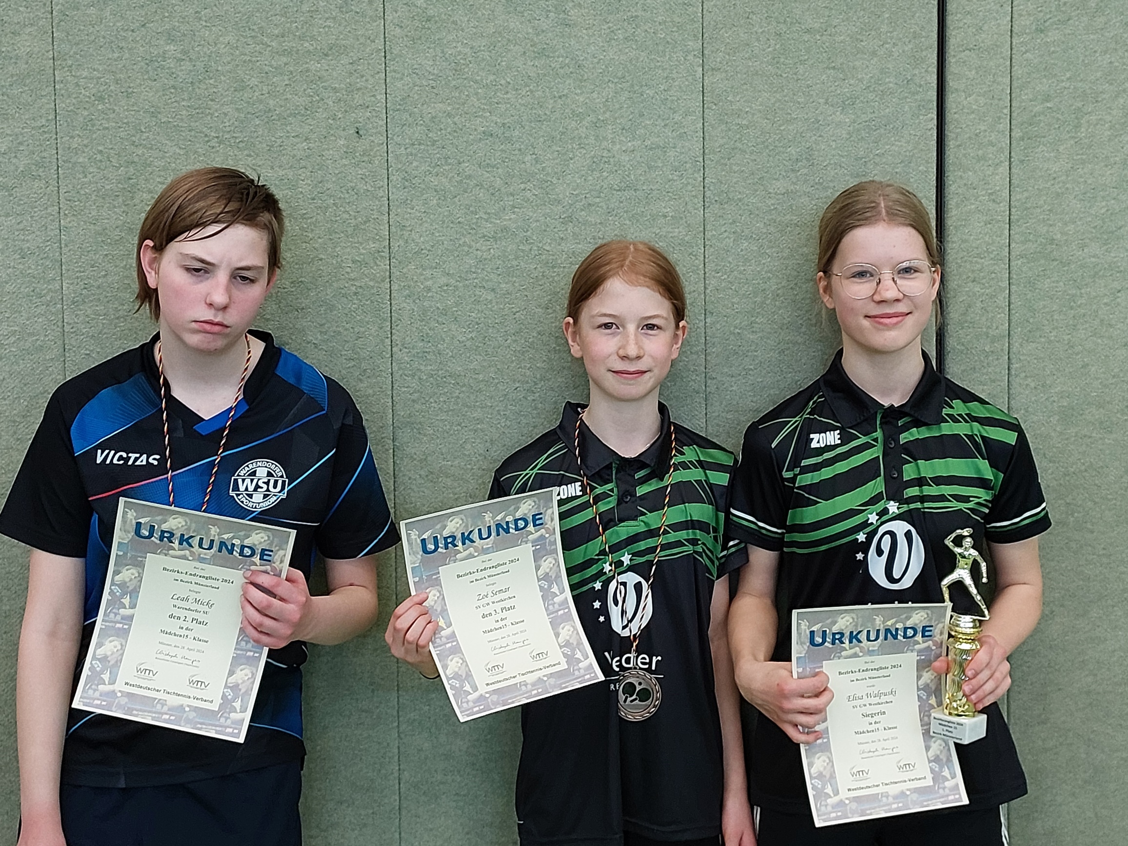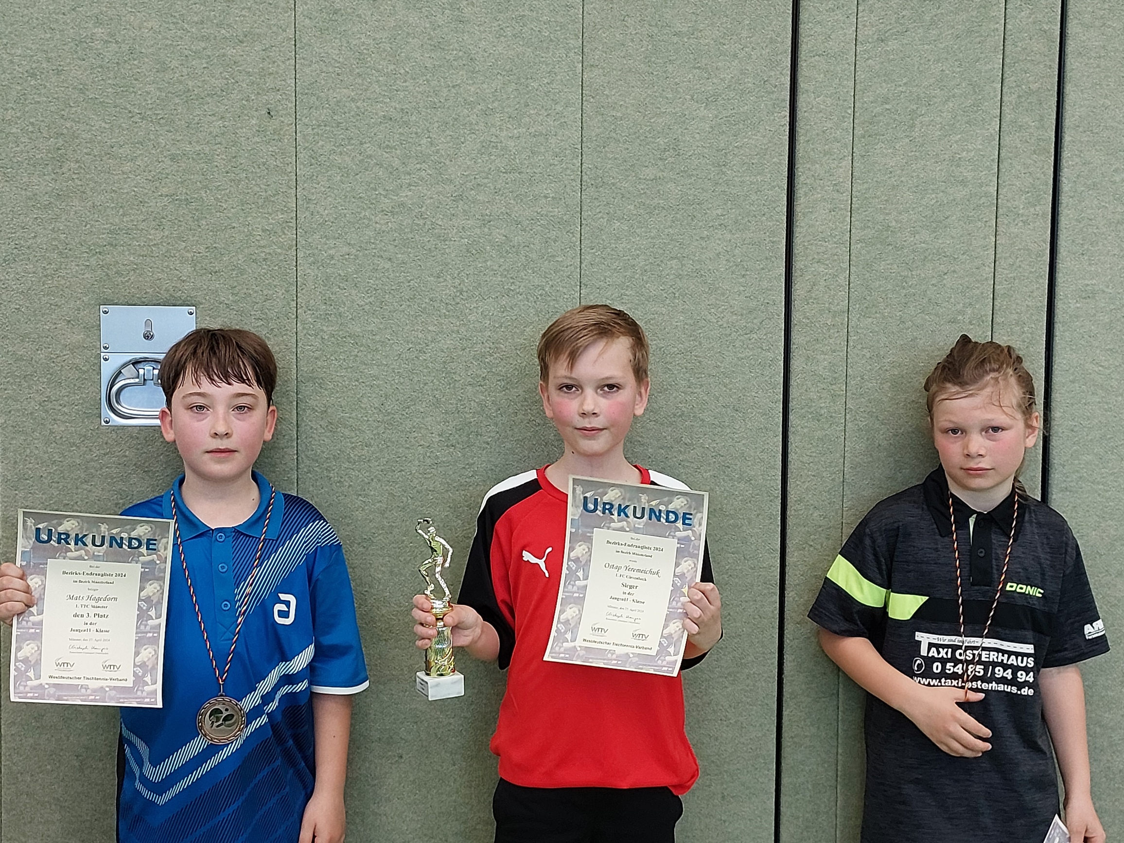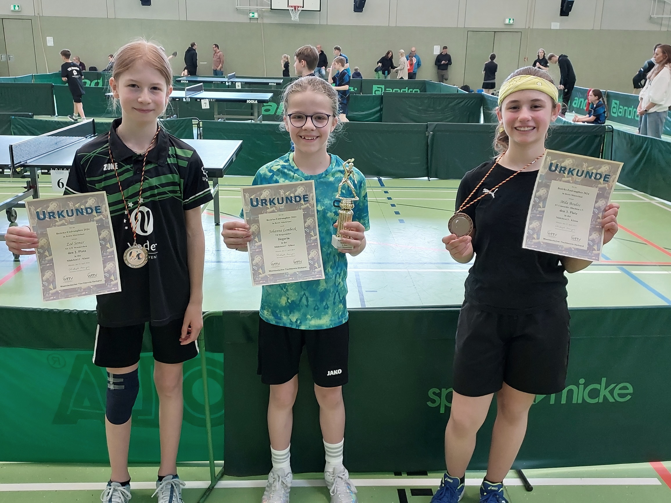 Am letzten April-Wochenende wurden in der Sporthalle des Hansa-Berufskollegs in Münster unter der Leitung von Jugendvorstand Frederick Mahnke und Jugend-Ressortleiter Christoph Menges die Bezirksendranglisten in acht Nachwuchsklassen ausgetragen. An 12 Tischen wurde außerordentlich fair und mit großem Einsatz um die dekorativen Siegertrophäen gekämpft.