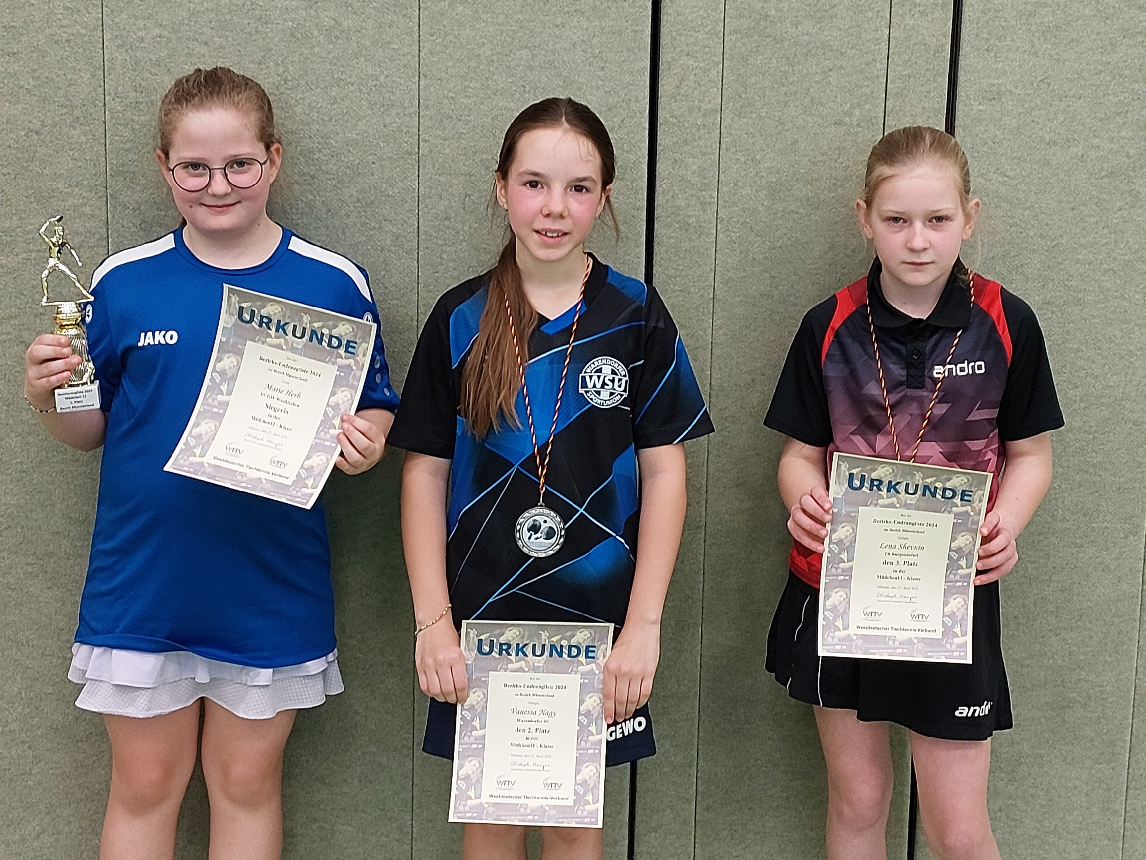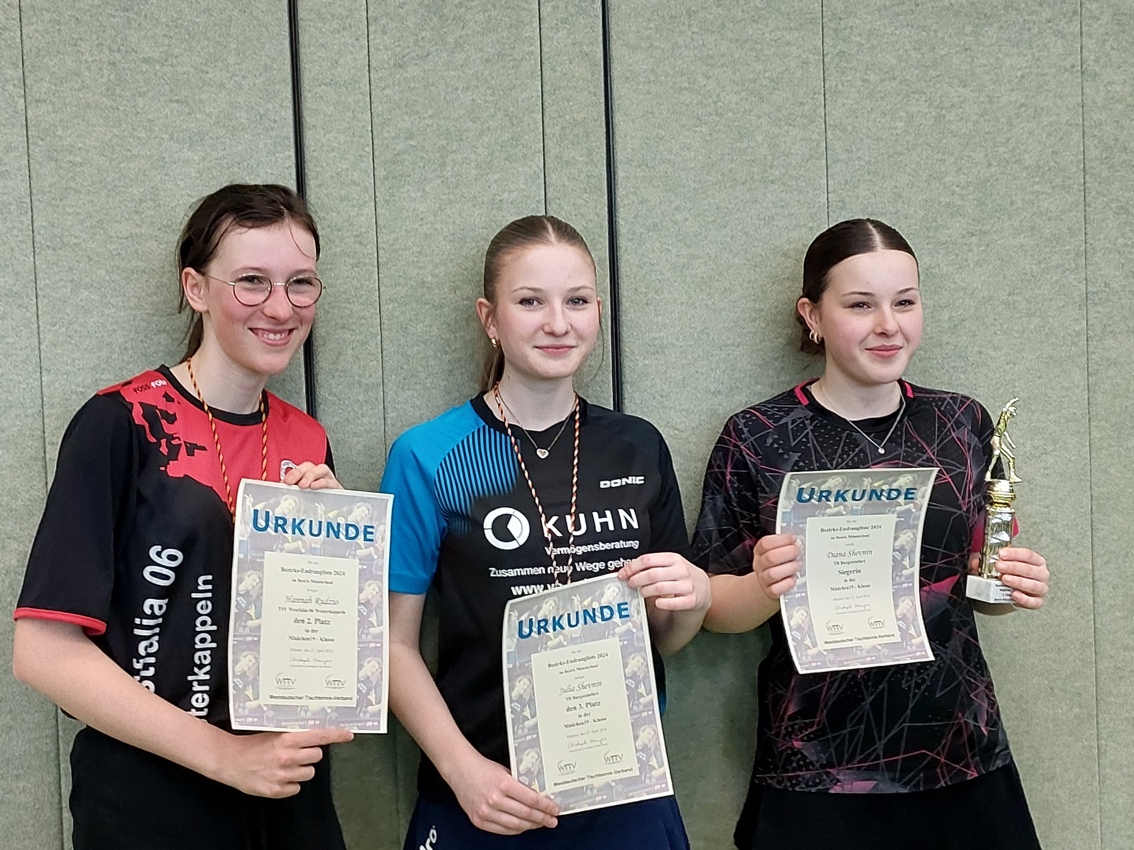 Für den TuS Hiltrup fuhren Simon Hüwe (Jungen 13) und Marie Herb (Mädchen 11) zwei weitere Titel ein, für den TB Burgsteinfurt Diana Shevnin (Mädchen 19) und Johanna Lembeck (Mädchen 13). Die weiteren Titel gingen an Elisa Walpuski (GW Westkirchen/Mädchen 15) und Ostap Yeremeichuk (1. FC Gievenbeck/Jungen 11).