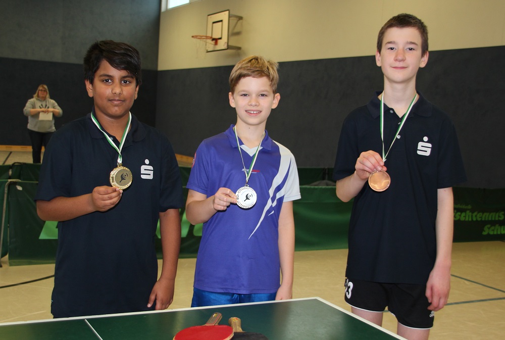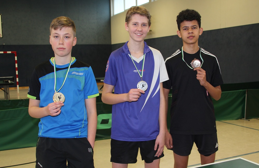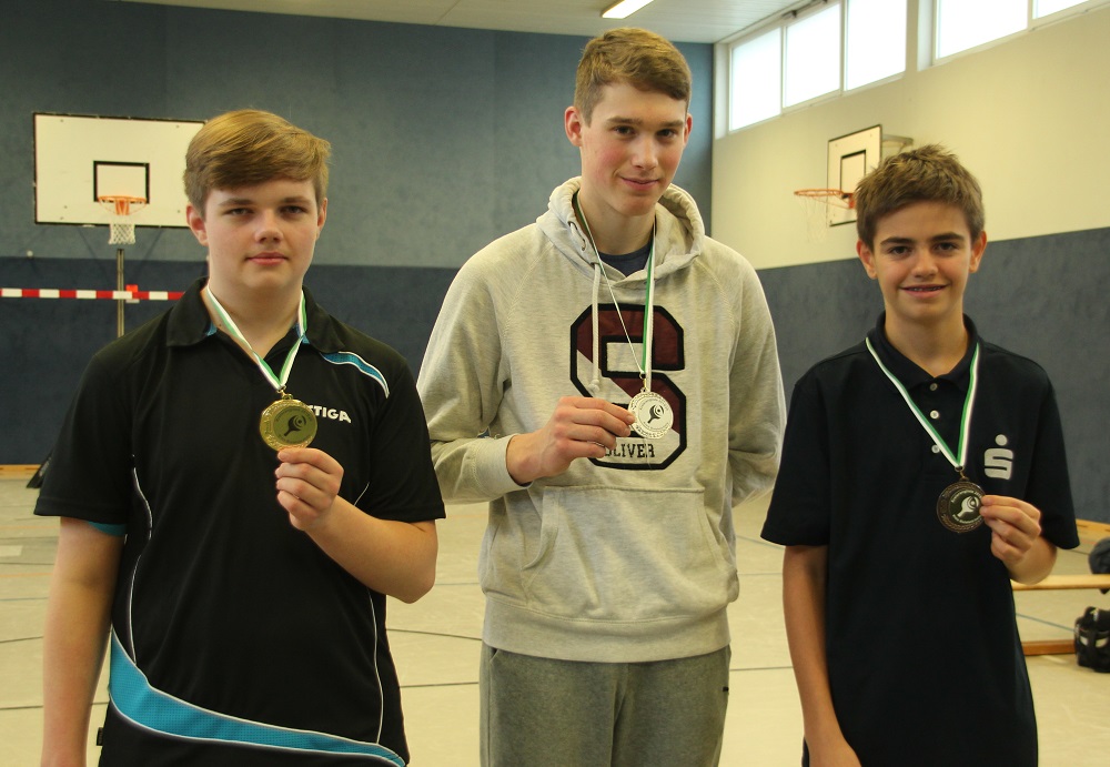 Bei den Jungen 15 setzte sich Jan Lakämper (SV Brackwede) ebenfalls ungeschlagen mit 5:0 Spiele durch und verlor nur jeweils 1 Satz gegen Lasse Braun und Mailo Bressem. Verdienter Lohn die Goldmedaille. Die Silbermedaille holte sich Lasse Braun (TSVE 1890 Bielefeld) mit 3:2 Spiele/12:7 Sätze – knapp vor David Böse (TuS Jöllenbeck), der bei ebenfalls 3:2 Spiele das schlechtere Satzverhältnis (10:9) hatte und den 3. Platz belegte.