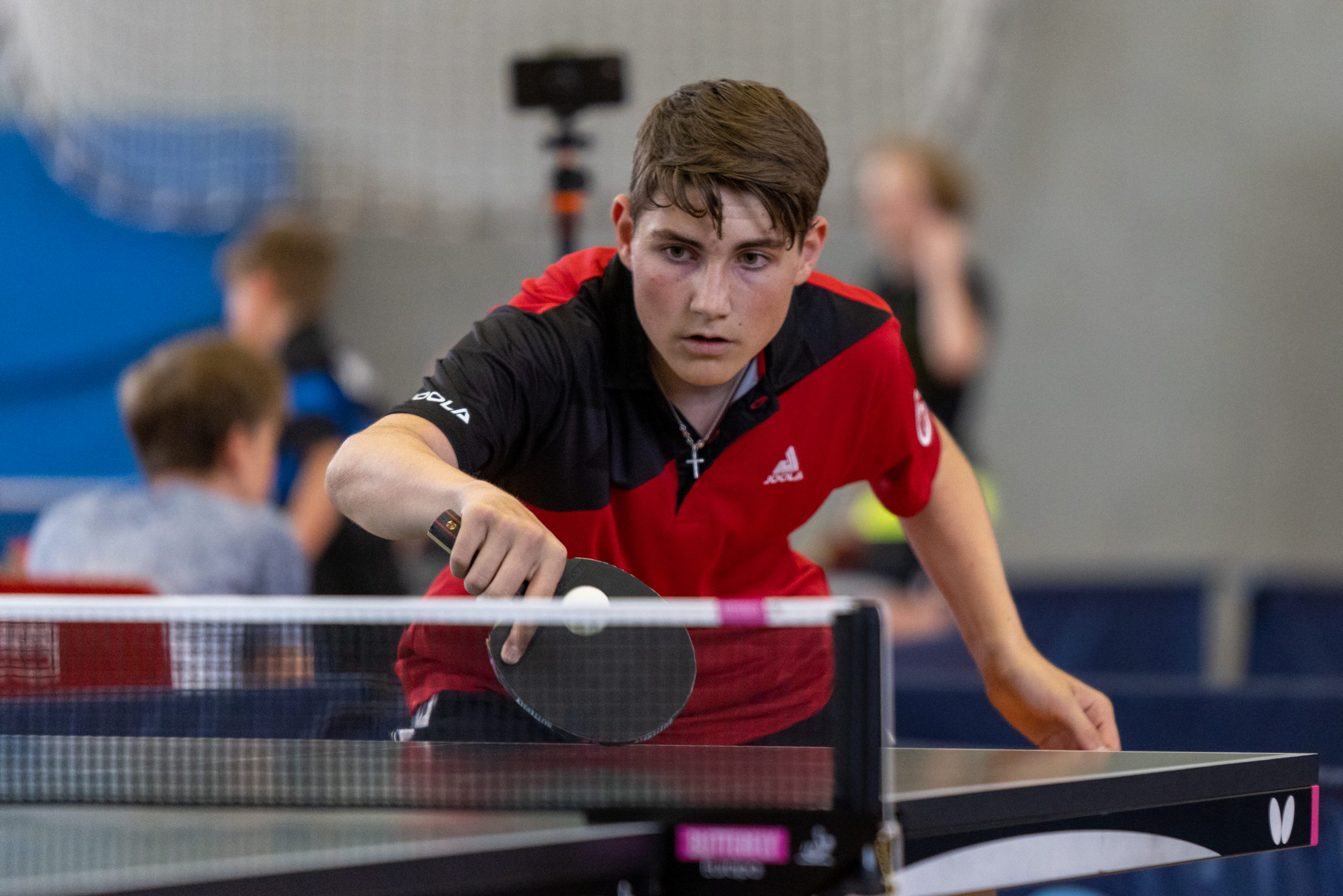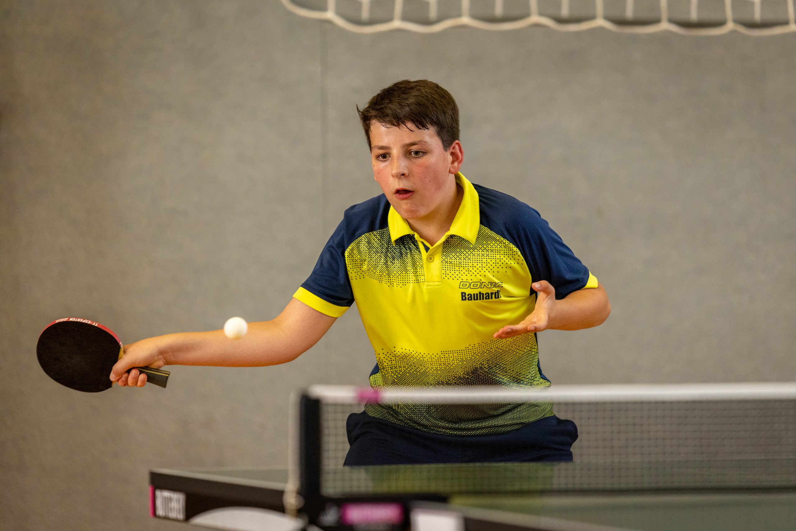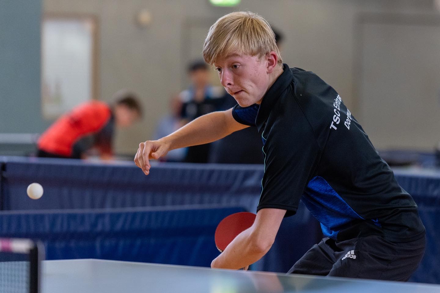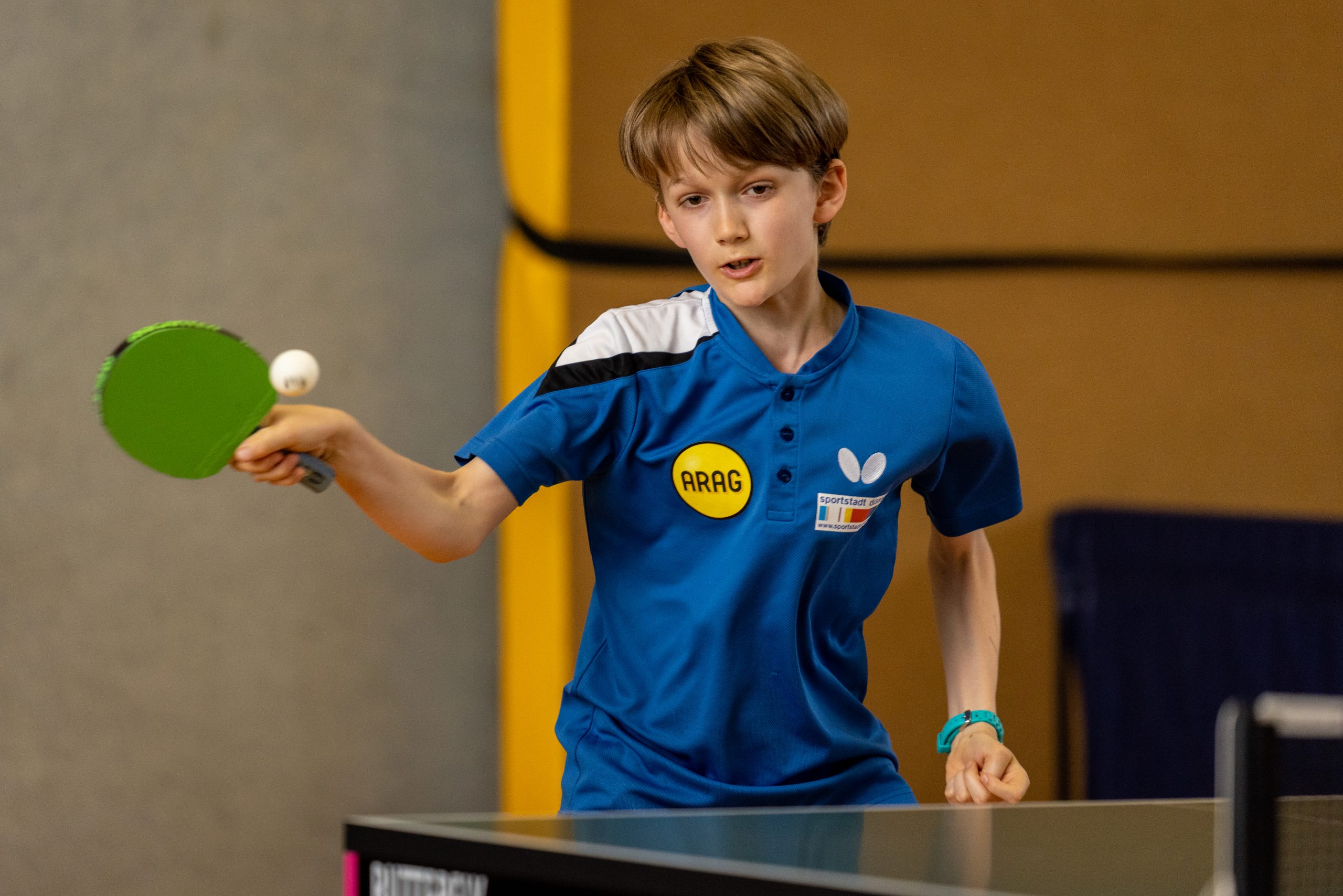 Die Jungen spielten zunächst in acht Vierergruppen, dabei qualifizierten sich die beiden Erstplatzierten für das KO-Feld der Plätze 1-16, die Dritt- und Viertplatzierten spielten anschließend um die Plätze 17-32. Drei der vier Topgesetzen erreichten im Turnierverlauf das Halbfinale, lediglich Silas Voepel (TTVg WRW Kleve) musste sich in einem sehr spannenden Viertelfinale, welches über die volle Distanz von fünf Sätzen ging, dem an fünf gesetzten Matthias Jax (Borussia Düsseldorf) geschlagen geben. Ähnlich spannend sollte es anschließend weiter gehen, im ersten Halbfinale konnte sich Sebastian Lenz (TuS Hiltrop) gegen Matthias Jax in vier Sätzen durchsetzen. Das andere Halbfinale sollte wiederrum erst im fünften Satz entschieden werden. Hier gewann Dorian Lheriau (Borussia Düsseldorf) gegen Mats Bauhardt (TTC Lövenich). Im Finale standen sich somit Sebastian Lenz und Dorian Lheriau gegenüber und hier zeigten beide nochmal, warum sie im Finale standen. In einem Spiel mit vielen langen und umkämpften Ballwechseln konnte Sebastian im vierten Satz den Sack zumachen und den Turniersieg einfahren. Im Spiel um Platz 3 setzte sich Matthias Jax, ebenfalls in vier Sätzen, gegen Mats Bauhardt durch.