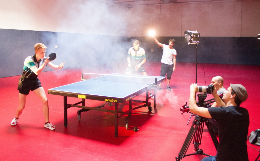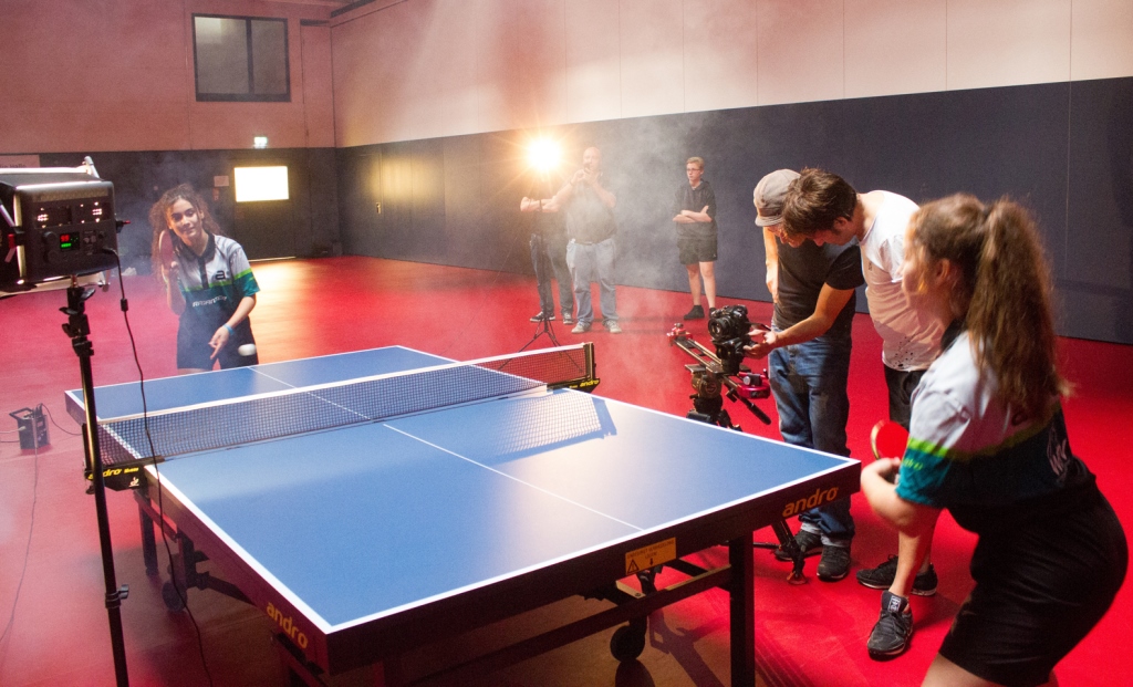 Ob Sie Lampenfieber hat? Keine Spur! Also ran an den Tisch und ein Topspin nach dem anderen. Tom und seine Kollegen staunen nicht schlecht und sind froh, dass die geplanten Bilder schnell „im Kasten“ sind. Apropos „Kasten“: Die Kamera für diesen Dreh ist auf Hochgeschwindigkeit ausgelegt und kostet so viel wie ein Kleinwagen. Tom ist ein Profi eben.