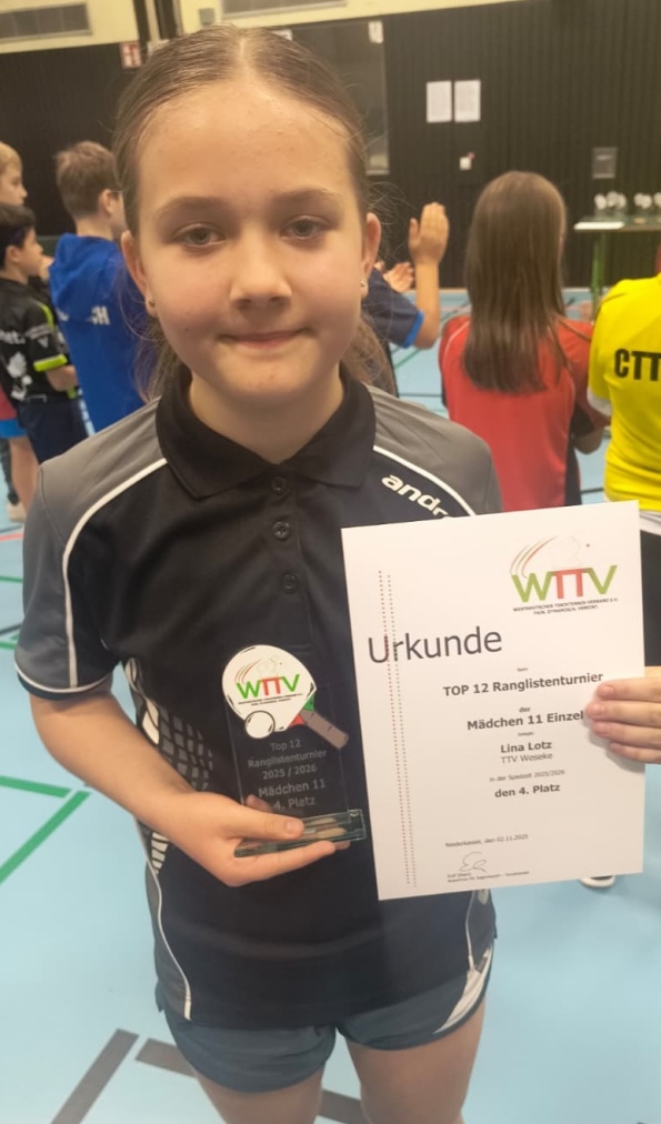 Am vergangenen Wochenende glänzte Lina Lotz (TTV Weseke) beim WTTV-TOP-12-Ranglistenturnier der elfjährigen Mädchen in Niederkassel. Mit fünf Siegen bei nur drei Niederlagen gegen die am Ende vor ihr Platzierten erreichte sie einen ausgezeichneten vierten Platz im starken Teilnehmerfeld. Dabei musste sie alleine viermal über die volle Distanz von fünf Sätzen gehen und hatte auch gegen die „Großen Drei“ durchaus Siegchancen. Zu diesem ausgezeichneten Erfolg trägt sicher auch das leistungsorientierte Training am Stützpunkt Borken bei. Bei den Jungen TOP-16-Klassement der gleichaltrigen Jungen gelang Vincent Horsel (SC Südlohn) Rang 12.