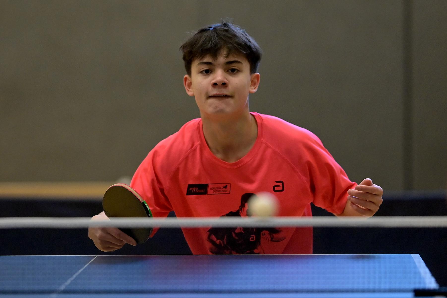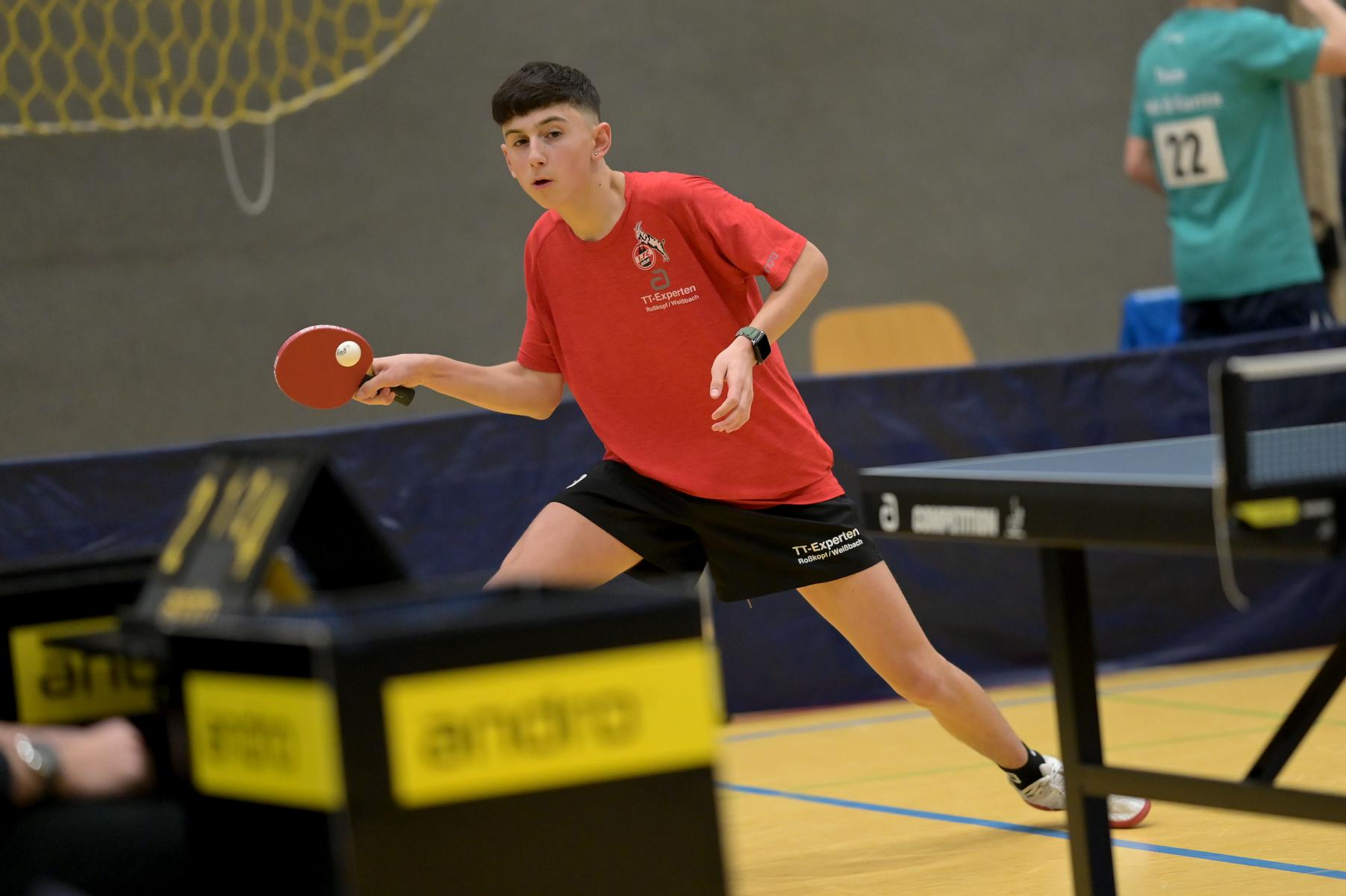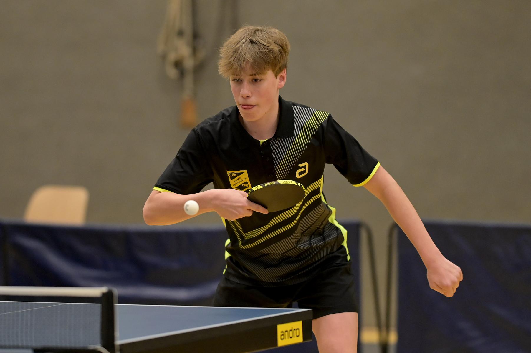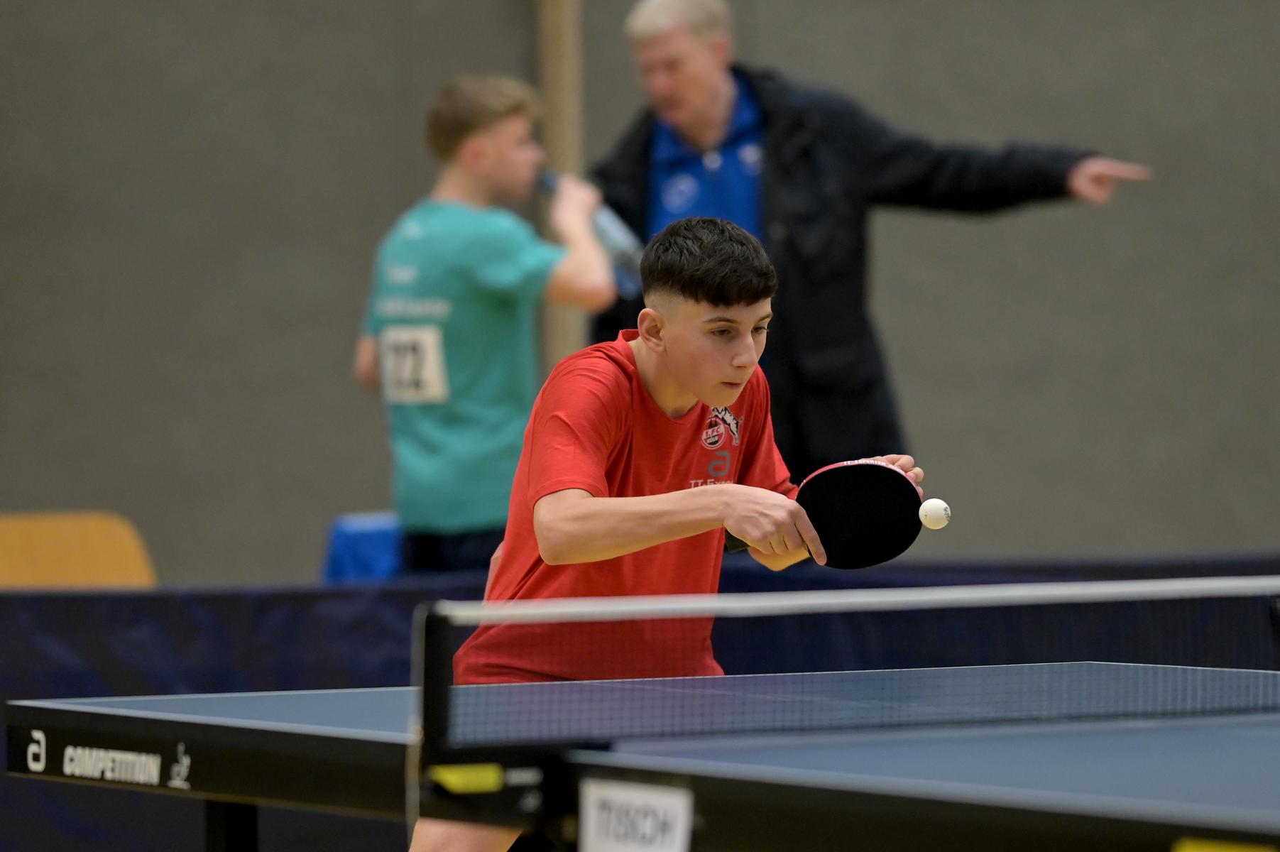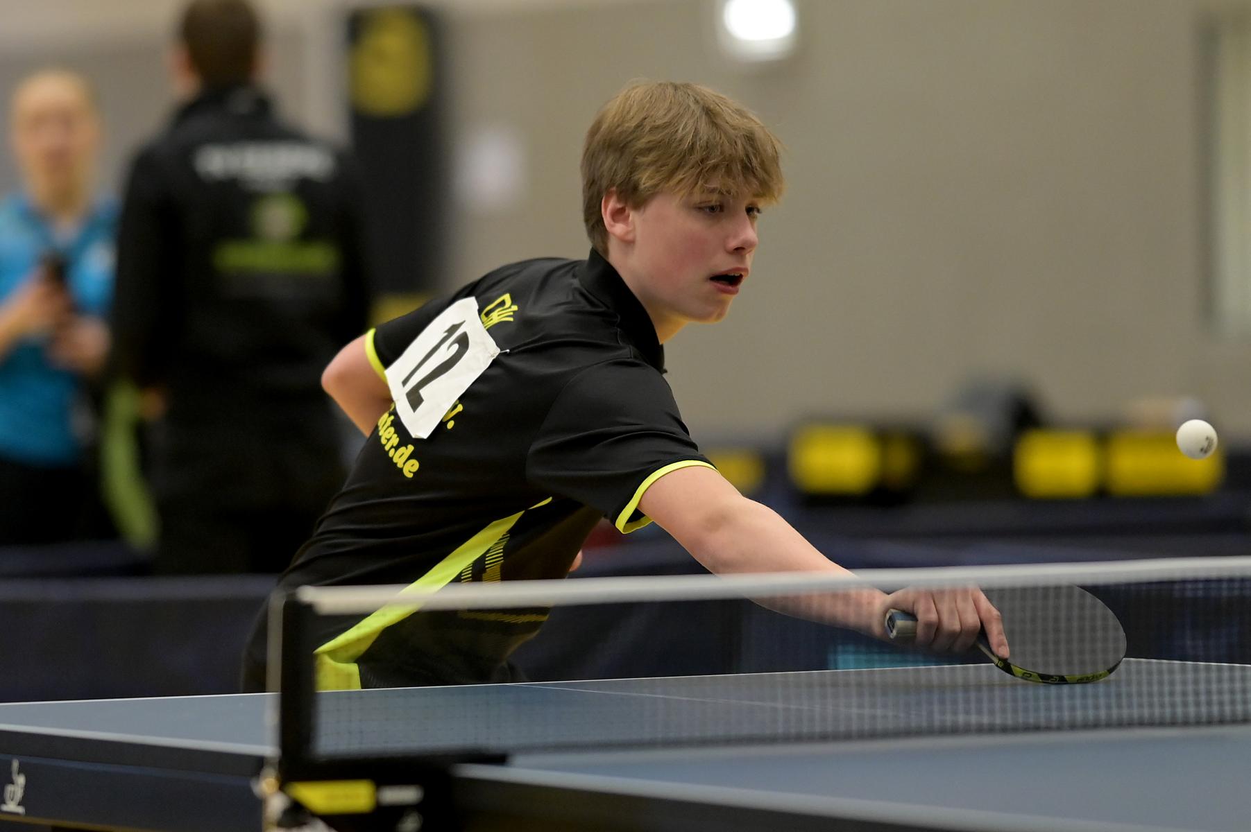 Bei den Jungen erreichte Top-Favorit Ole Brock ( TTC DJK Bad Westernkotten) souverän das Finale. Im gegenüber stand Finn Stockmann (Spvgg. Meiderich 06/95), der an diesem Wochenende ein tolles Turnier spielte und seine Chance nutzte, denn in der unteren Hälfte der KO-Runde „stolperten“ einige Favoriten. So kam es im Halbfinale zu den Paarungen Finn Stockmann gegen Amandus Vogl (TTC Bärbroich) und Ole spielte gegen Rahdeen Haghighat (1. FC Köln). Sowohl Finn als auch Ole gaben hier lediglich einen Satz ab und erreichten durch ihre 3:1-Siege das Finale.