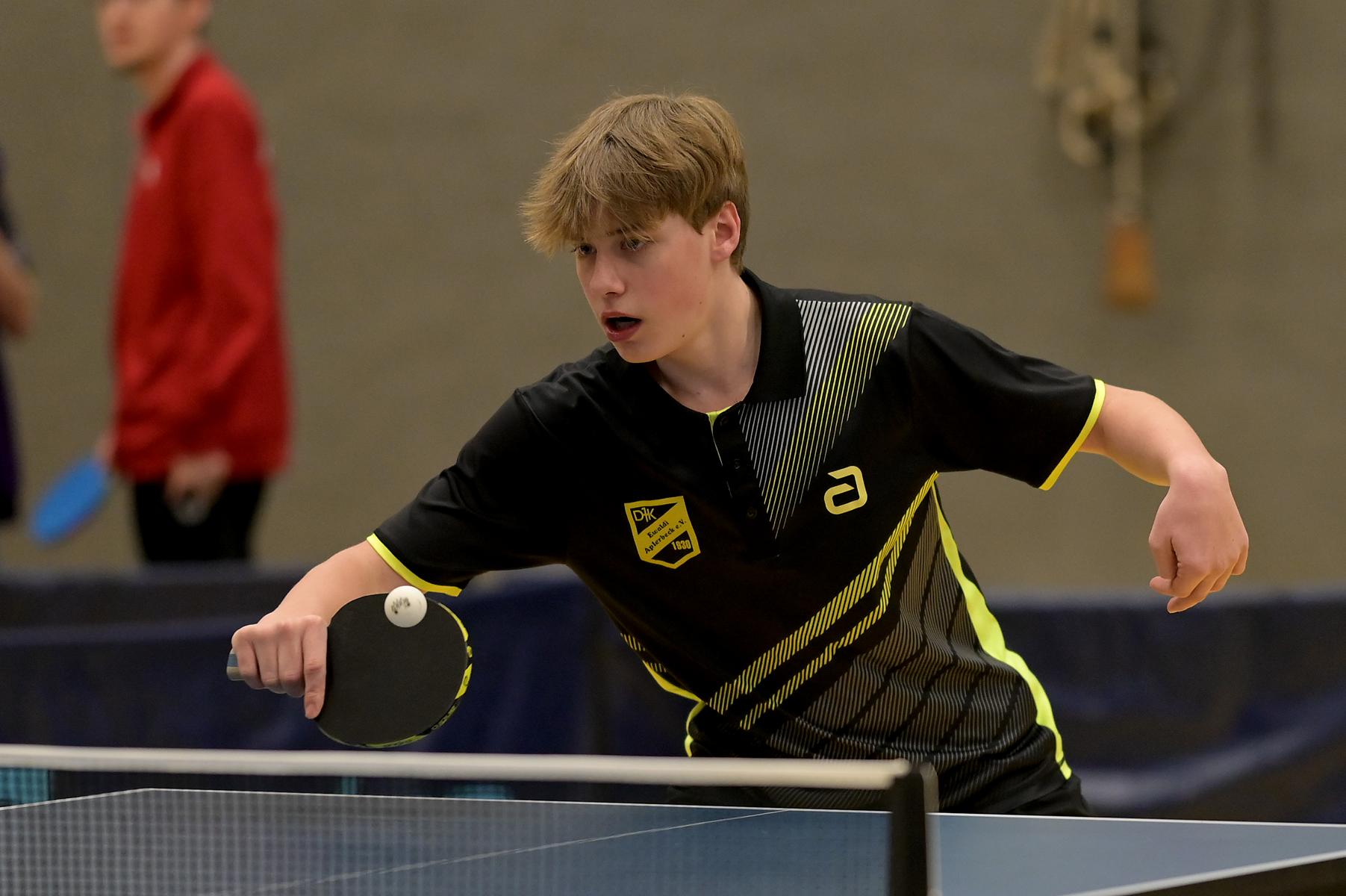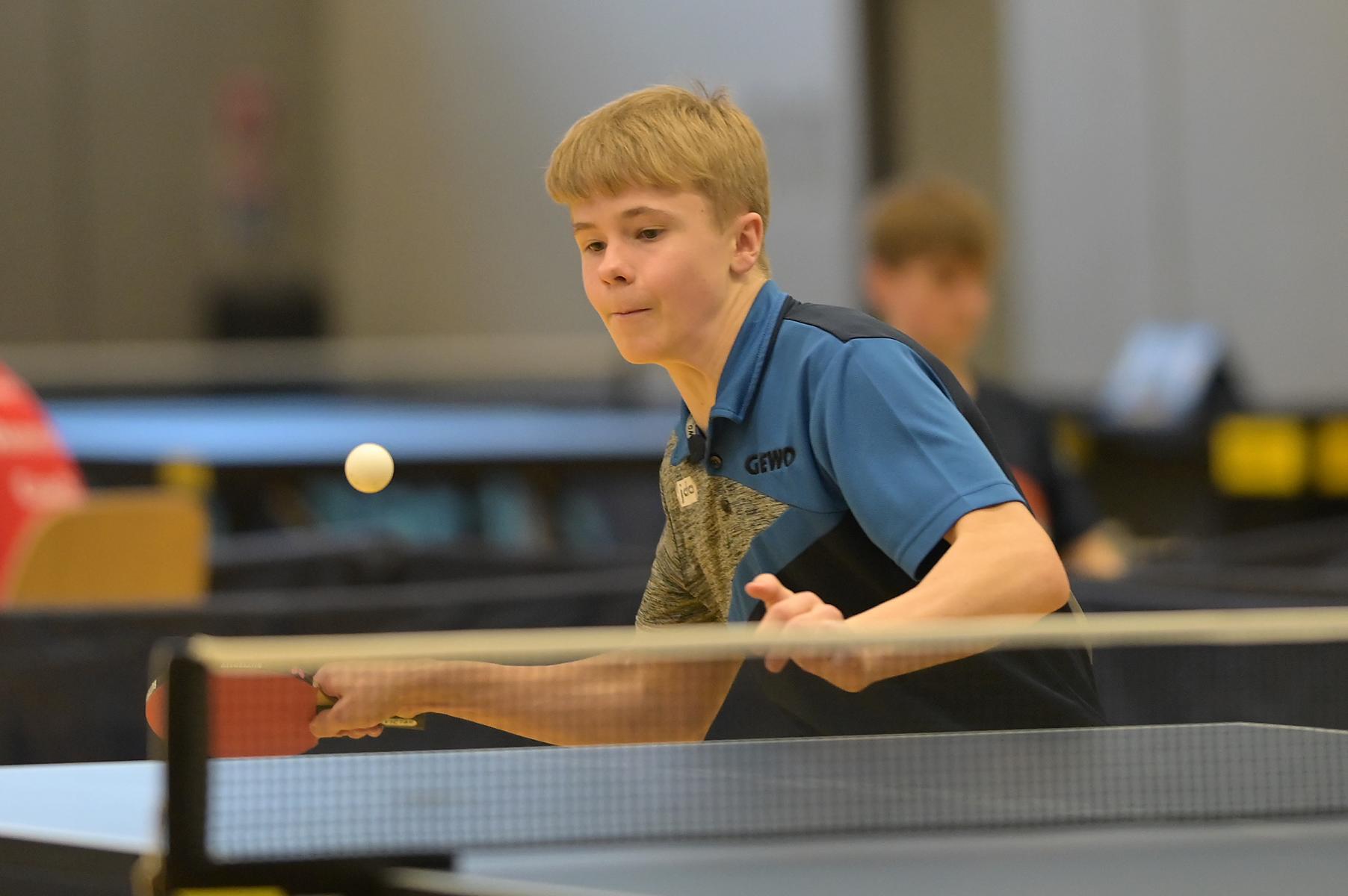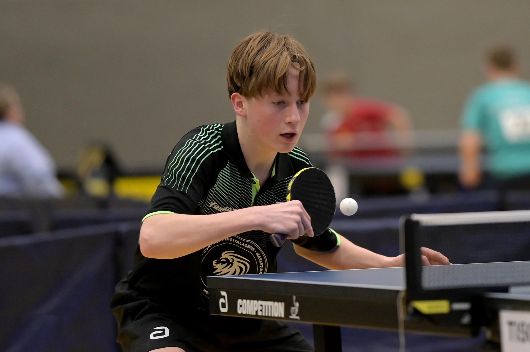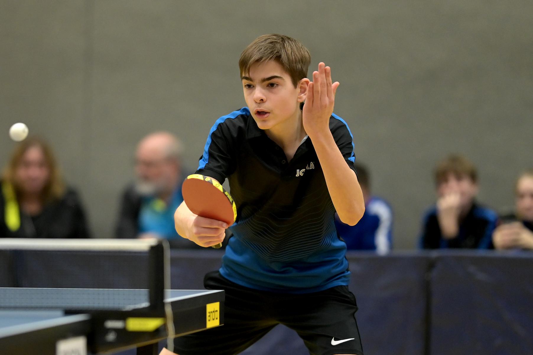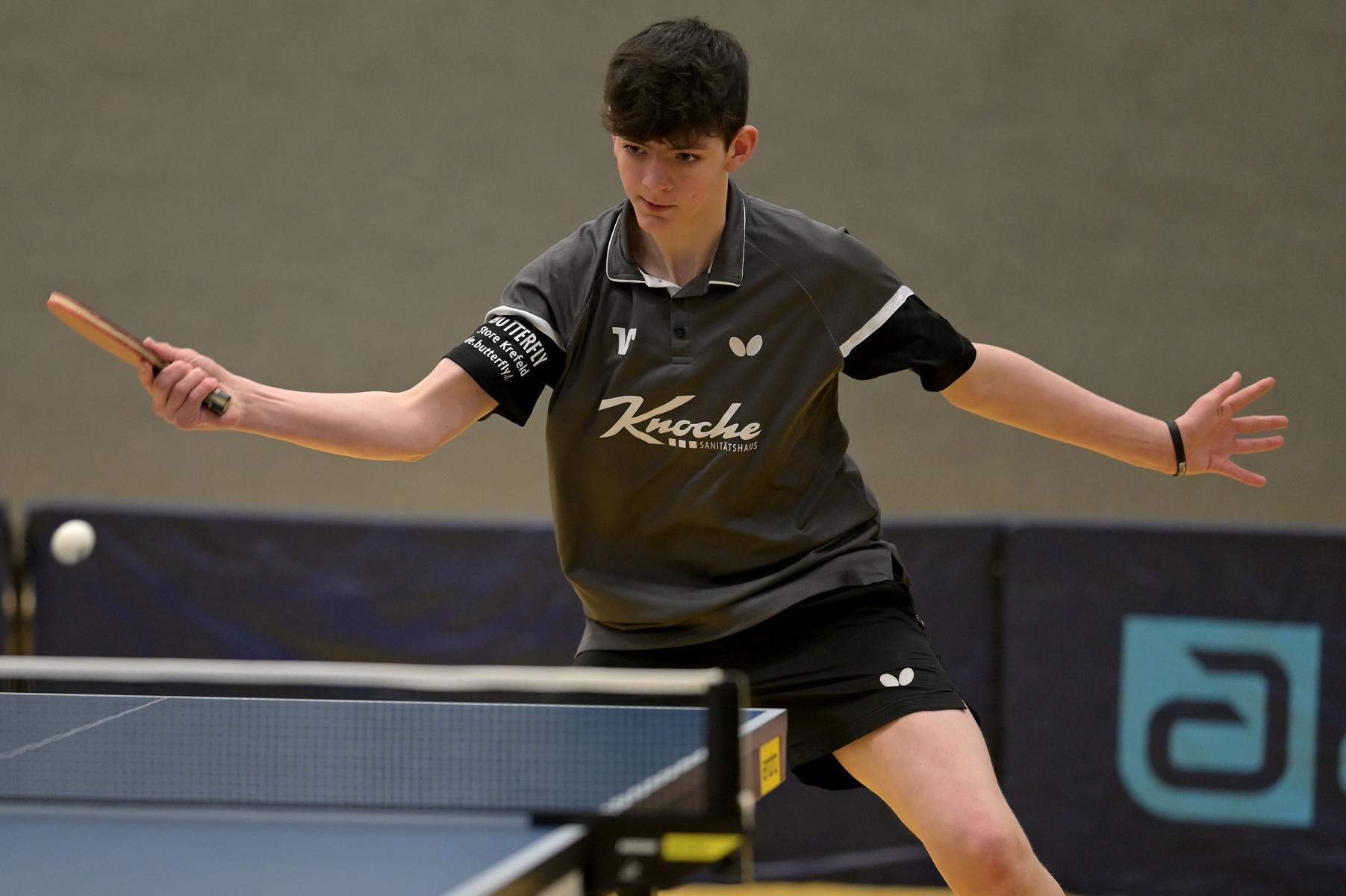 Bei den Jungen erreichte Top-Favorit Ole Brock ( TTC DJK Bad Westernkotten) souverän das Finale. Im gegenüber stand Finn Stockmann (Spvgg. Meiderich 06/95), der an diesem Wochenende ein tolles Turnier spielte und seine Chance nutzte, denn in der unteren Hälfte der KO-Runde „stolperten“ einige Favoriten. So kam es im Halbfinale zu den Paarungen Finn Stockmann gegen Amandus Vogl (TTC Bärbroich) und Ole spielte gegen Rahdeen Haghighat (1. FC Köln). Sowohl Finn als auch Ole gaben hier lediglich einen Satz ab und erreichten durch ihre 3:1-Siege das Finale.