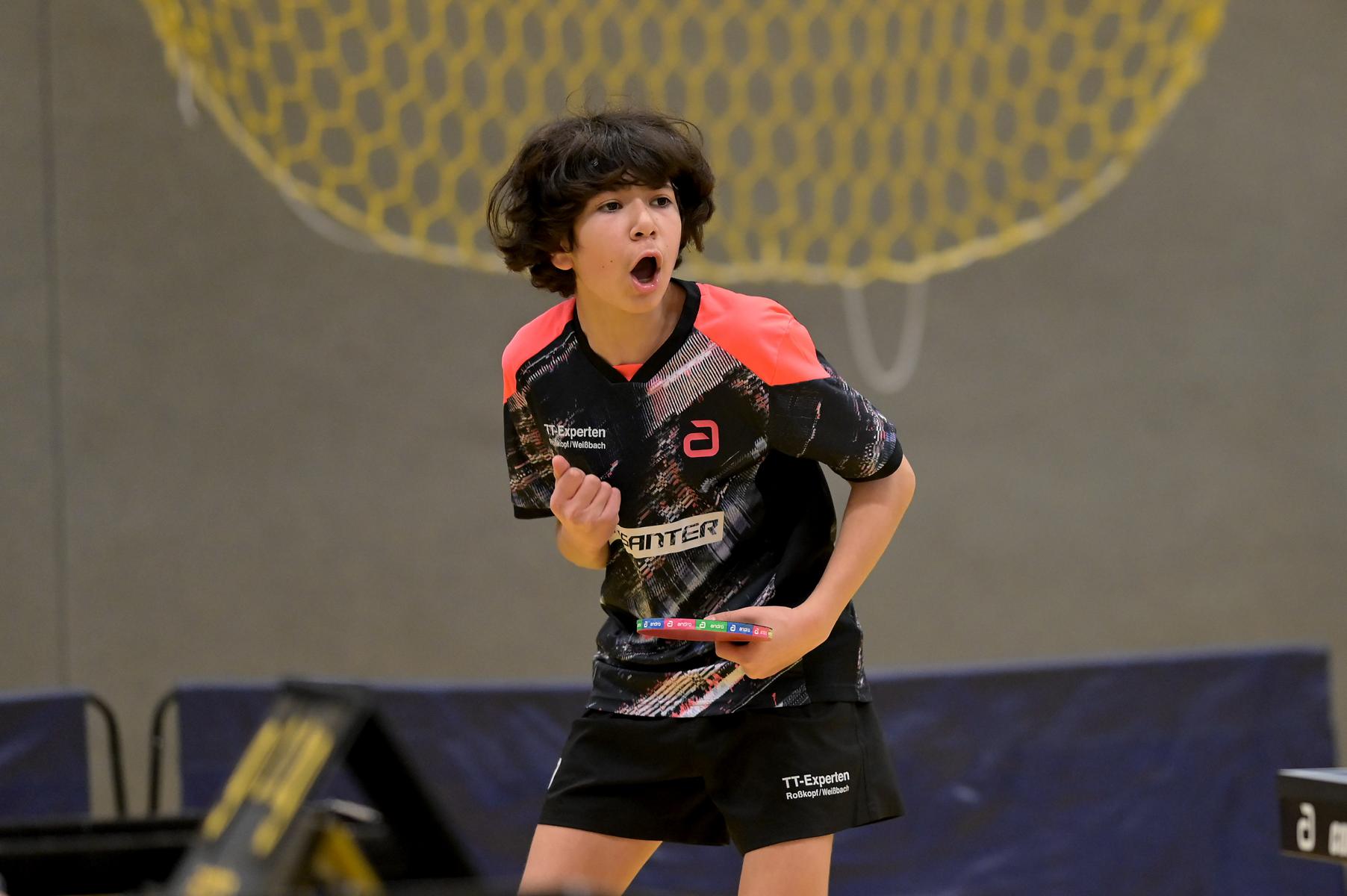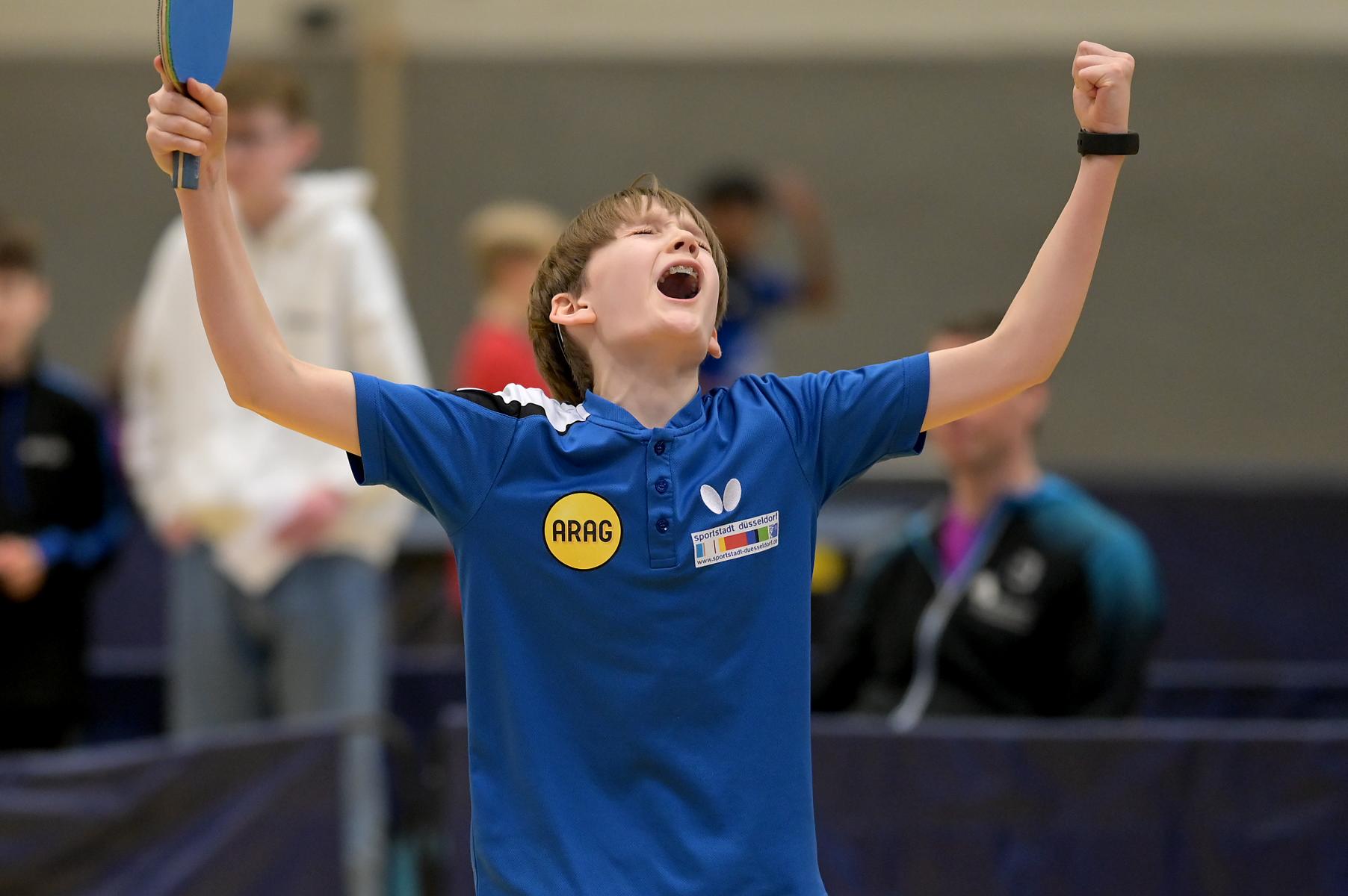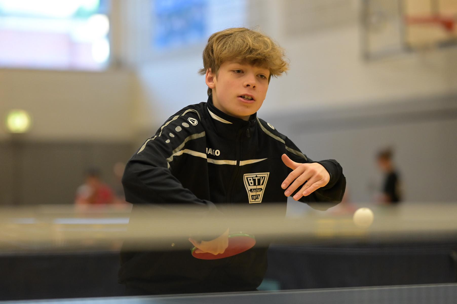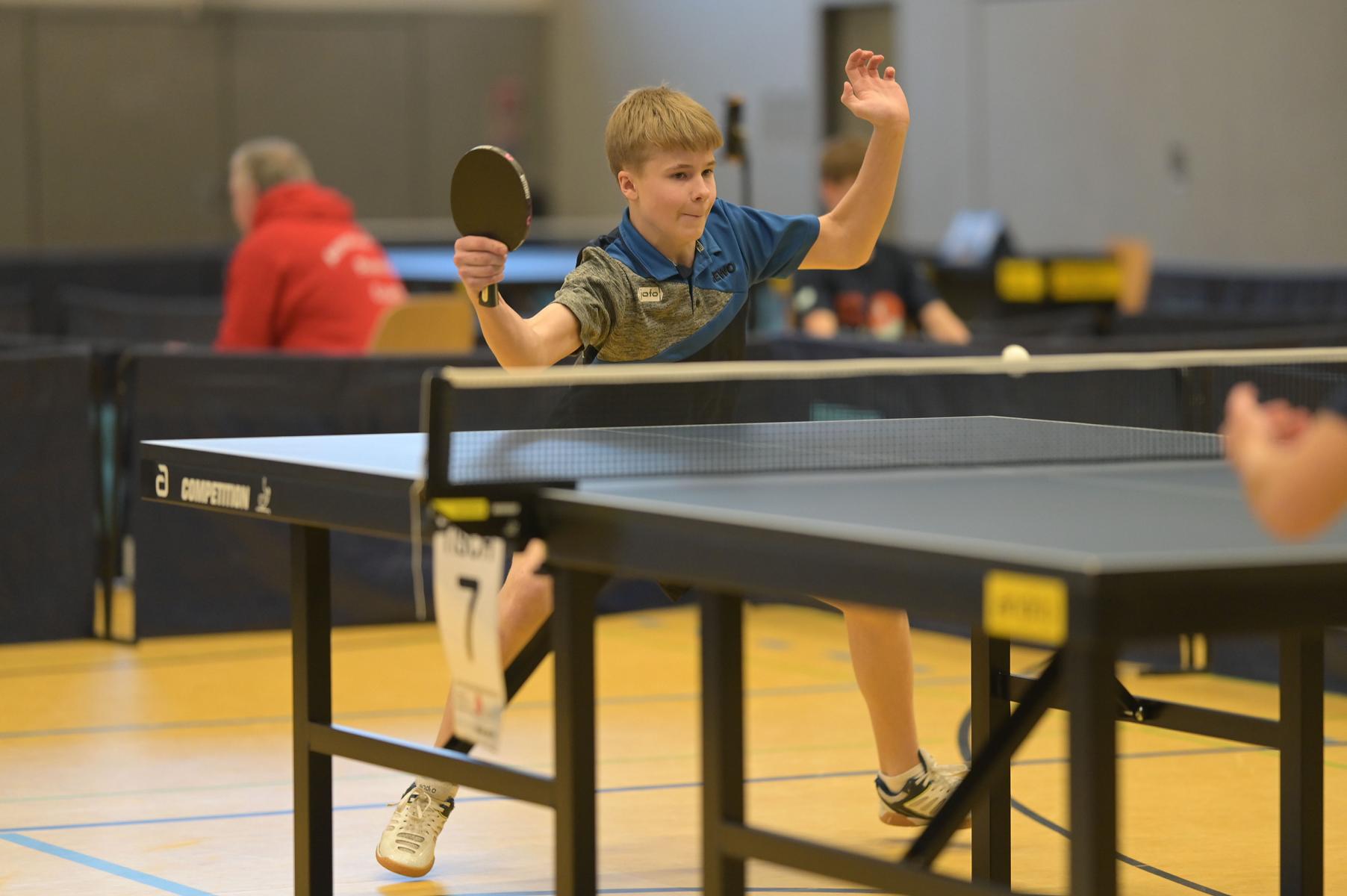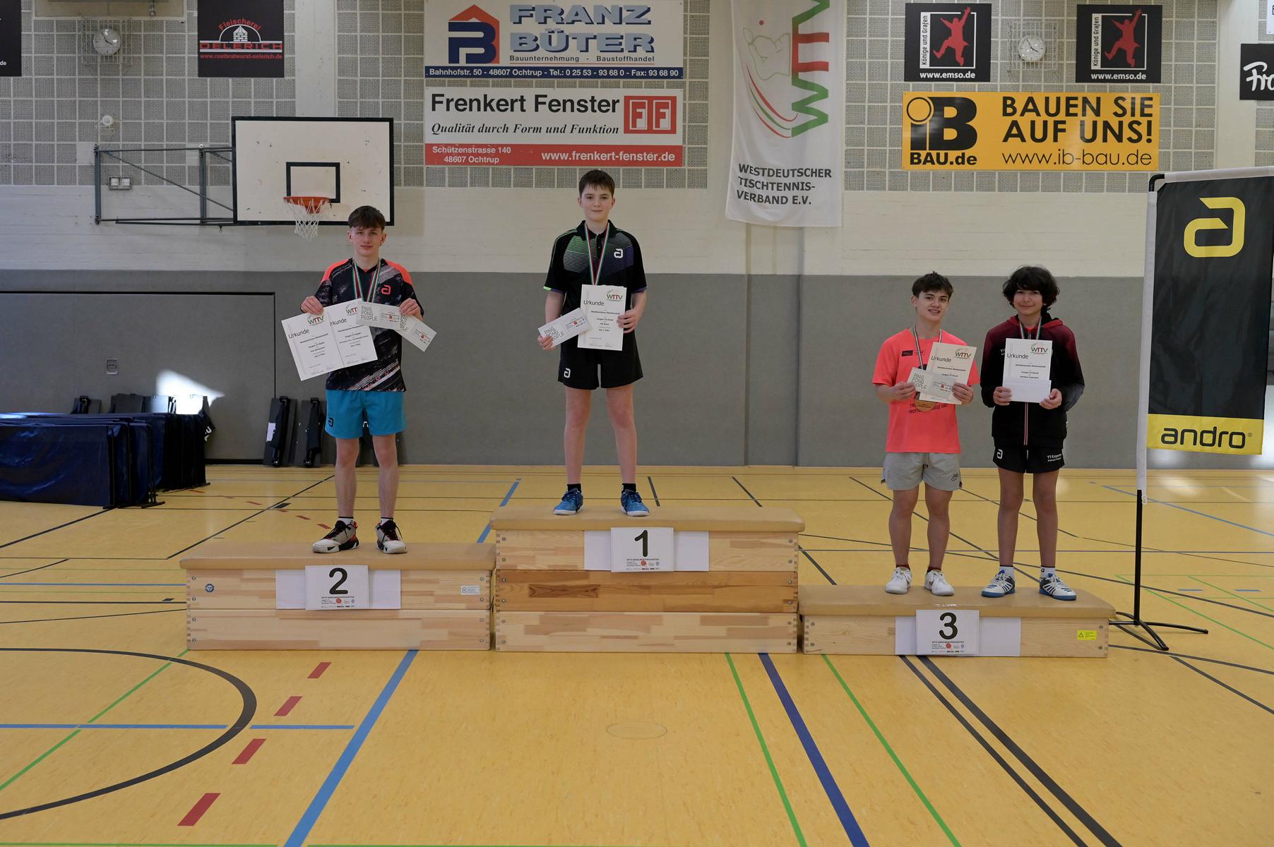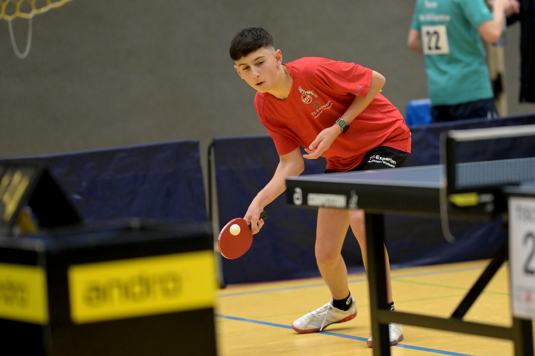 Bei den Jungen erreichte Top-Favorit Ole Brock ( TTC DJK Bad Westernkotten) souverän das Finale. Im gegenüber stand Finn Stockmann (Spvgg. Meiderich 06/95), der an diesem Wochenende ein tolles Turnier spielte und seine Chance nutzte, denn in der unteren Hälfte der KO-Runde „stolperten“ einige Favoriten. So kam es im Halbfinale zu den Paarungen Finn Stockmann gegen Amandus Vogl (TTC Bärbroich) und Ole spielte gegen Rahdeen Haghighat (1. FC Köln). Sowohl Finn als auch Ole gaben hier lediglich einen Satz ab und erreichten durch ihre 3:1-Siege das Finale.