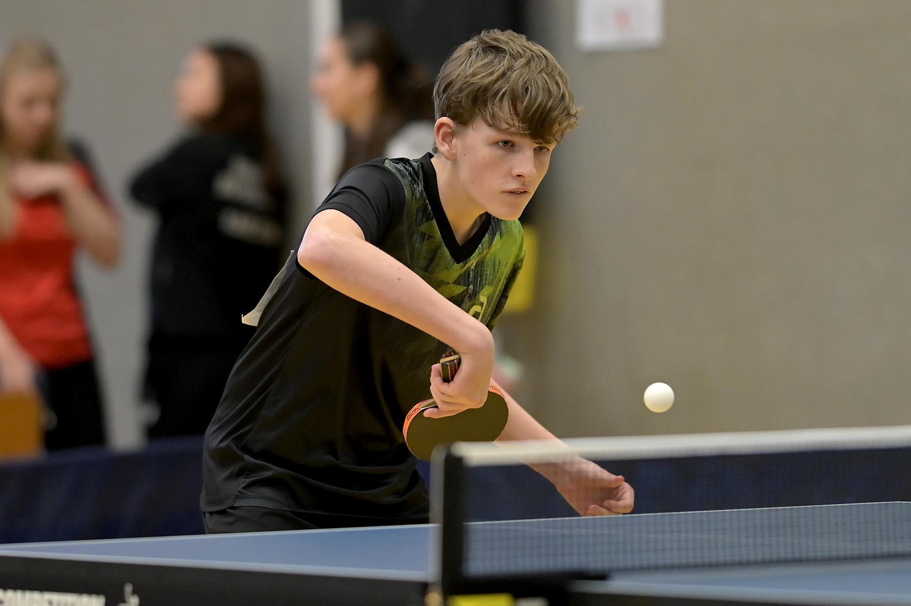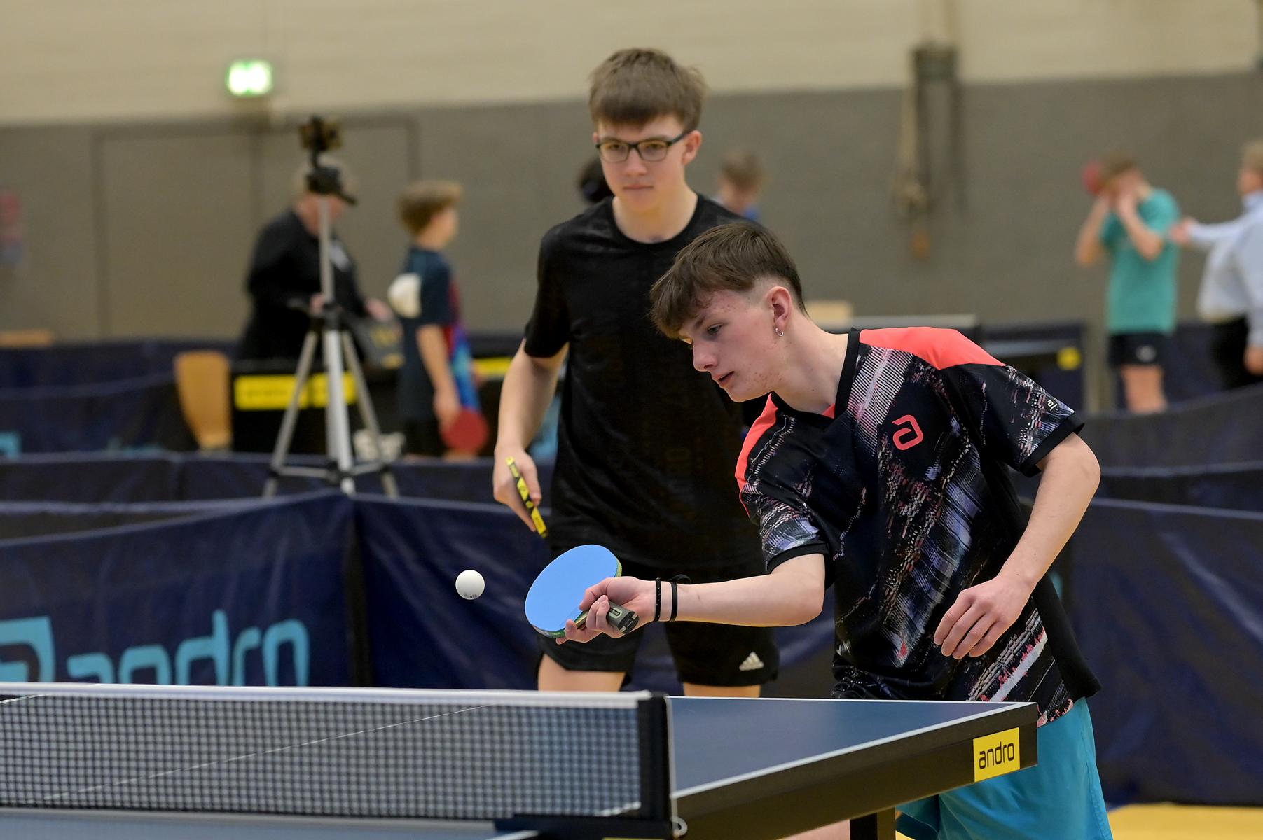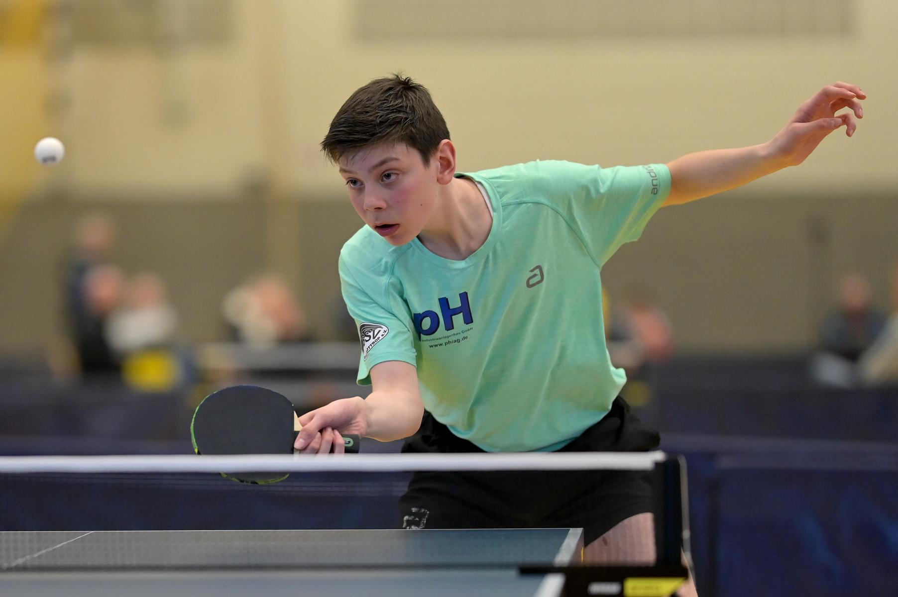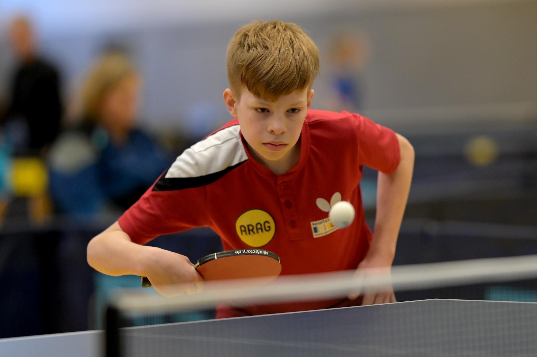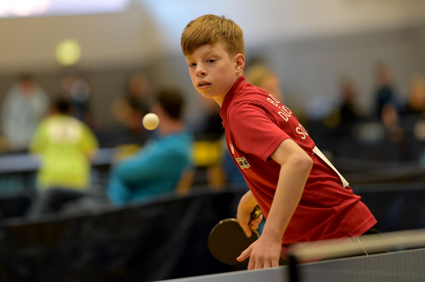 Bei den Jungen erreichte Top-Favorit Ole Brock ( TTC DJK Bad Westernkotten) souverän das Finale. Im gegenüber stand Finn Stockmann (Spvgg. Meiderich 06/95), der an diesem Wochenende ein tolles Turnier spielte und seine Chance nutzte, denn in der unteren Hälfte der KO-Runde „stolperten“ einige Favoriten. So kam es im Halbfinale zu den Paarungen Finn Stockmann gegen Amandus Vogl (TTC Bärbroich) und Ole spielte gegen Rahdeen Haghighat (1. FC Köln). Sowohl Finn als auch Ole gaben hier lediglich einen Satz ab und erreichten durch ihre 3:1-Siege das Finale.