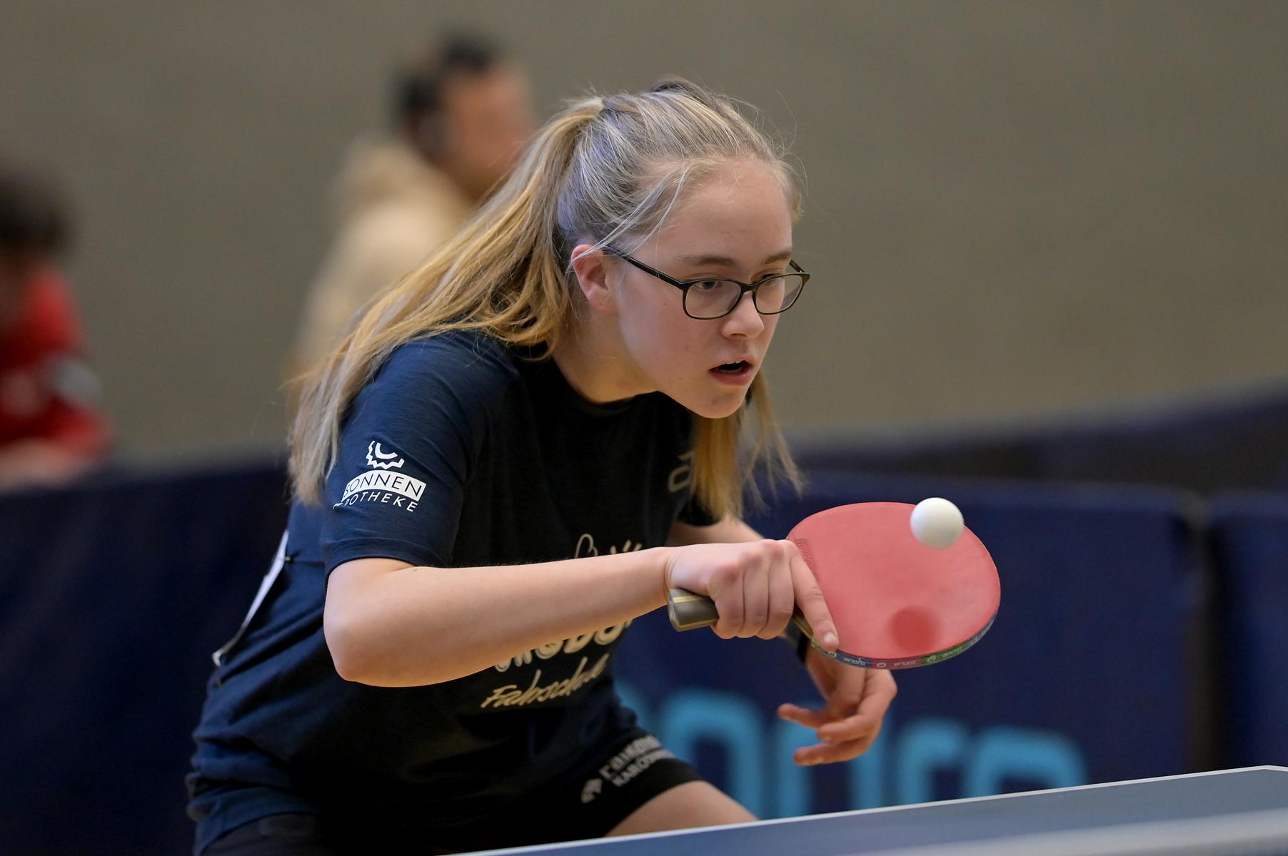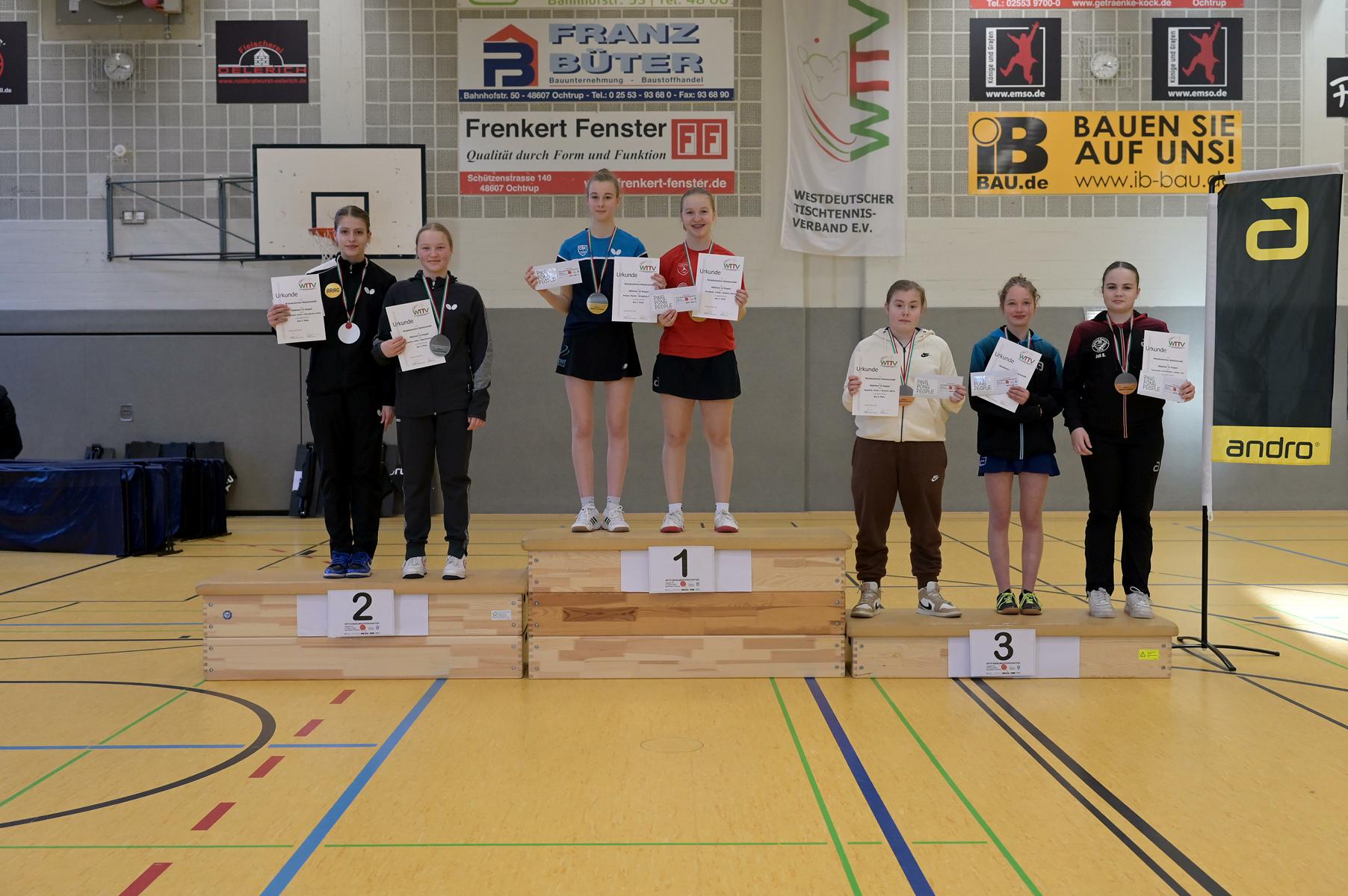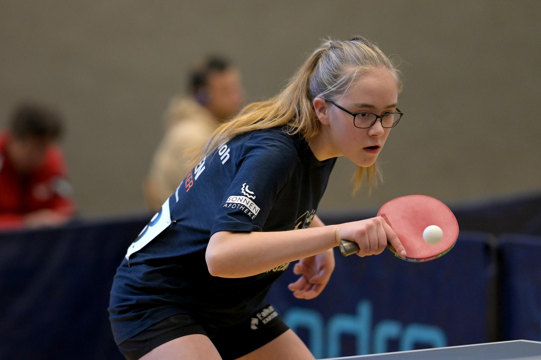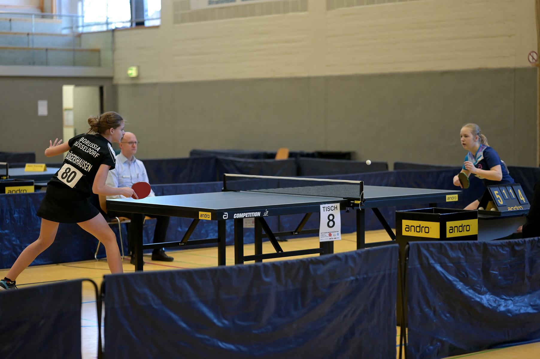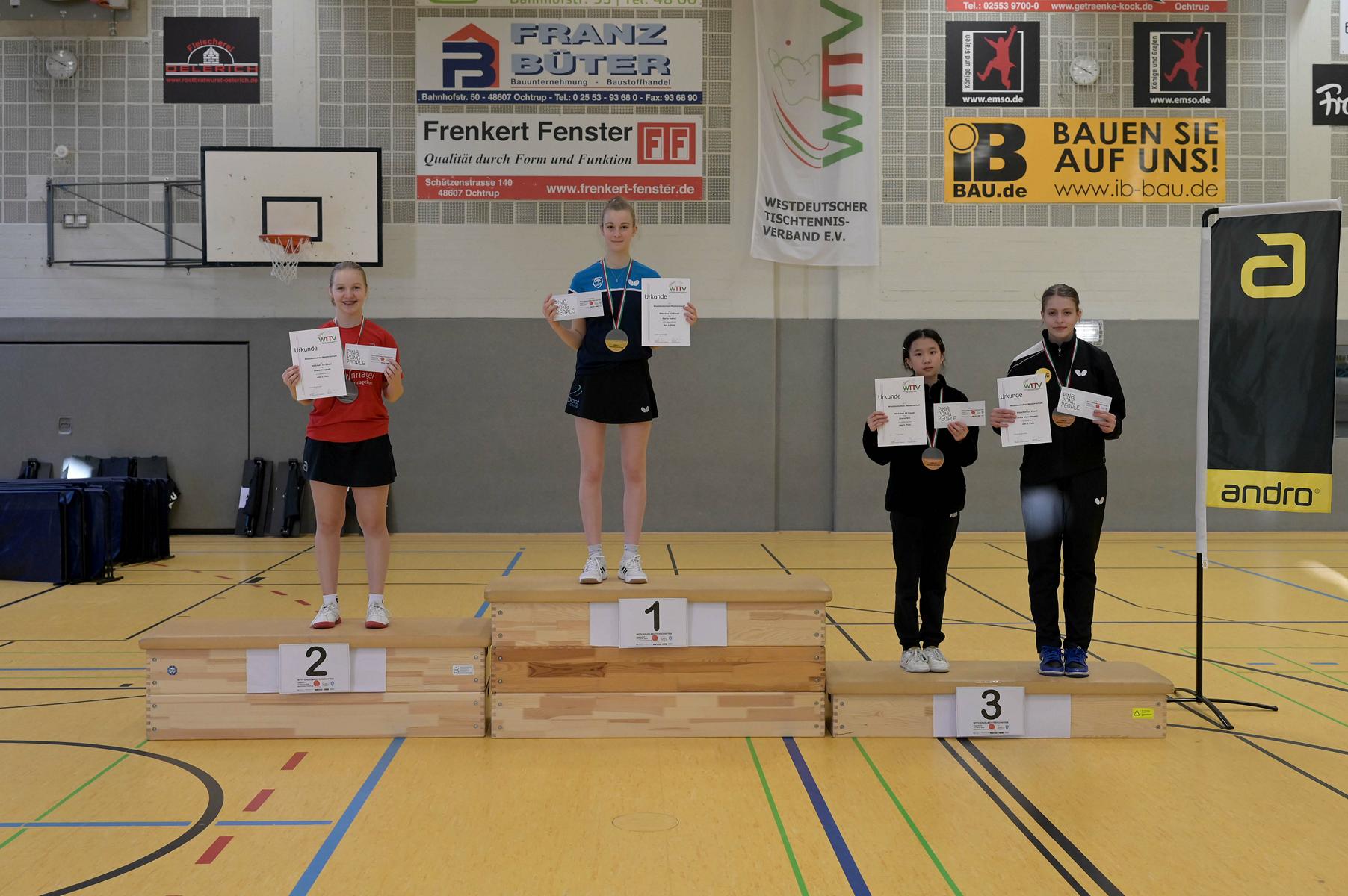 Im Mädchen-Einzel erreichten alle vier Gesetzten, Mariia Bodnar (DJK BW Annen), Linyun Wei (TG Neuss), Greta Bögershausen (Borussia Düsseldorf) und Frieda Strugholz (TTC DJK Bad Westernkotten), ohne größere Schwierigkeiten das Halbfinale. Dass die vier Mädchen leistungsmäßig sehr nah beieinander liegen, zeigt, dass die restlichen drei Spiele erst im Entscheidungssatz entschieden wurden. Mariia besiegte in einem sehr spannenden Match in der Vorschlussrunde Linyun mit 12:10 im fünften Satz. Auch das Spiel zwischen Greta und Frieda endete mit nur zwei Bällen Unterschied, hier behielt Frieda mit 11:9 im letzten Satz die Oberhand gegen Greta.