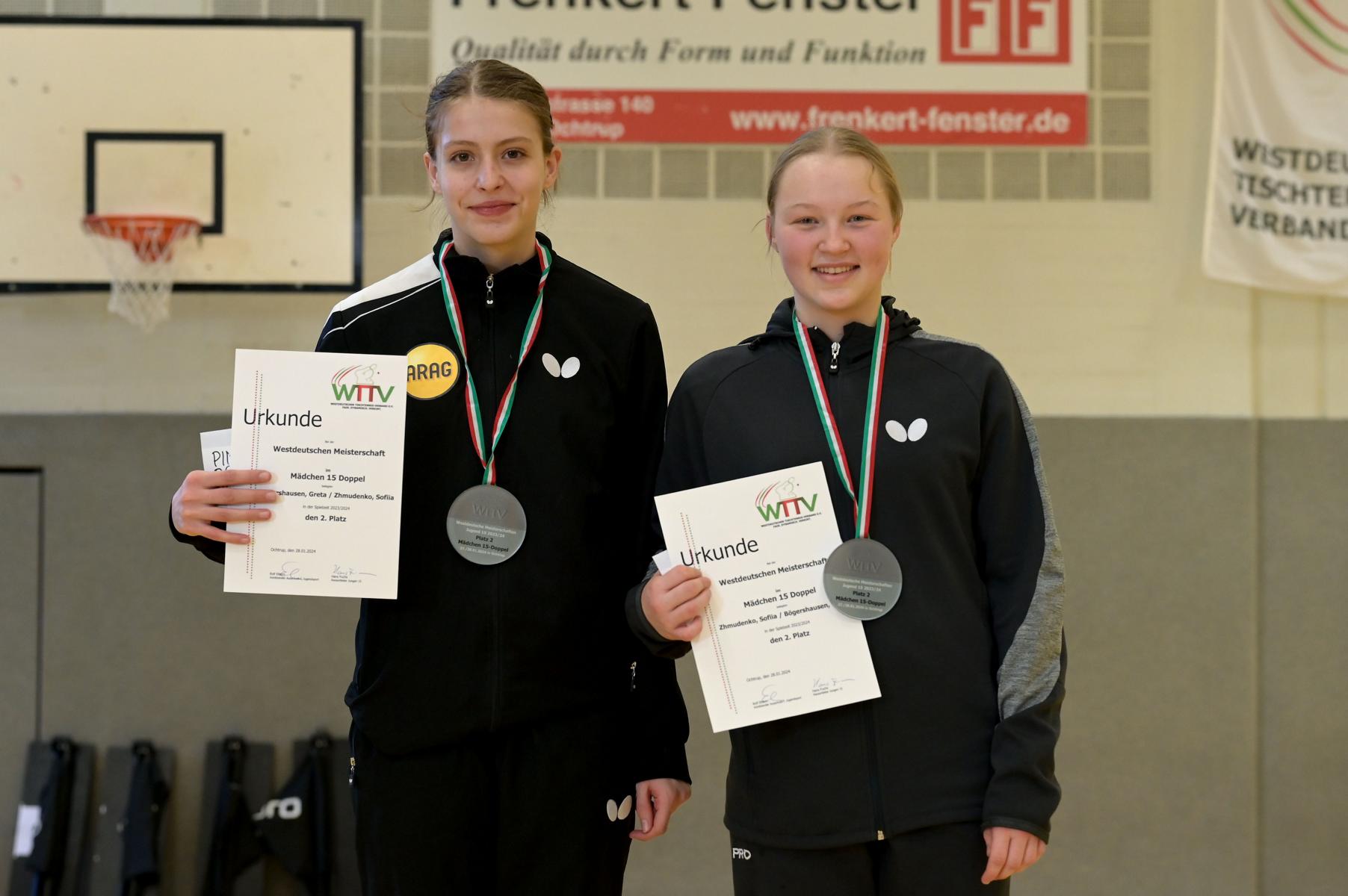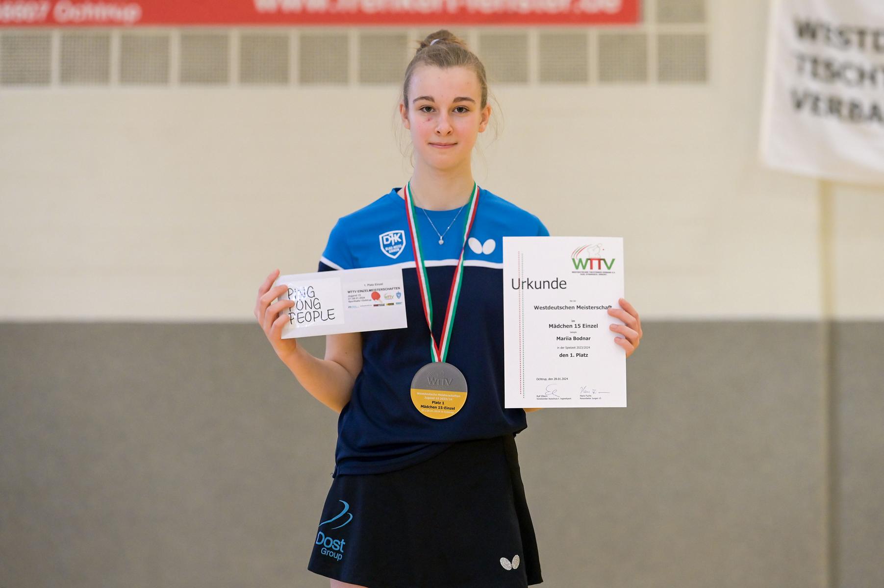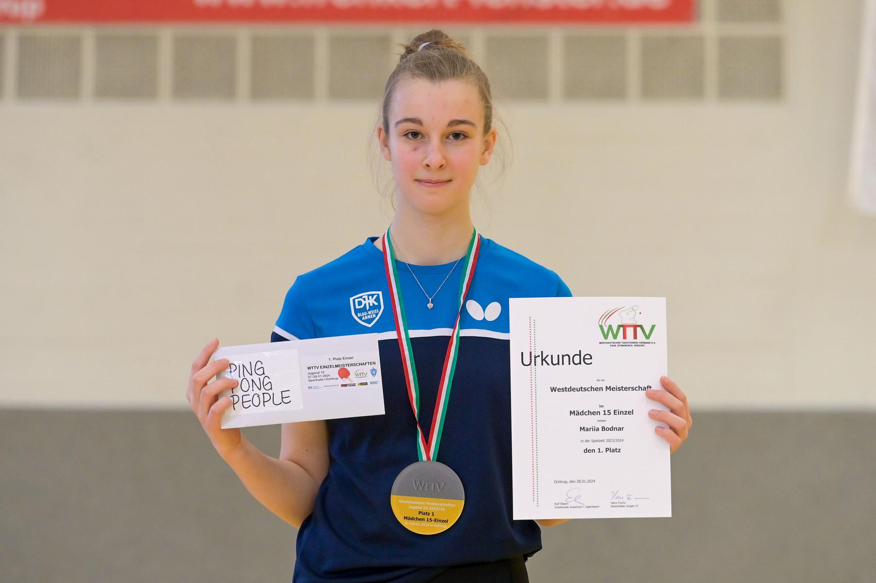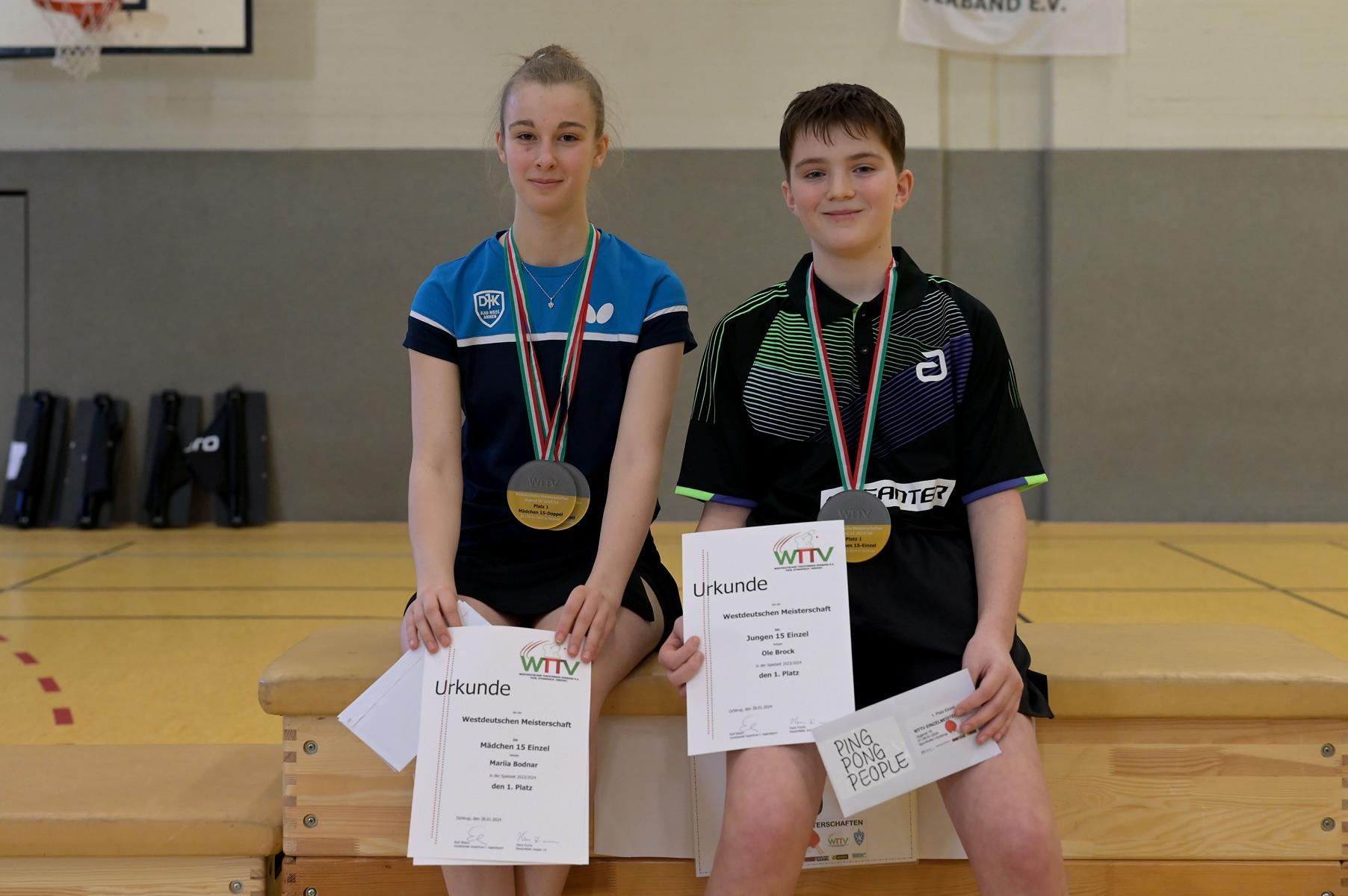 Mariia Bodnar (DJK BW Annen) und Ole Brock (TTC DJK Bad Westernkotten) sind die neuen Westdeutschen Meister der Mädchen 15 und Jungen 15. Ihren zweiten Titel holte sich Mariia im Doppel an der Seite von Frieda Strugholz (TTC DJK Bad Westernkotten). Sieger im Doppel der Jungen wurden Charlie Groninger (Burtscheider TV) und Rahdeen Haghighat (1. FC Köln). Herzlichen Glückwunsch!