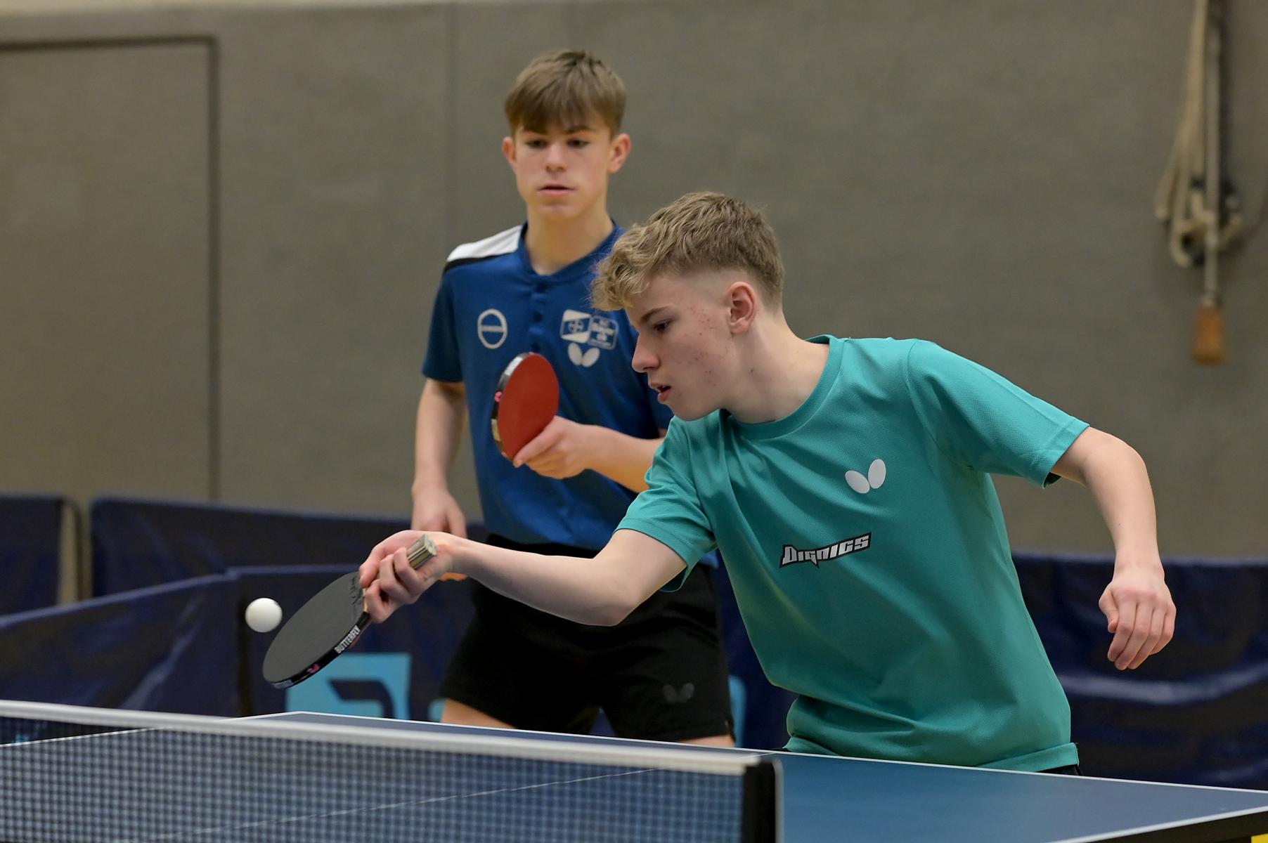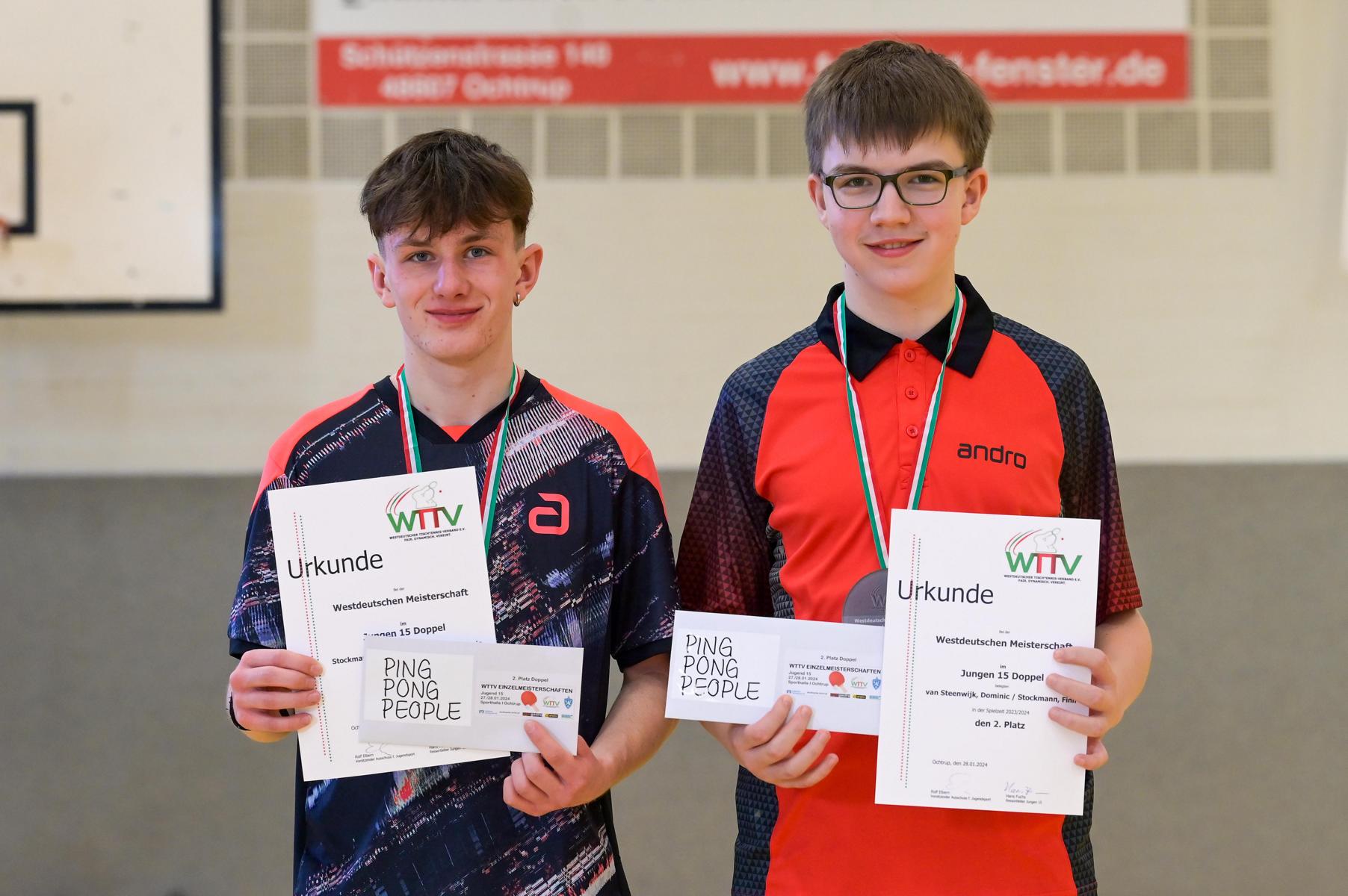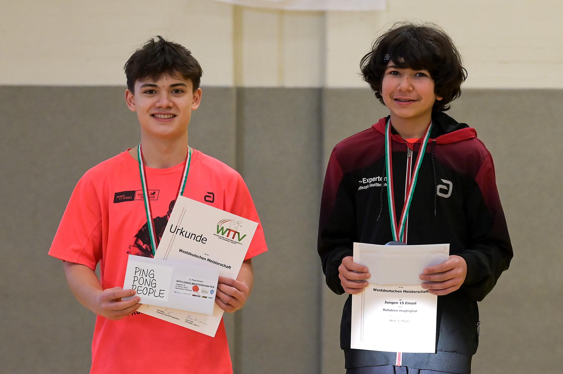 Im Doppelwettbewerb der Jungen erreichten mit Charlie Groninger/Rahdeen Haghighat (Burtscheider TV/1. FC Köln) und Finn Stockmann/Dominic van Steenwijk ( Spvgg. Meiderich 06/95/Anrather TK RW) ebenfalls die an Position eins und zwei gesetzten Paarungen das Finale. Nach verlorenem ersten Satz behielten Charlie und Rahdeen die Nerven, gewannen das Spiel mit 3:1 und damit den Titel des Westdeutschen Meisters Jungen-Doppel.
