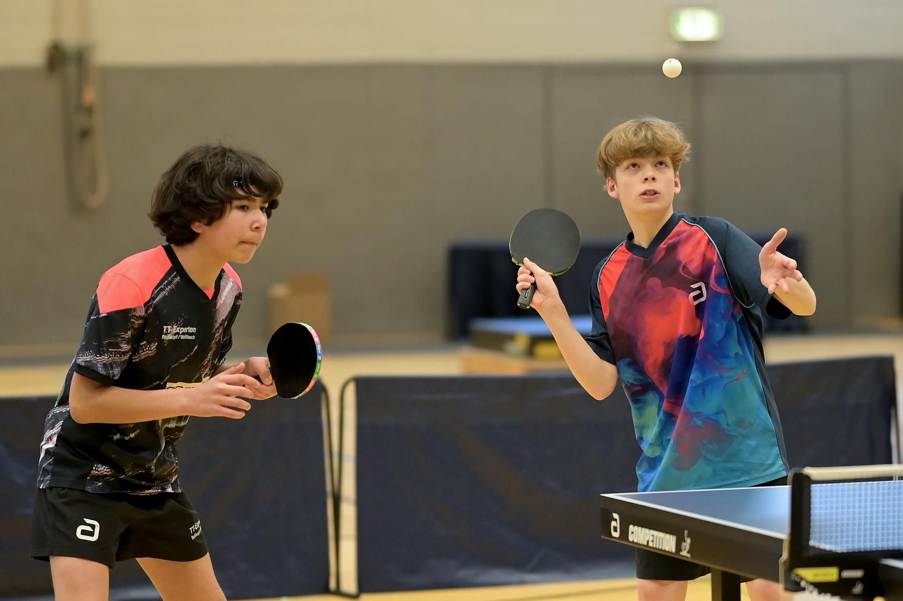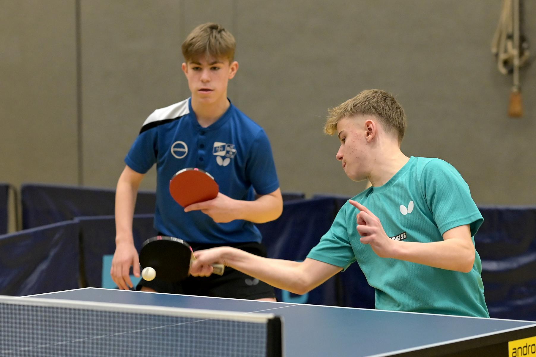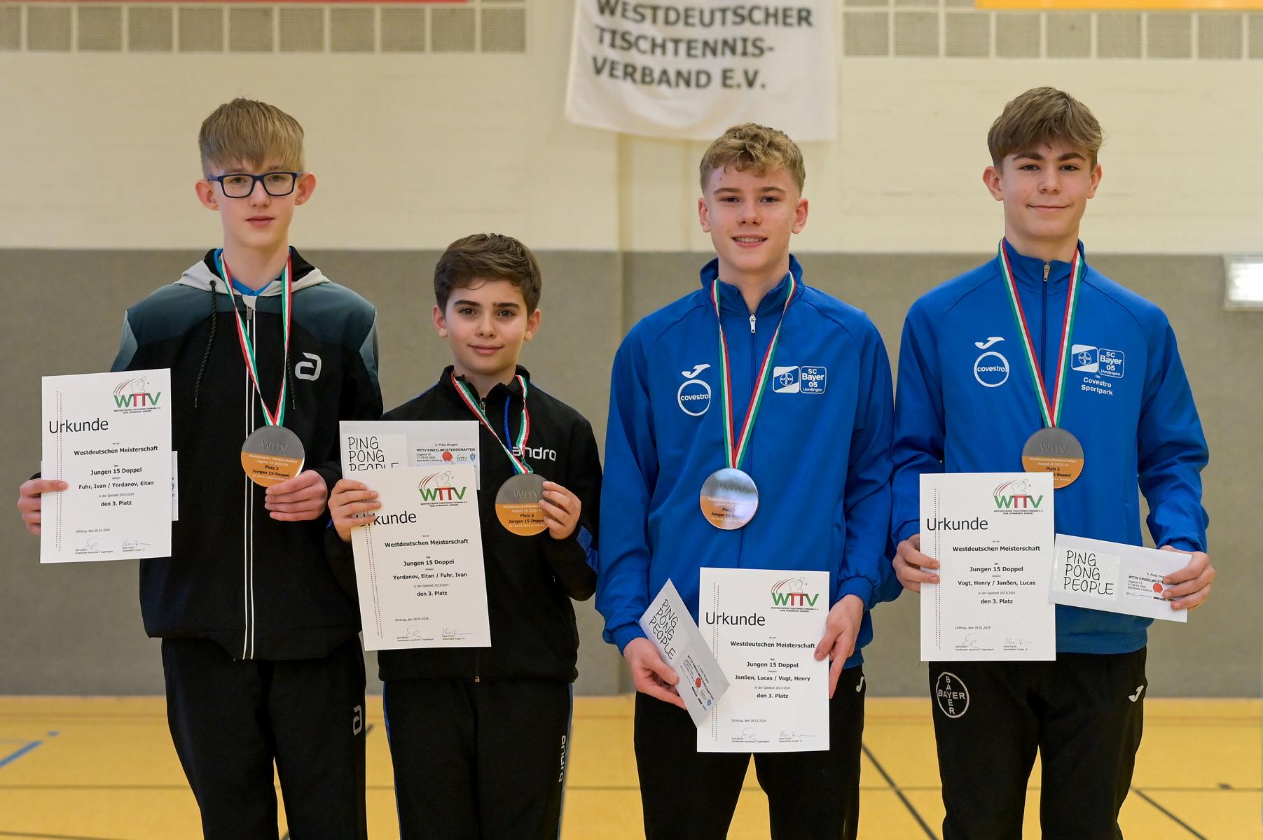 Im Doppelwettbewerb der Jungen erreichten mit Charlie Groninger/Rahdeen Haghighat (Burtscheider TV/1. FC Köln) und Finn Stockmann/Dominic van Steenwijk ( Spvgg. Meiderich 06/95/Anrather TK RW) ebenfalls die an Position eins und zwei gesetzten Paarungen das Finale. Nach verlorenem ersten Satz behielten Charlie und Rahdeen die Nerven, gewannen das Spiel mit 3:1 und damit den Titel des Westdeutschen Meisters Jungen-Doppel.