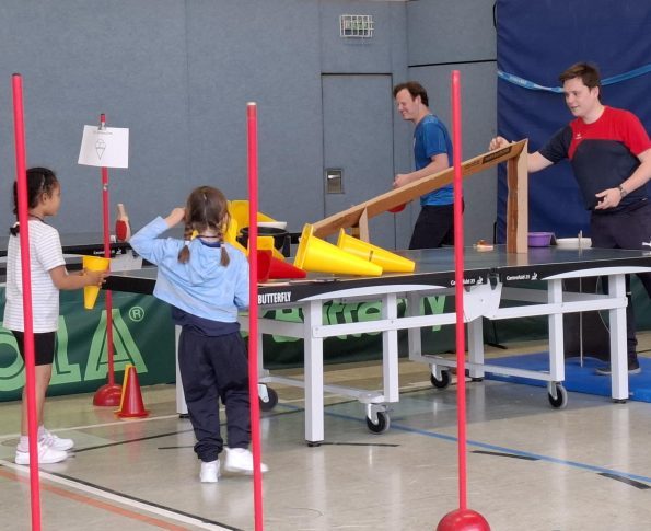 Ob „im Dschungel“, beim „Geister jagen“, „Pinguine retten“ oder der „Elefanten-Challenge“ – an jeder Station konnten die Kinder spielerisch erste Erfahrungen mit der Rückschlagsportart Tischtennis sammeln. Viele Übungen ließen sich wahlweise mit oder ohne Schläger absolvieren, sodass sich jedes Kind im eigenen Tempo herantasten konnte. Die Neugier siegte oft schnell – spätestens beim zweiten Versuch wollten die meisten Kinder es unbedingt mit dem Schläger ausprobieren. Auch richtige Tischtennistische kamen zum Einsatz und rundeten das Erlebnis ab.