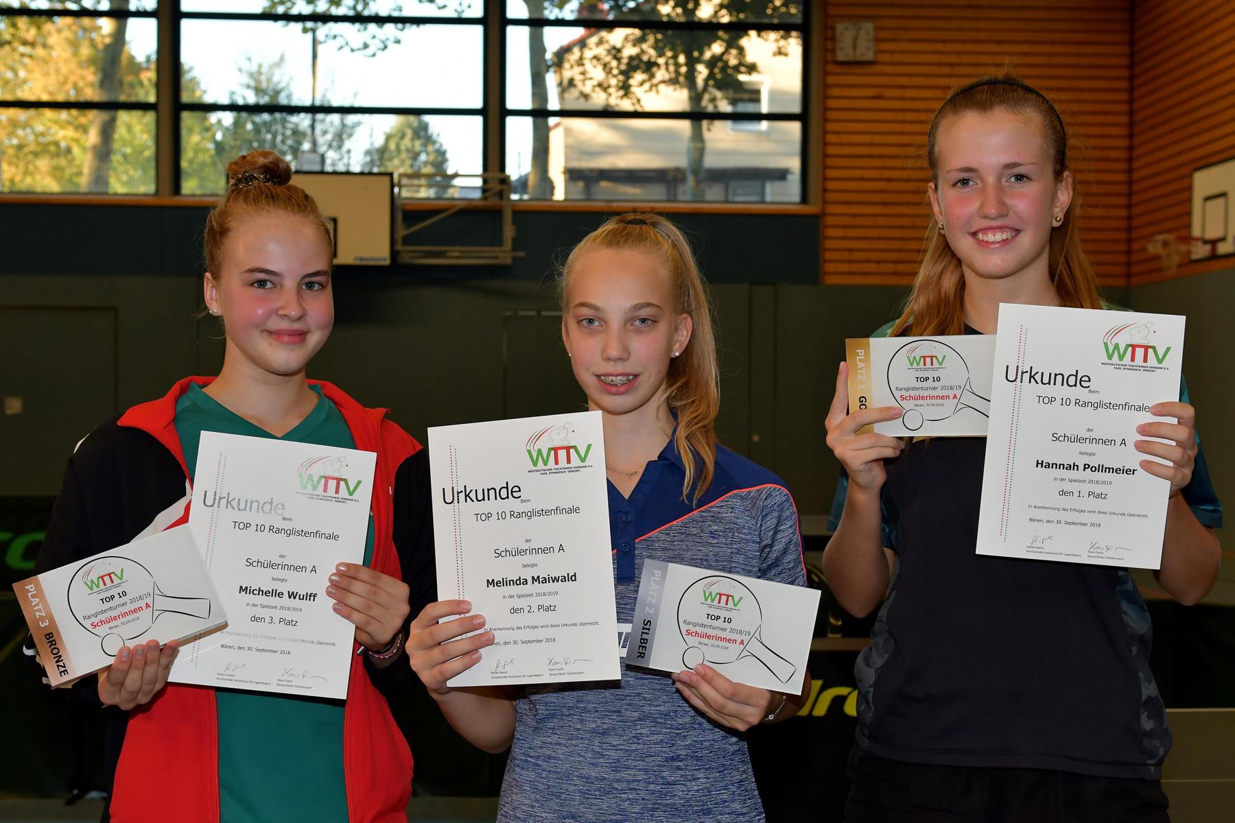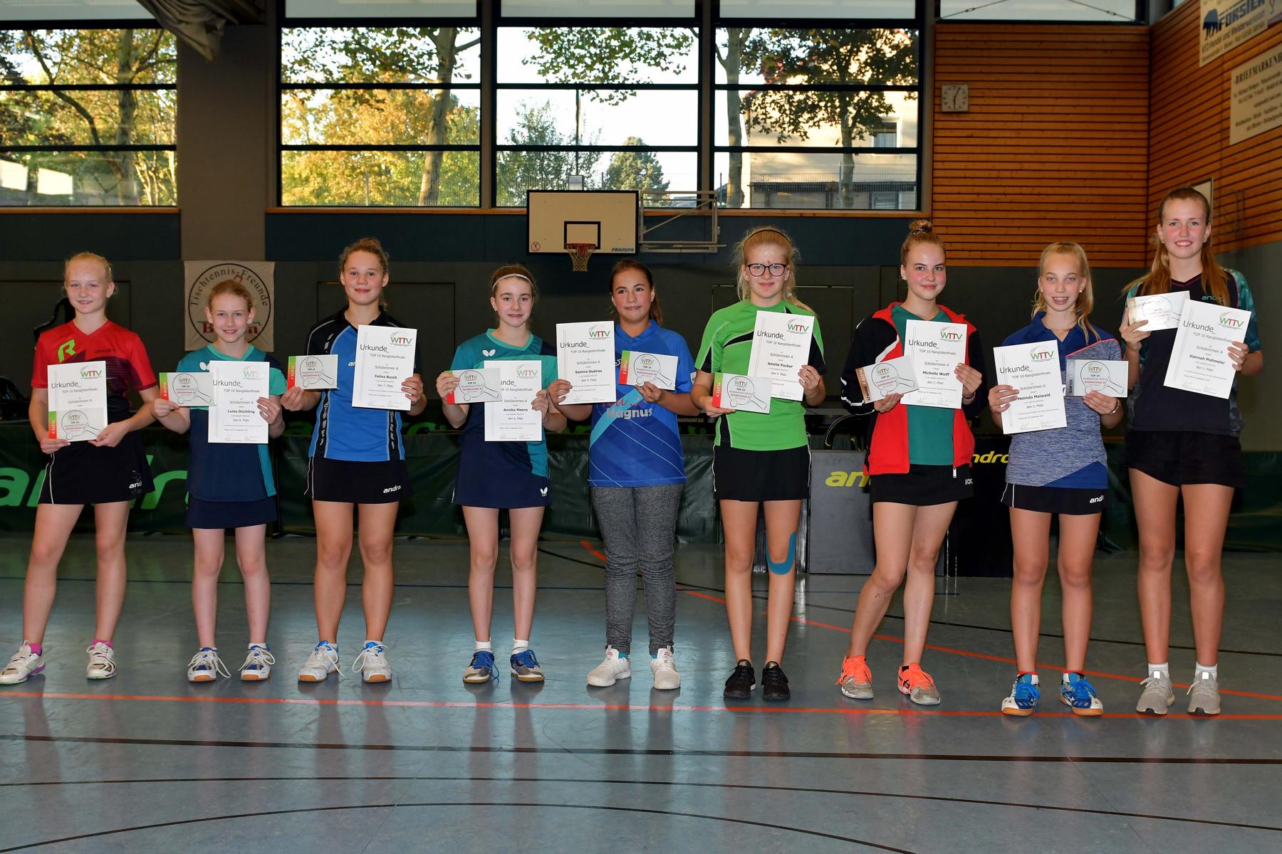 Bei den Schülerinnen konnte sich Hannah Pollmeier (TTV Hövelhof) vor ihrer Vereinskollegin Melinda Maiwald durchsetzen. Beide konnten damit die begehrten Tickets für das Bundesranglistenfinale Top 48 lösen. Direkt in der ersten Runde trafen sie aufeinander und zeigten eindrucksvoll, dass sie zu den Besten im Westen gehören. Mit 3:2 setzte sich nach einem spannenden und hochkarätigen Match Hannah durch. Dieser Sieg schenkte Hannah das notwendige Selbstvertrauen, um die nächsten Herausforderungen zu bestehen. Und diese ließen nicht lange auf sich warten. Michelle Wulff (DJK SR Cappel) sicherte sich mit 5:3 Spielen und dem besseren Satzverhältnis den dritten Platz vor Amelie Pucker (SV Bergheim). Jeweils vier Siege und vier Niederlagen standen zum Schluss für Samira Oudriss (TV Refrath) Annika Menns (Anrather TK) auf dem Turnierbogen und bedeuteten Platz fünf und sechs. Felina Busch (SC Fortuna Bonn) belegte mit 3:5 Spielen Platz sieben vor Luisa Düchting (TTG Langenich) und Katja Schütz (TSV Marienberghausen). Leider verletzte sich Medeea Grozav-Marcu (TuS Sundern) im Spiel gegen Felinda Busch so schwer, dass sie das Turnier abbrechen und sich in ärztliche Behandlung begeben musste. Auf diesem Wege wünschen wir ihr alles Gute und hoffen, dass sie bald wieder gesund ist.