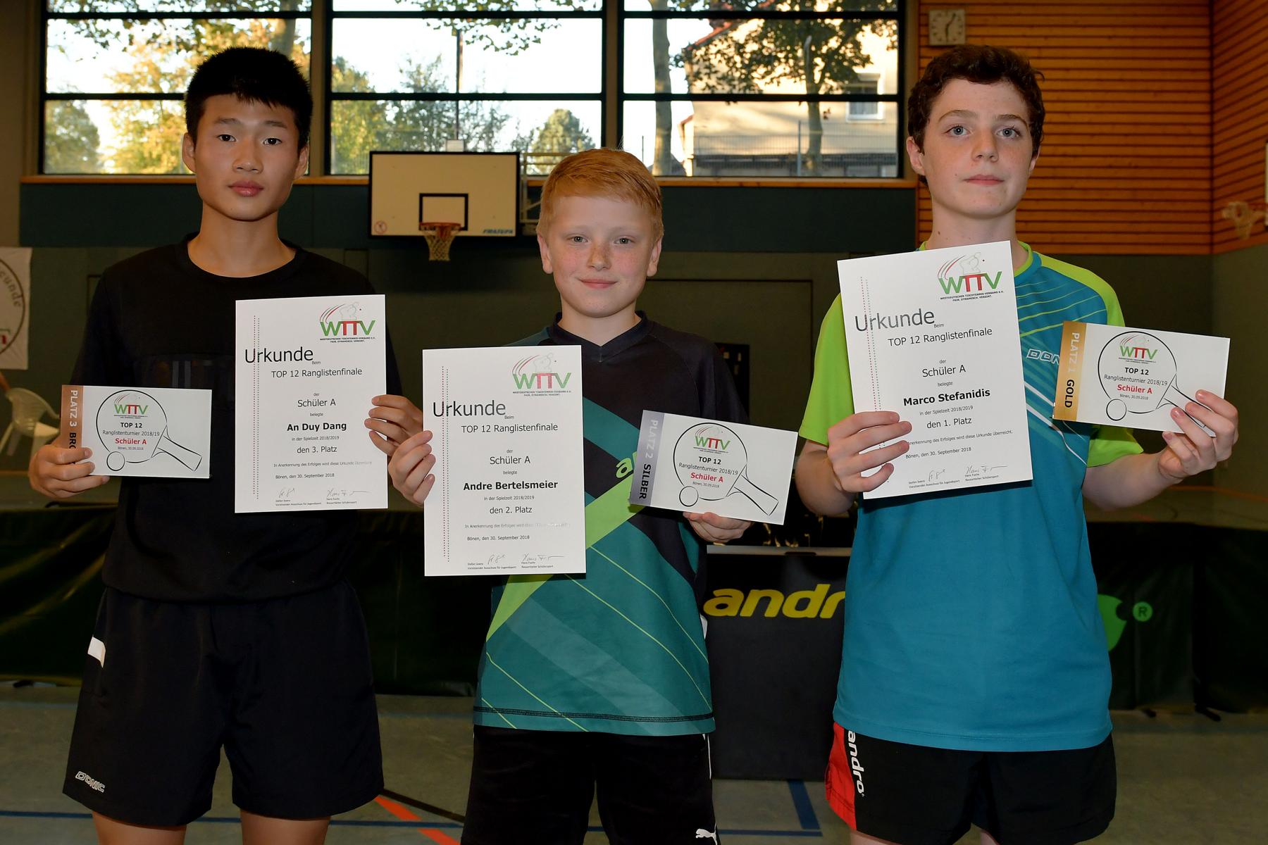 Die Tischtennisfreunde aus Bönen waren Gastgeber der WTTV Ranglistenturniere TOP 12/10 der Schüler/Innen A bei denen sich die Favoriten durchsetzen konnten. In den Gruppenspielen der Schüler zeigte besonders Marco Stefanidis (Heilingenhauser SV) mit einer Bilanz von 5:0, dass er zu den Favoriten gehört. Hinter Marco landeten Pascal Hong (Borussia Düsseldorf) und An Duy Dang (TTC Lövenich), Luc Lange (DJK BW Avenwedde), Tyson Tan Hasse (TTF Bönen) und Michael Kalaitzidis (Borussia Düsseldorf) auf den Plätzen zwei bis sechs.