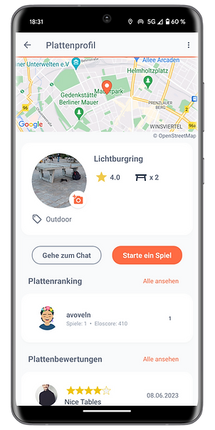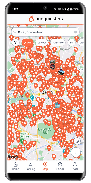 - Interaktive Karte: Entdecke Outdoor- und Indoor-Tische (Vereinsangebote) in deiner Nähe mit detaillierten Infos und Bewertungen.