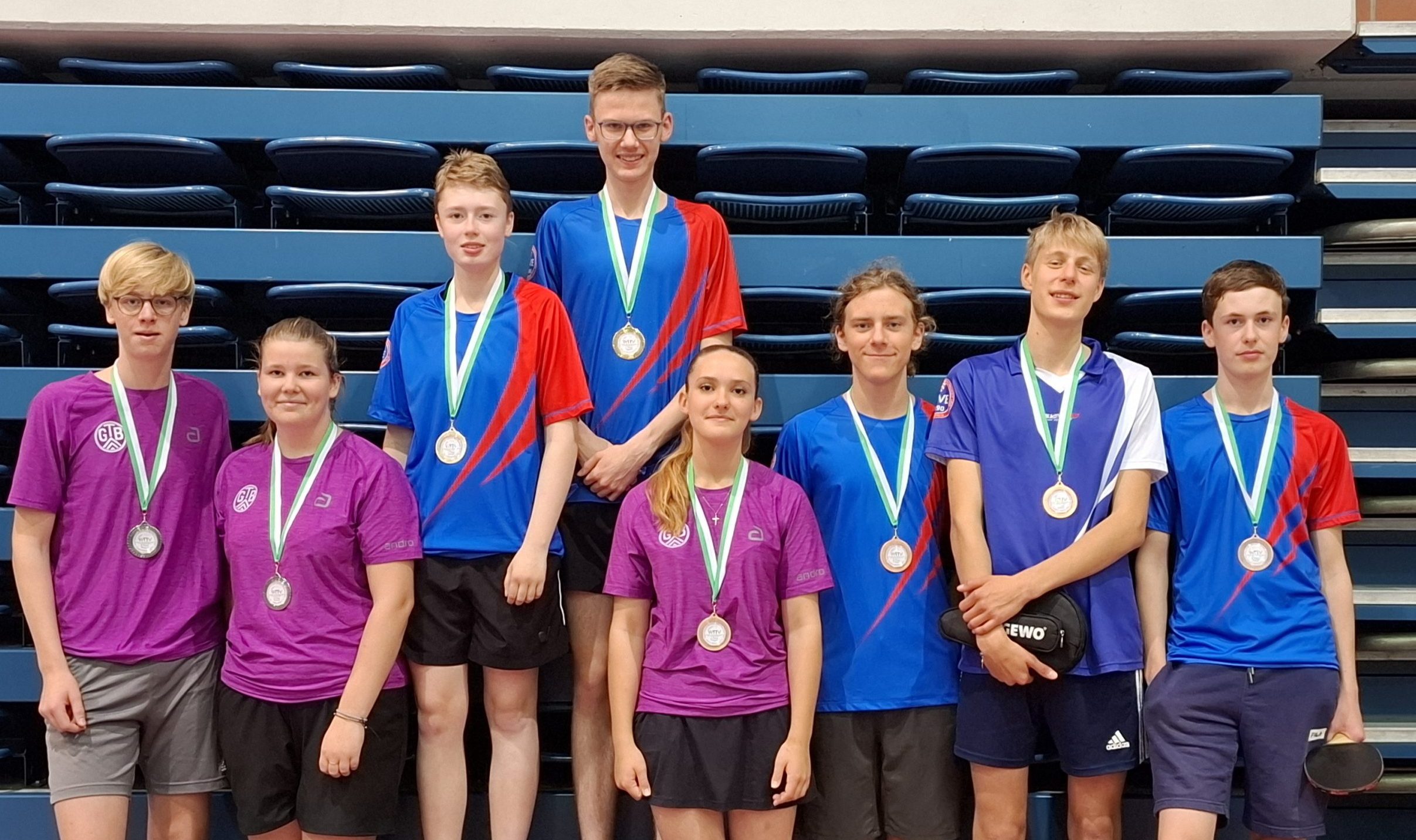 - Jugend 19 B Doppel (v.l.n.r.): Mattis Krössin, Anna Hornbruch (beide Gadderbaumer TV), Caren Neidhardt, Max Schneefuß (beide TSVE), Ylvi Oberste-Frielinghaus (Gadderbaumer TV), Niklas Philipp, Wanja Kosmala, Piet Meyer (alle TSVE)