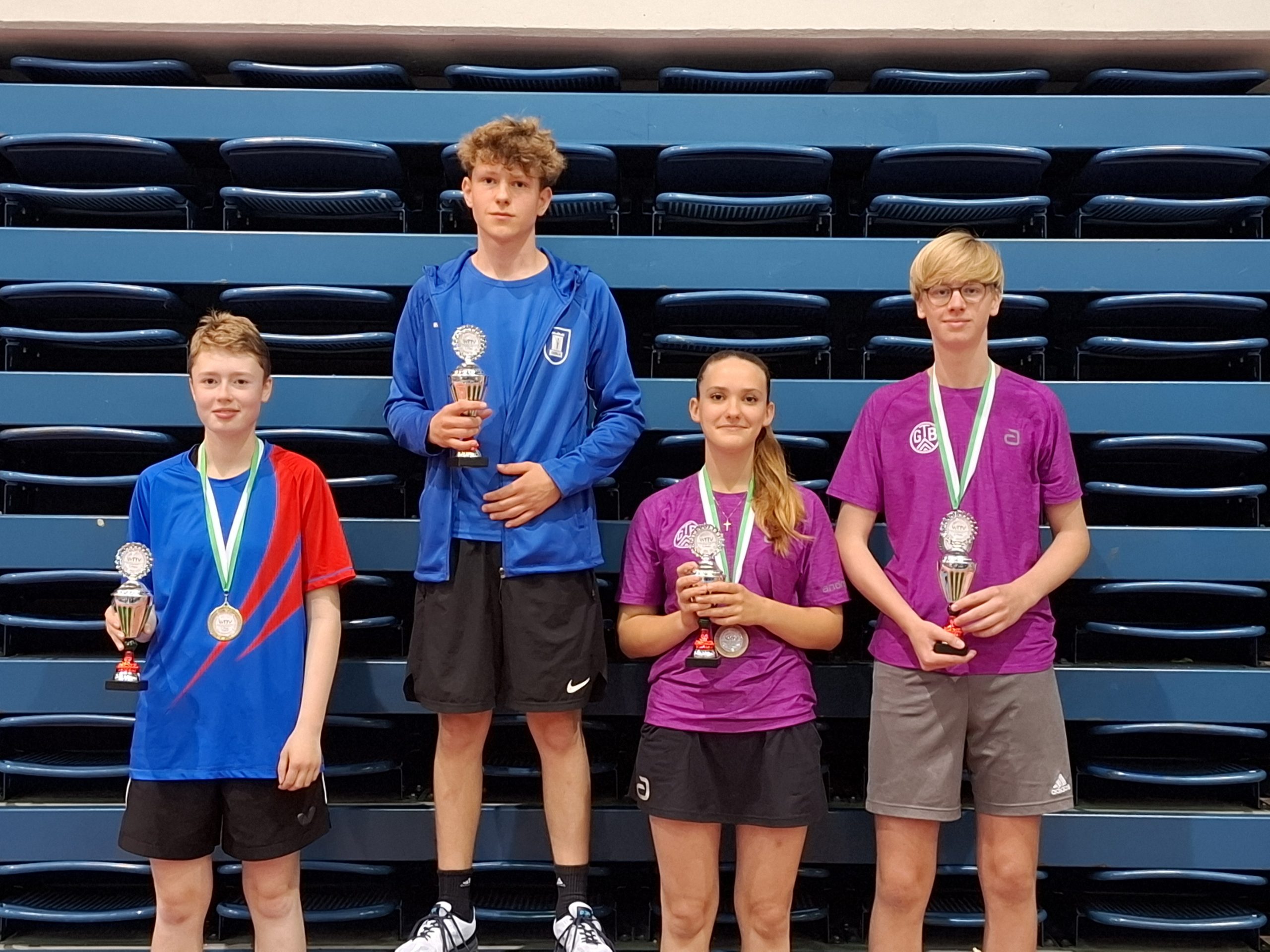 - Jugend 19 B Einzel (v.l.n.r.): Caren Neidhardt (TSVE), Jonathan Kükmann (TuS Quelle), Ylvi Oberste-Frielinghaus, Mattis Krössin (beide Gadderbaumer TV)