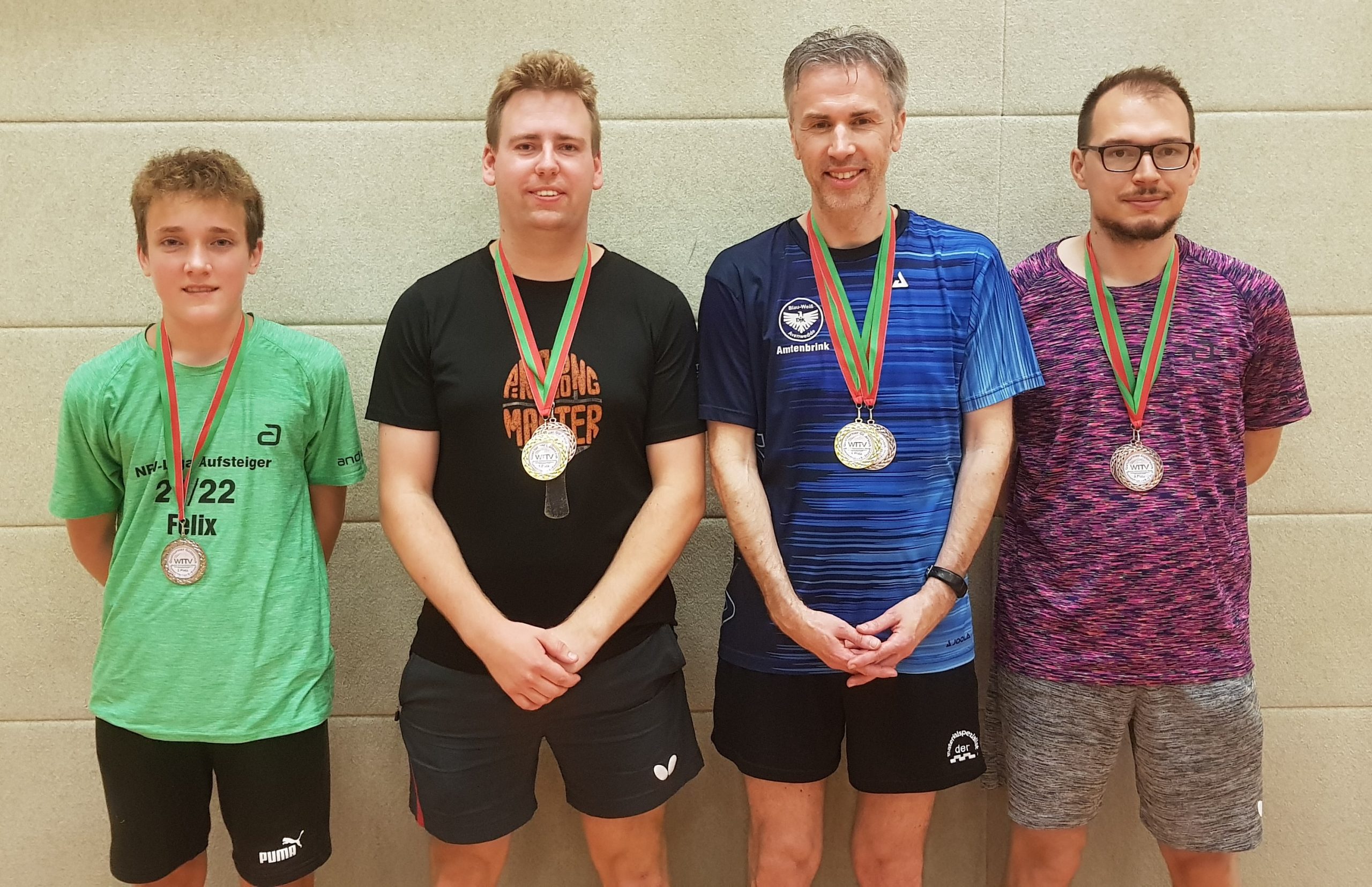 - Damen/Herren D Einzel: v.l. 2. Gerrit Feldmeier 1. Tim Großheimann, 3. Philipp Poppenborg und Luca Anton
