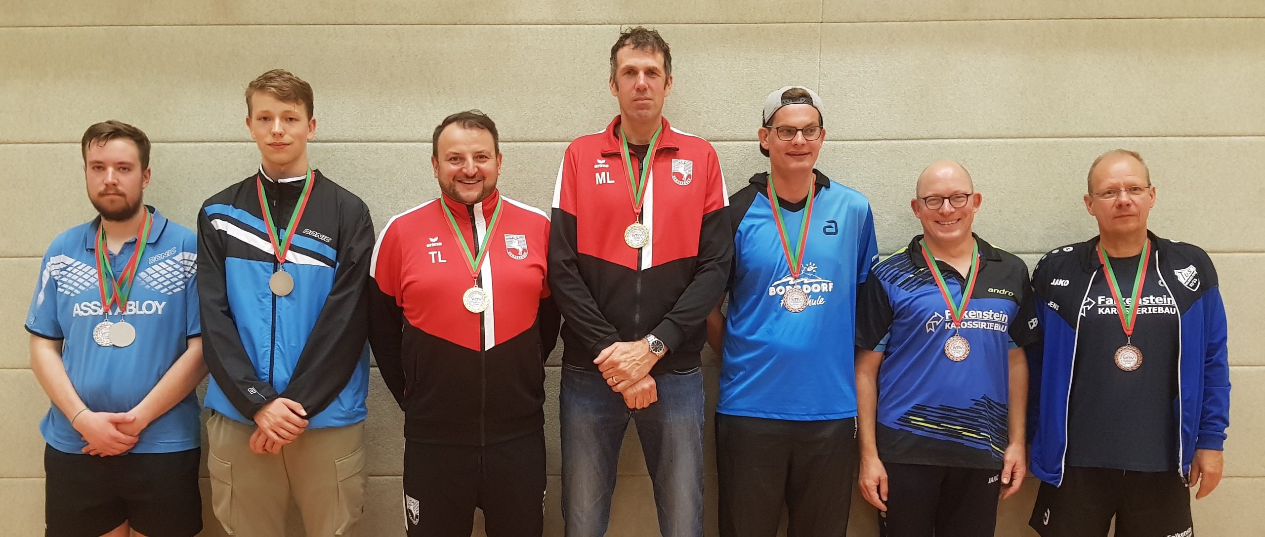 - Damen/Herren F Einzel: v.l. 2. Tobias Nickolaus, 1. Martin Schwarze, 3. Klaus Bornefeld und Aron Neitemeier