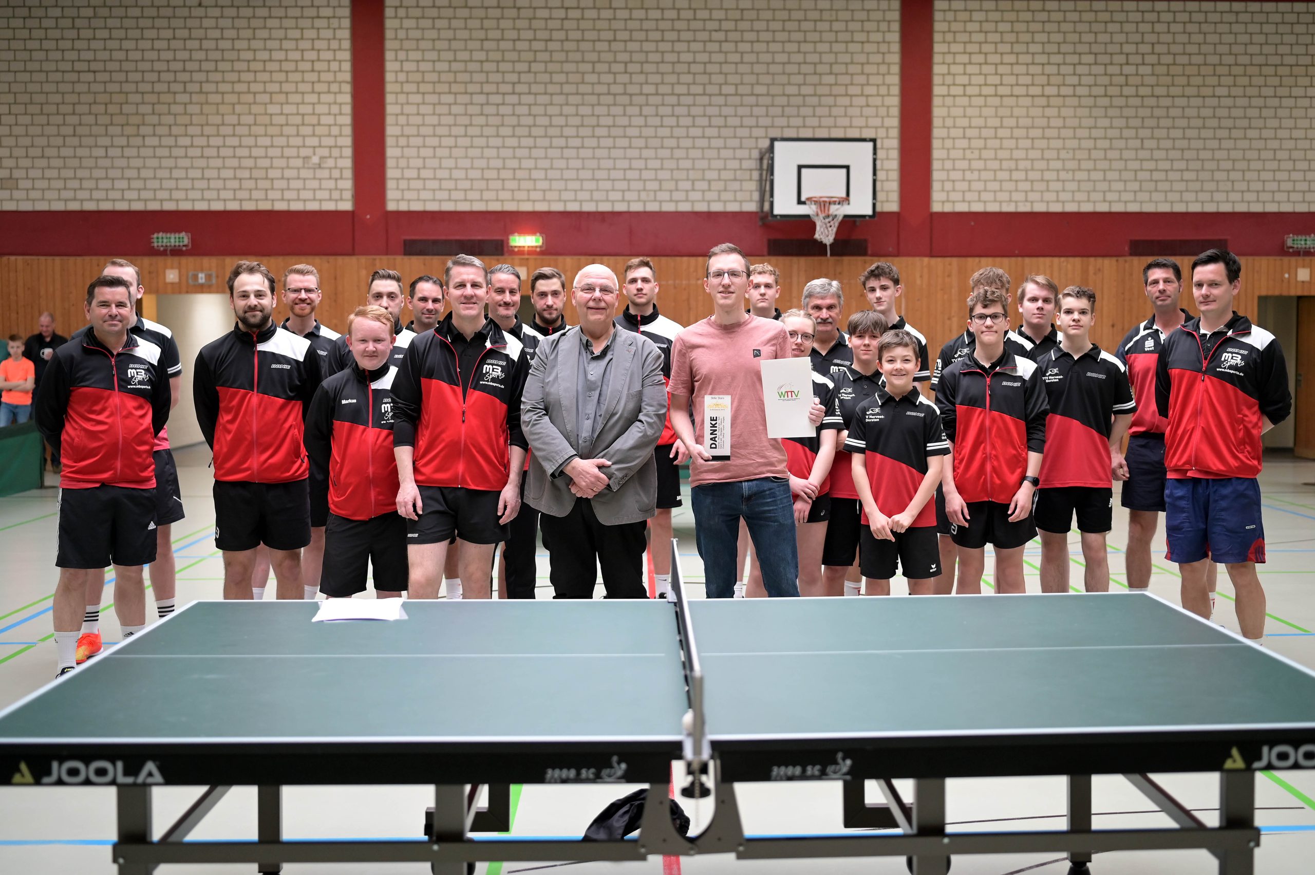 Robin Juste (Bildmitte), ein leidenschaftlicher und engagierter 28-Jähriger junger Mann, ist nicht nur ausgebildeter B-Lizenz-Trainer, sondern auch ein wertvolles Mitglied des TTV Hervest Dorsten.