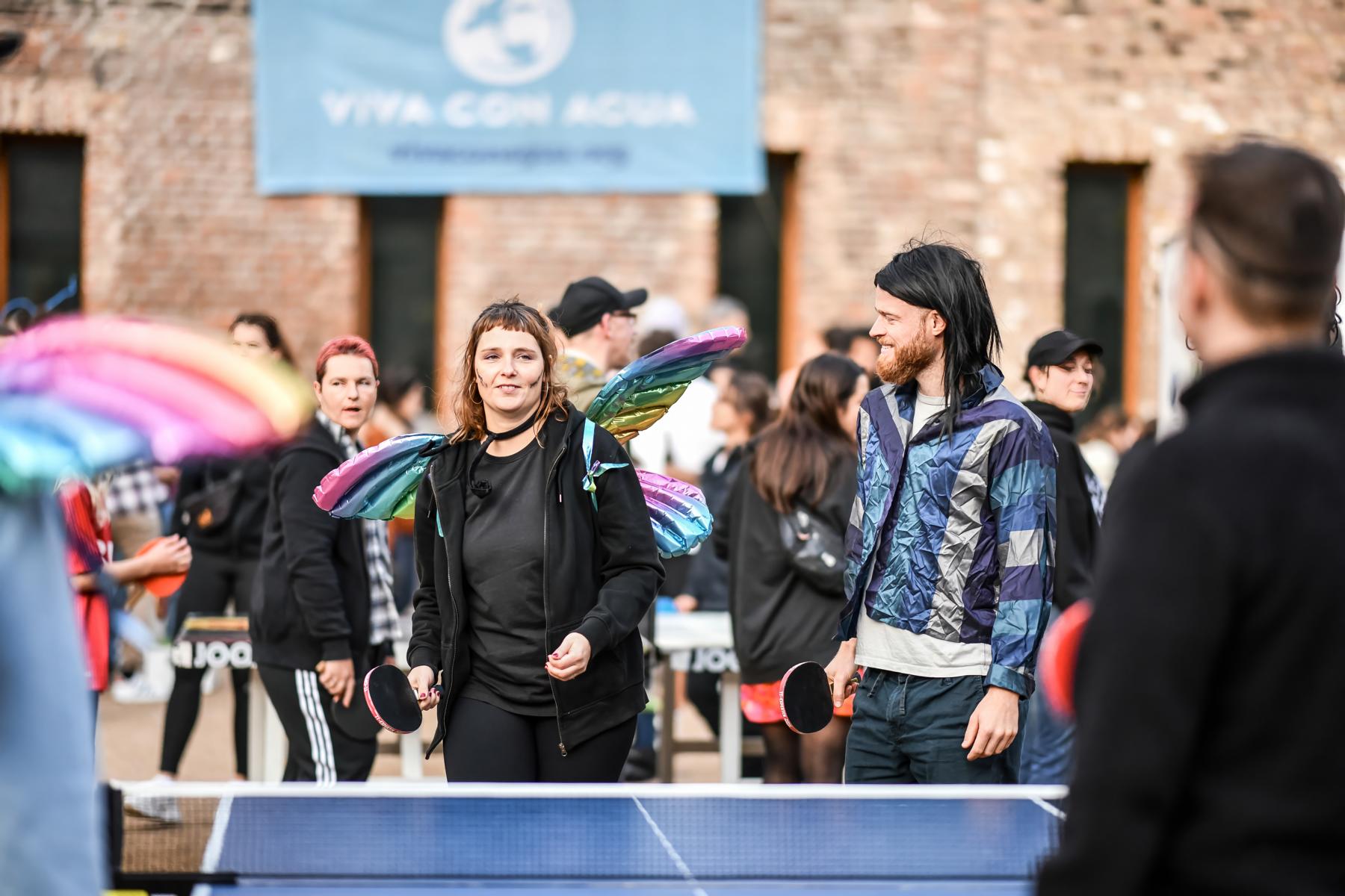 Viva con Agua setzt sich für die Verbesserung der Trinkwasser- und Sanitärversorgung im Globalen Süden ein. Dabei setzt der Verein auf jede Menge positiven Aktivismus und nutzt die universellen Sprachen Musik, Sport und Kunst bei seiner Arbeit im In- und Ausland. Integrative Arbeit findet dabei auf mindestens drei Ebenen statt: Zum einen durch die erwähnten Projekte im Globalen Süden, zum anderen durch die Gemeinschaft Viva con Agua, die multikulturell geprägt ist und im Fall der Tischtennis-Rundlauf-Turniere durch die Teilnahme von Menschen mit Migrationshintergrund oder Behinderung.