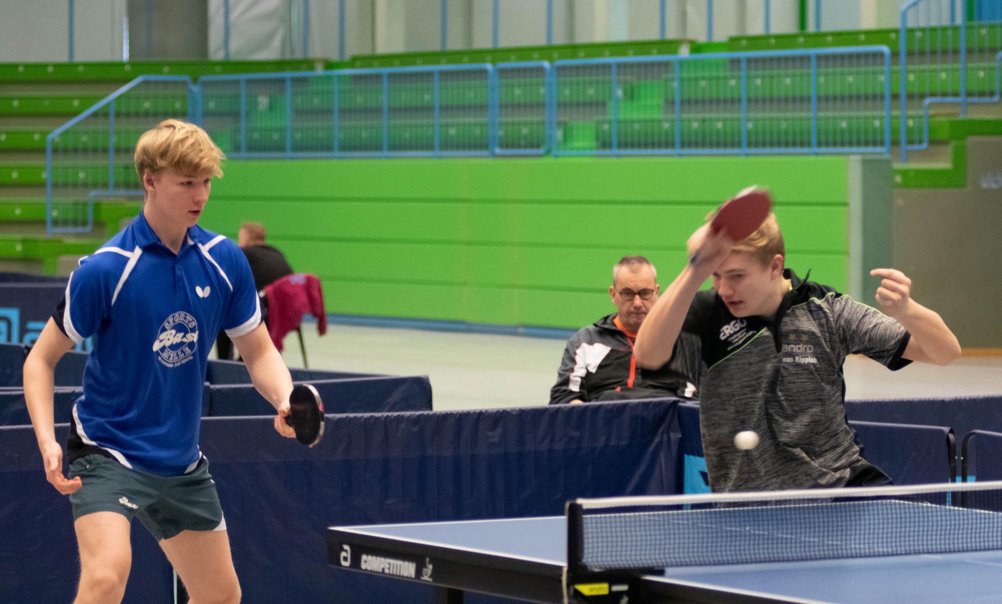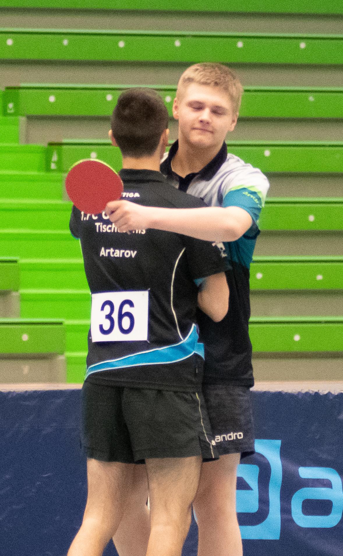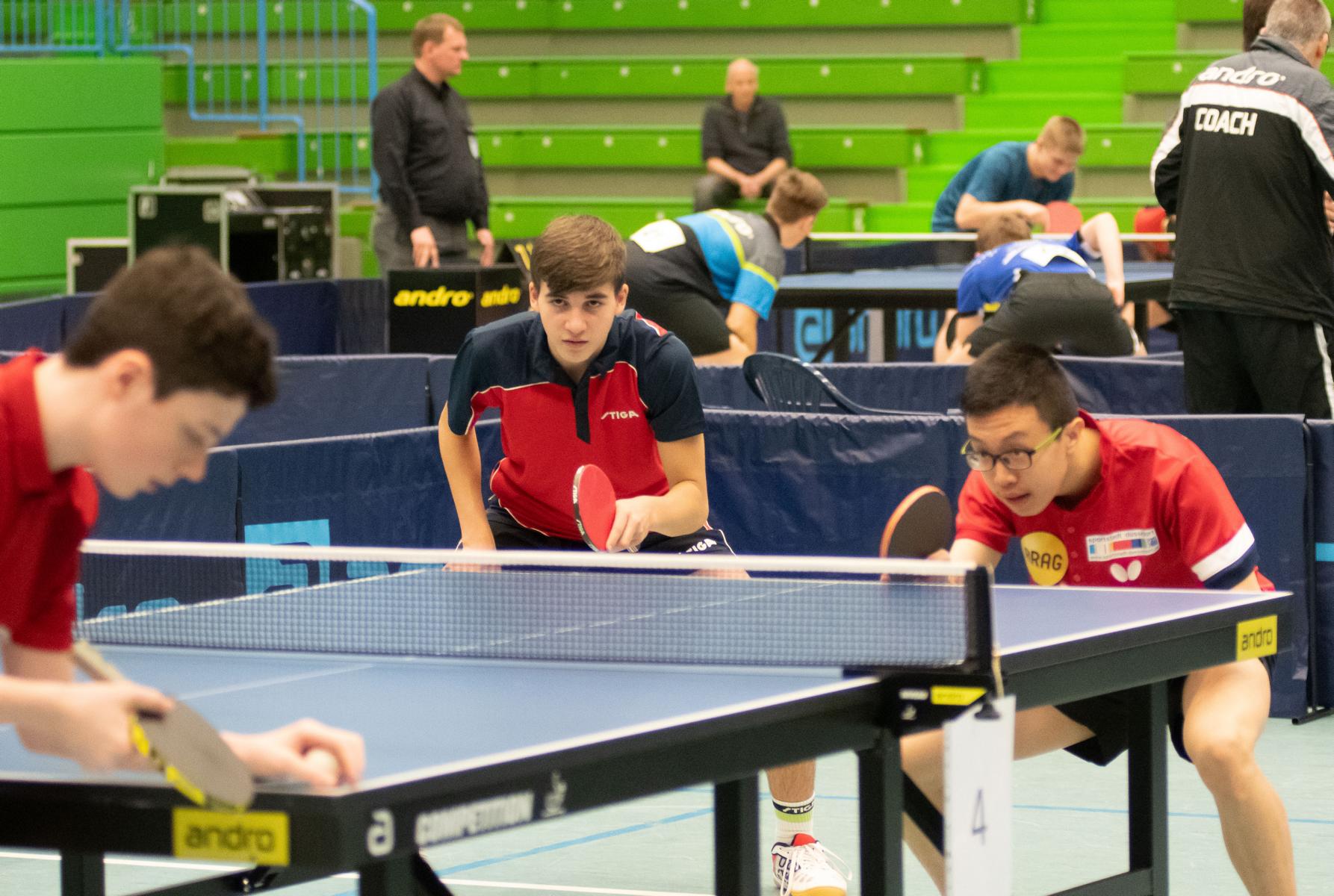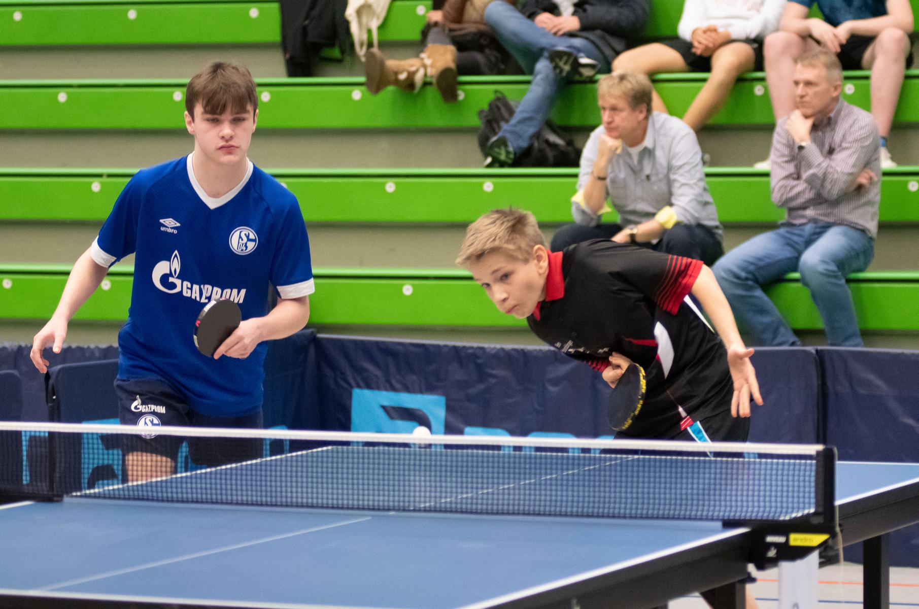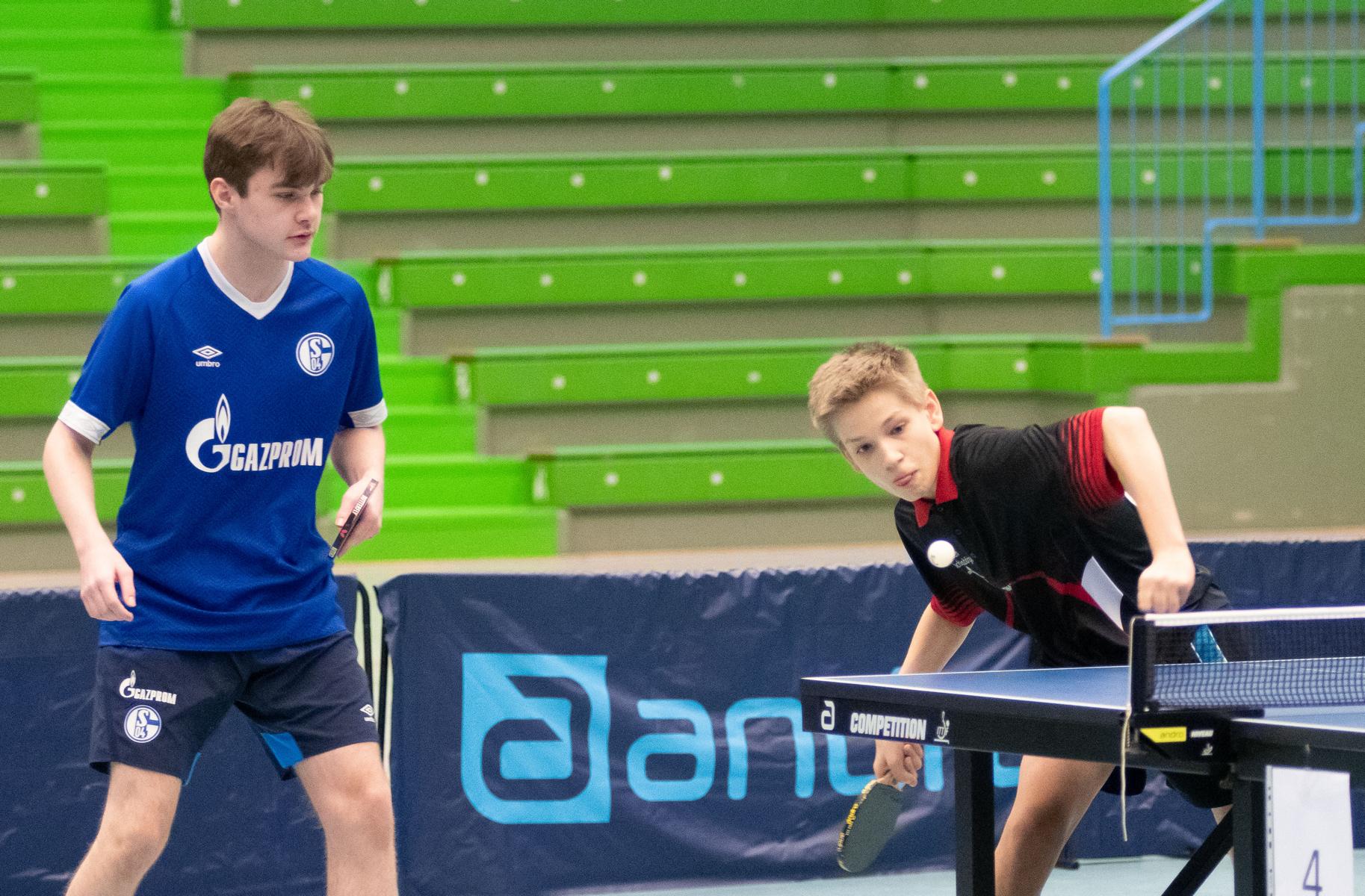 Auch die Sieger bei den Jungen Lukas Bosbach und Tim Artarov ließen ihrer Konkurrenz keine Chance, gaben lediglich einen Satz ab und holten sich verdient den Titel. Im Finale spielten sie etwas überraschend gegen die Paarung Ben Lechtenbörger und Lukas Karmann (1. FC Gievenbeck/1.FC Schalke), die im Halbfinale die favorisierten Düsseldorfer Schapiro/Guo Jiaxing deutlich mit 3:0 besiegten.