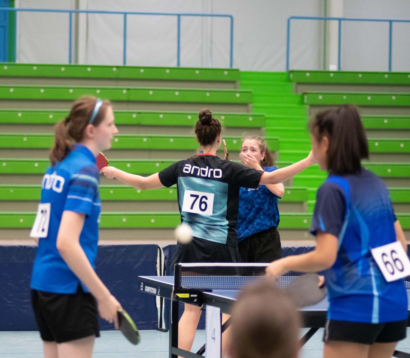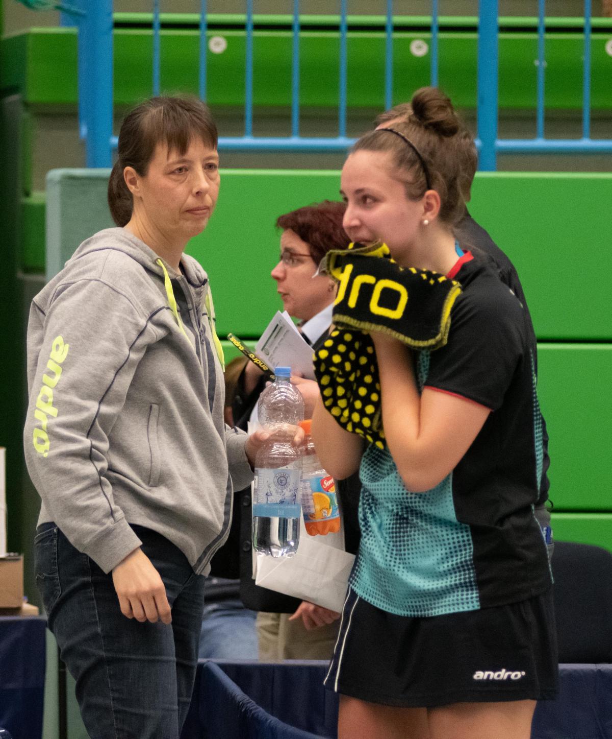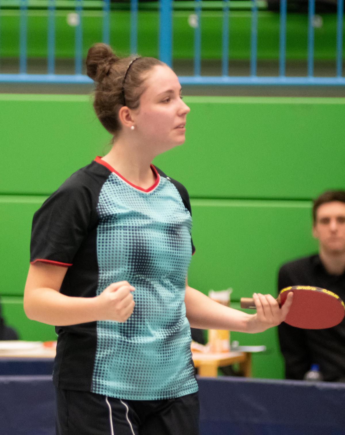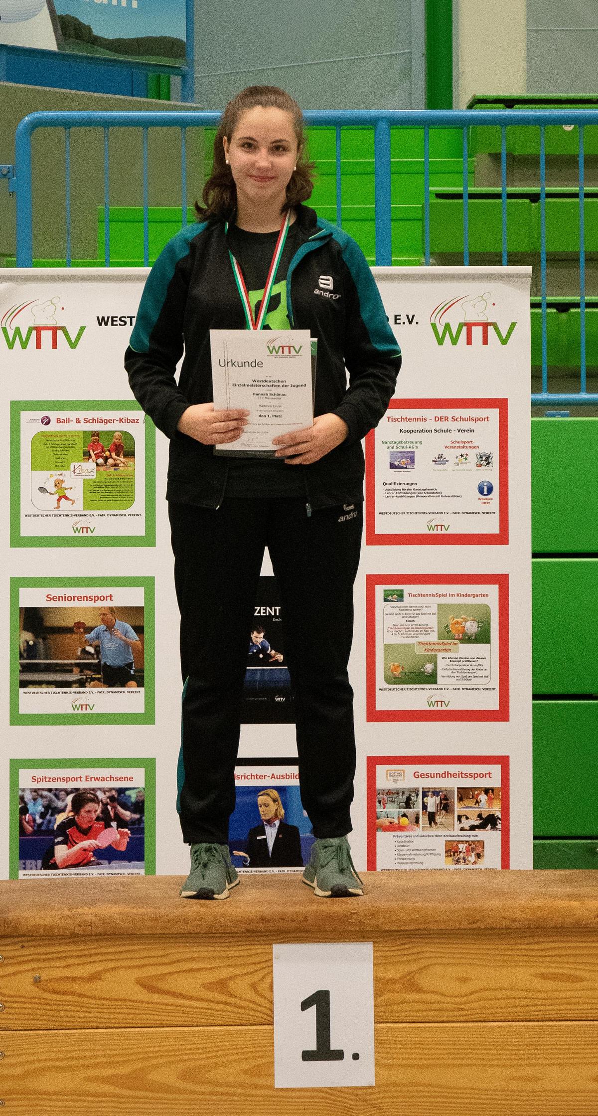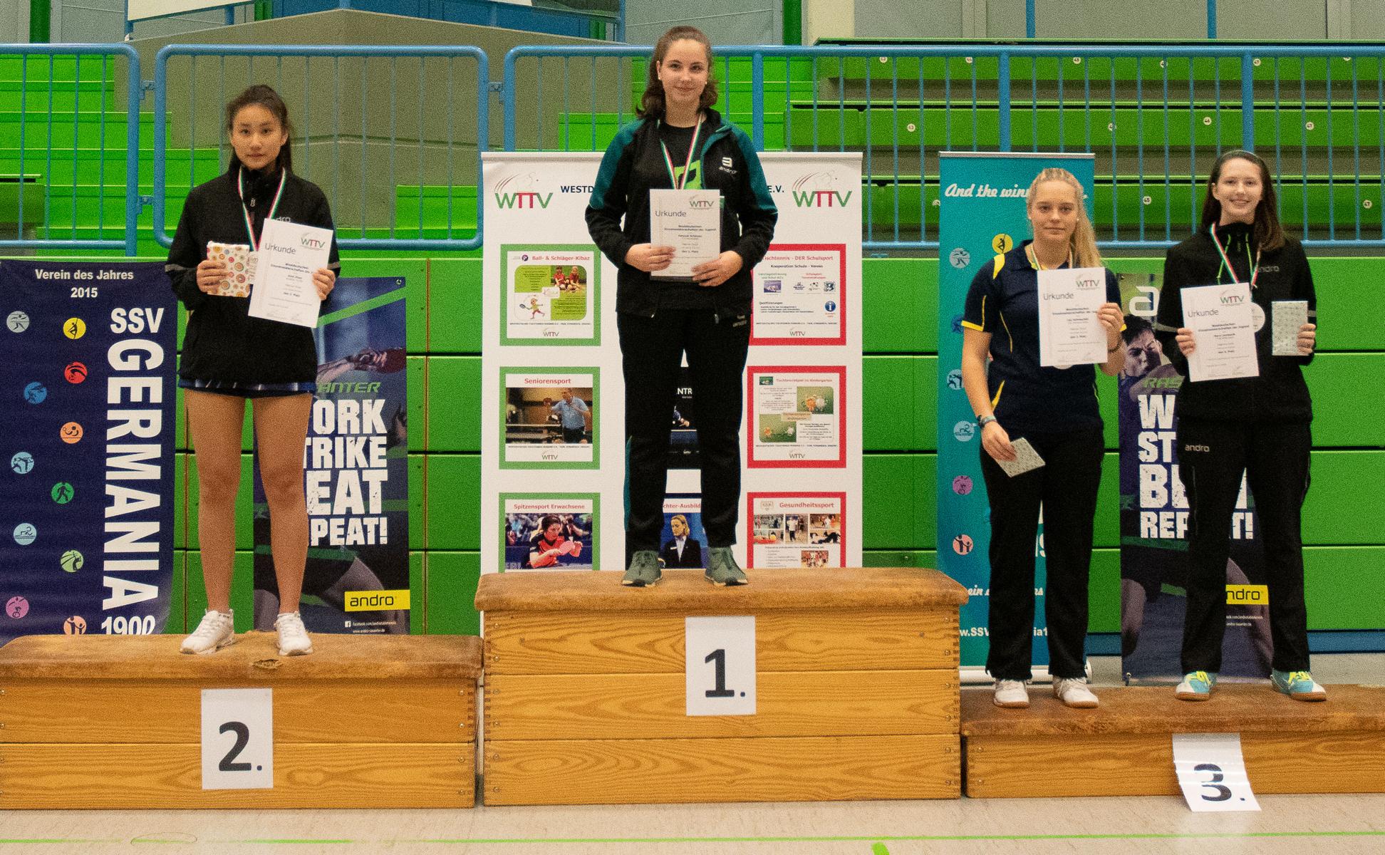 Auch in den Halbfinalspielen zeigte sich, wer an diesem Wochenende die beiden besten Spielerinnen waren, Hannah und Anni setzten sich relativ deutlich durch, lediglich Anni gab gegen ihre Doppelpartnerin Mara einen Satz ab. So kam es zum Finale der beiden topgesetzen Spielerinnen und es entwickelte sich das zu erwartende knappe Duell. Im entscheidenden fünften Satz führte Hannah bereits 7:4, ehe Anni nach einer Auszeit den Anschluss wieder herstellte. Beim Stand von 9:9 hatte Hannah dann aber die besseren Nerven und konnte sich die nächsten zwei Punkte sichern und wurde damit zum ersten Mal Westdeutsche Meisterin bei den Mädchen.